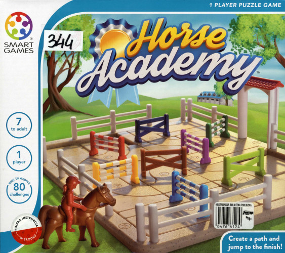 Zawartość pudełka: 1 instrukcja w języku polskim, 1 instrukcja w wielu językach, 1 broszura z zadaniami: 64 strony, 1 plastikowa plansza, 1 brama wyjściowa, 10 płytek z przeszkodami, 1 koń z jeźdźcem, 1 karta z naklejkami.