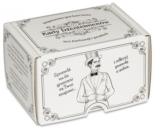 Karty Dżentelmenów to imprezowa gra towarzyska bez kurtuazji i pruderii, za to z ogromną dawką czarnego humoru. Dżentelmeńskie rozgrywki z pewnością urozmaicą każde spotkanie w gronie błyskotliwych i obdarzonych niebywałym poczuciem humoru osób. Nie powinno jej zabraknąć na Twojej imprezie!