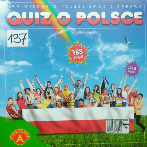 Zawartość pudełka: instrukcja, plansza, notes, katapulta, 2 kulki, kubek, klepsydra, kostka, 4 pionki,80 żetonów, 110 kart (97 kart pytań i odpowiedzi, 12 kart liter, 1 karta z nazwami działów).