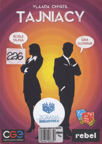 Zawartość pudełka: instrukcja, klepsydra, podstawka, 200 kart z kryptonimami, 25 kafelków postaci: 8 czerwonych agentów, 8 niebieskich agentów, kafelek podwójnego agenta (po obu stronach inny kolor), 7 beżowych kafelków niewinnych obserwatorów, czarny kafelek zabójcy, 40 kwadratowych kart kluczy.