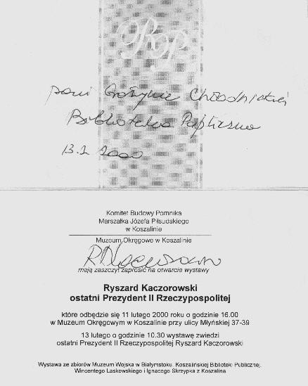 13 lutego w Muzeum Okręgowym w Koszalinie prezentowana była wystawa zbiorów Muzeum Wojska Polskiego w Białymstoku, Koszalińskiej Biblioteki Publicznej, Wincentego Laskowskiego i Ignacego Skrzypka z Koszalina pt.: „RYSZARD KACZOROWSKI ostatni PREZYDENT II RZECZYPOSPOLITEJ”. W uroczystym otwarciu wystawy uczestniczyli Dyrektor Andrzej Ziemiński i Grażyna Chłodnicka - Kierownik Działu Komputeryzacji Procesów Bibliotecznych Koszalińskiej Biblioteki Publicznej.