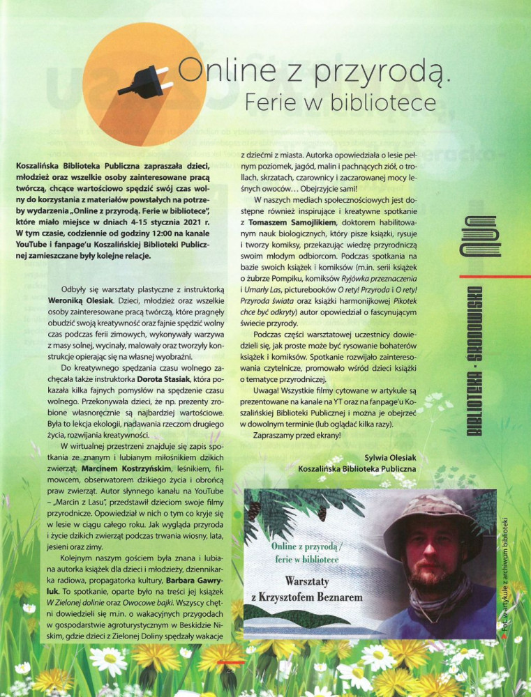Działania Koszalińskiej Biblioteki Publicznej zostały po raz kolejny docenione! Miesięcznik „Poradnik bibliotekarza” rekomenduje w najnowszym swoim numerze 3/2021 materiały KBP powstałe na potrzebę wydarzenia „Online z przyrodą. Ferie w bibliotece”. Tych, którzy nie skorzystali jeszcze z naszej oferty zapraszamy przed ekrany. Wszystkie filmy dotyczące tego tematu są dostępne na kanale YT Koszalińskiej Biblioteki Publicznej. W ofercie: warsztaty o tematyce przyrodniczej z Dorotą Stasiak, Weroniką Olesiak, Krzysztofem Beznarem. Spotkania autorskie z Tomaszem Samojlikiem oraz Barbarą Gawryluk. Filmy przyrodnicze autorstwa Marcina Kostrzyńskiego.