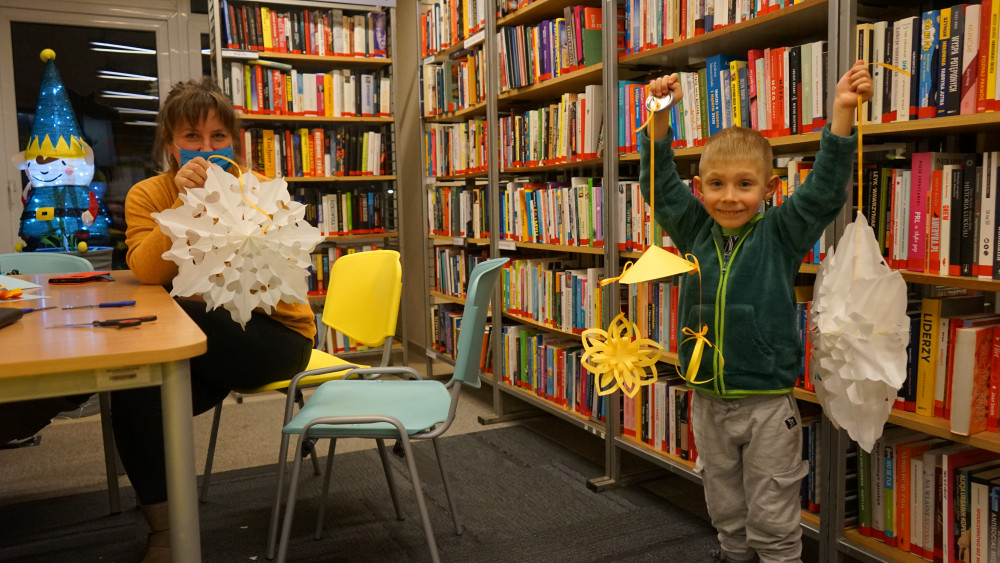 Dla najmłodszych uczestników Nocy w Bibliotece przygotowaliśmy także pokaz filmowy z zimowymi bajkami, na którym można było zobaczyć m.in. Żubra Pompika i Wikinga Tappi. Dodatkowo dzieci tworzyły bałwanki na warsztatach ceramicznych, zegary ze starych płyt winylowych oraz ozdoby choinkowe z papieru w warsztacie elfów św. Mikołaja.