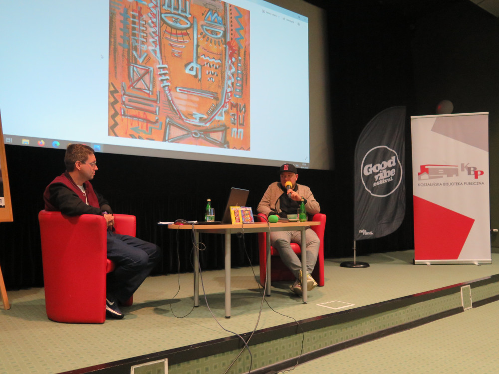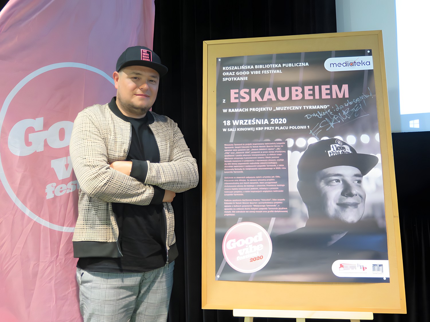 Dzięki współpracy Koszalińskiej Biblioteki Publicznej z Good Vibe Festival, 18 września 2020 r. gościliśmy u siebie Bartłomieja Skubisza znanego jako "Eskaubei", lidera zespołu Eskaubei & Tomek Nowak Quartet, pomysłodawcę projektu "Muzyczny Tyrmand", który łączy w sobie literaturę, muzykę i sztukę wizualną. Spotkanie poprowadził Mateusz Prus. W czasie rozmowy, nie zabrakło muzyki oraz prezentacji grafiki dedykowanej projektowi. Nasz gość, entuzjasta twórczości Tyrmanda, zachęcał do czytania książek tego nietuzinkowego pisarza.