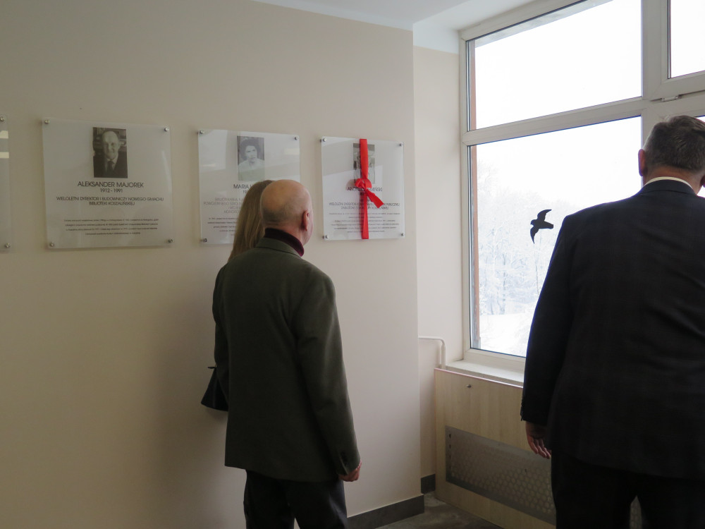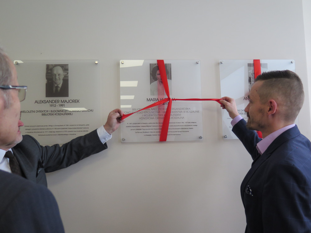 Tablicę pana Aleksandra Majorka (1912-1991) – wieloletniego, zasłużonego dyrektora i budowniczego nowego gmachu biblioteki koszalińskiej, odsłonili: Prezydent Miasta p. Piotr Jedliński i córka oraz wnuczka Uhonorowanego pp. Krystyna Staśkiewicz i Agnieszka Staśkiewicz-Koperwas