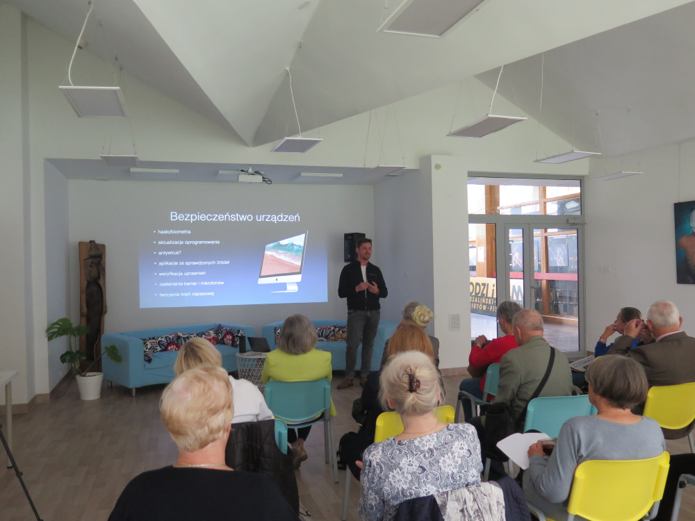 Następnie seniorzy, w ramach warsztatu "Bezpieczny Senior w Sieci", prowadzonego przez Macieja Zychowicza, mieli okazję porozmawiać o zagrożeniach czyhających w Internecie oraz o sposobach na ich unikanie.