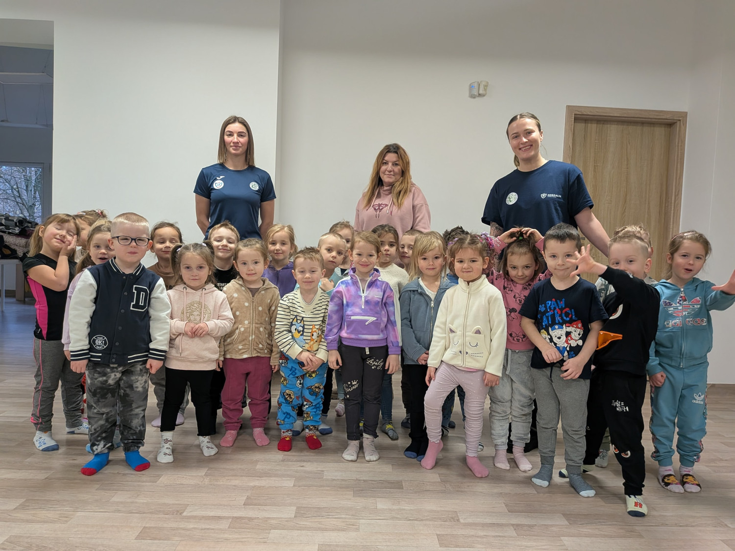 Nasz dzień zaczął się bardzo energicznie bo KBP odwiedziły Piłkarki Ręczne z klubu Piłka Ręczna Koszalin oraz grupa Kotków z przedszkola nr 7 w Koszalinie. Dzieci wysłuchały książeczki pt. ,,Moja pasja. Piłka nożna” Pawła Gierlińskiego. Książka zachęca do uprawiania sportu i odkrywania swoich pasji oraz uczy współpracy w zespole. Następnie odbyły się zajęcia sportowe, które poprowadziły Beata Naumczyk oraz Oleksandra Furmanets.