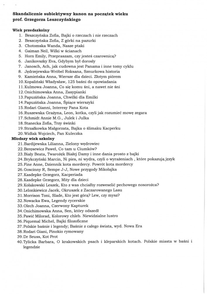 W tej powodzi nowych książek bardzo potrzebujemy przewodnika, mistrza, który nas „suchą nogą” przeprowadzi przez ten gąszcz. Taką rolę spełniają blogi literackie, profile fejsbukowe, bibliotekarze. Ja proponuję na przewodnika, literaturoznawcę, specjalistę od literatury dziecięcej i młodzieżowej prof. Grzegorza Leszczyńskiego w Uniwersytetu Warszawskiego. W jego książce pt. „Magiczna biblioteka. Zbójeckie księgi młodego wieku” znajdziemy wiele intrygujących spostrzeżeń, śmiałych tez, diagnoz i subiektywny kanon literatury dla młodych, która nie pozostawi nas obojętnymi. Autor wytyka dorosłym „ugrzecznianie” literatury dla młodych. Kpi z pozbawiania lektur dziecięcych wszelkich złych emocji, co skutkuje np. „wilkiem tańczącym z babcią, myśliwym i Czerwonym Kapturkiem” albo wysłanym na resocjalizację do zoo.