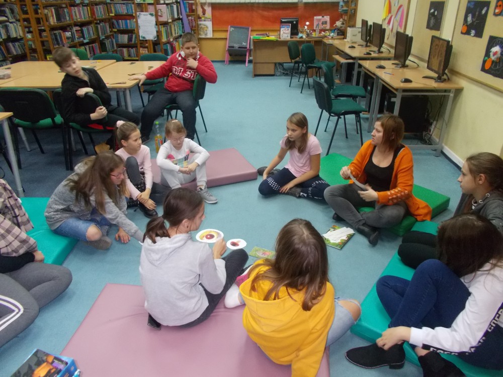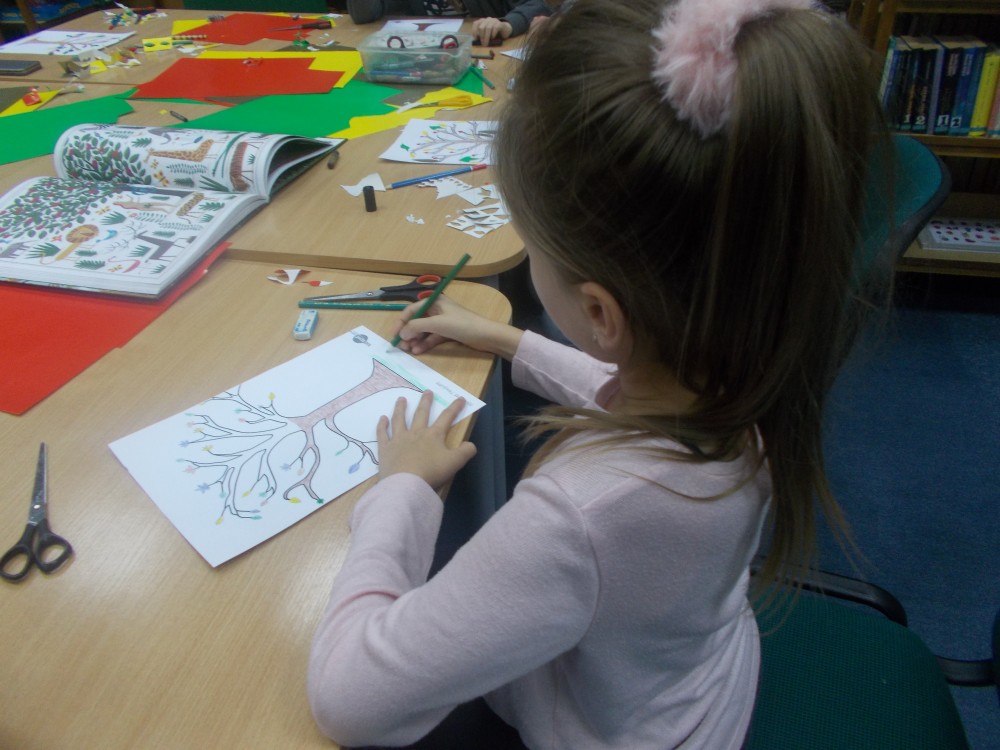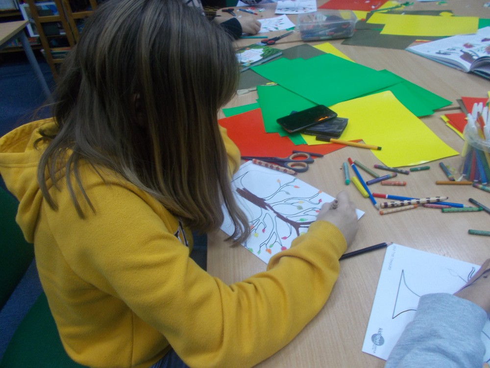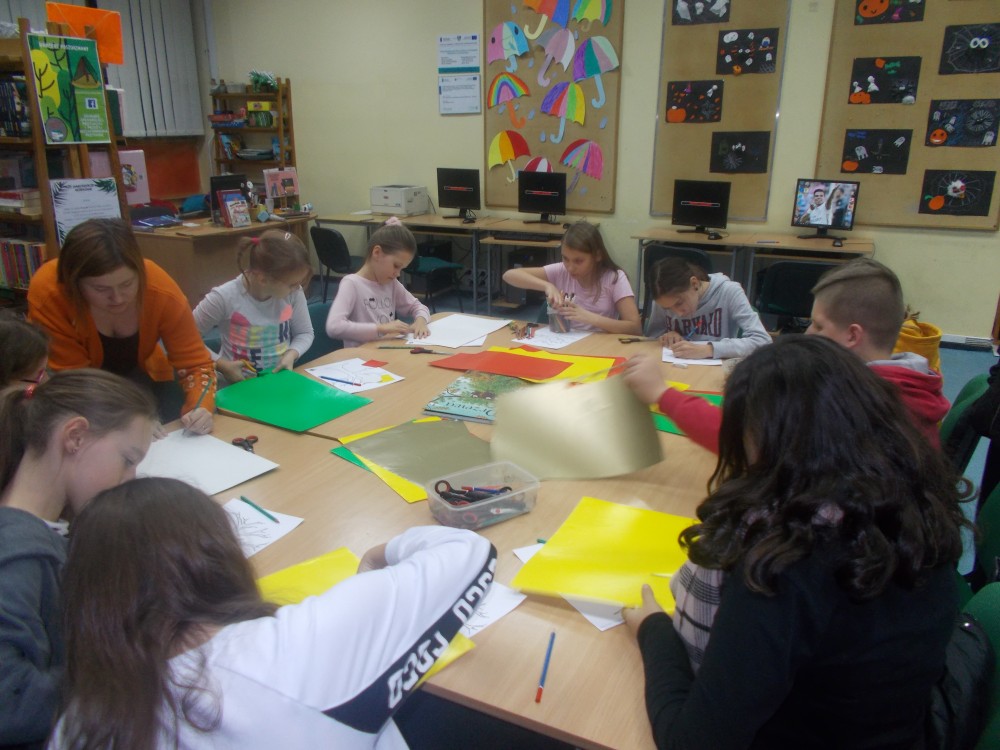 Jesień kojarzy nam się z kasztanami, kolorowymi liśćmi, kubkiem ciepłej herbaty i dobrą książka, dlatego anglomaniacy, oprócz tradycyjnego poznawania słownictwa związanego z tą porą roku, wysłuchali typowo jesiennego opowiadania. Wybór padł na książkę autorstwa Ludwiga Hellmana ze zbioru „Opowieści o małej jabłonce. Jak drzewko stało się drzewem” pt. „Ponure myśli” o tym, jak ważne jest mieć w życiu cel, do którego się dąży. By pocieszyć małą jabłonkę, dzieci stworzyły portrety drzew z kolorowymi liśćmi, które znacząco poprawiają nastrój i pozwalają pozbyć się chandry. Po zajęciach plastycznych przyszedł czas na ulubioną zabawę dzieci 3-6-9 ale..... tym razem po angielsku.