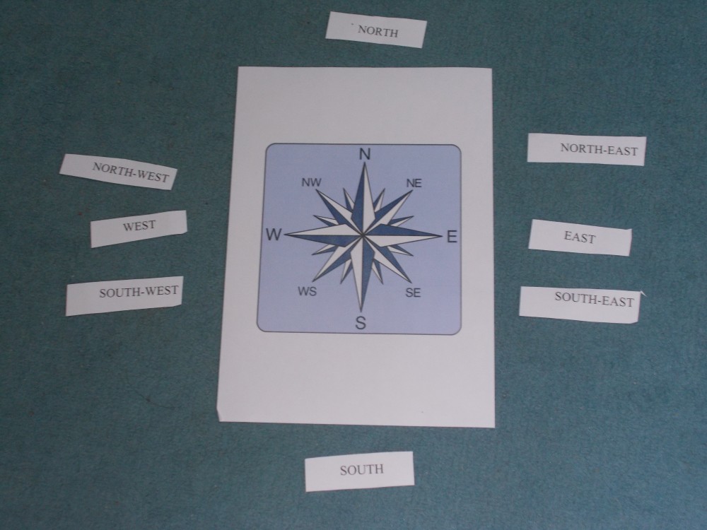 Na wspomnianym przyrządzie służącym do wyznaczania kierunków znajdują się następujące symbole: N, S, W, E, NW, NE, SW, SE. Określają one nic innego, jak angielskie nazwy odpowiedników ośmiu stron świata: N- north- północ, S- south- południe, W- west – zachód, E- east – wschód, NW- north-west -północny-zachód, NE- north-east- północny- wschód, SW- south-west- południowy- zachód oraz SE- south-east - południowy- wschód.