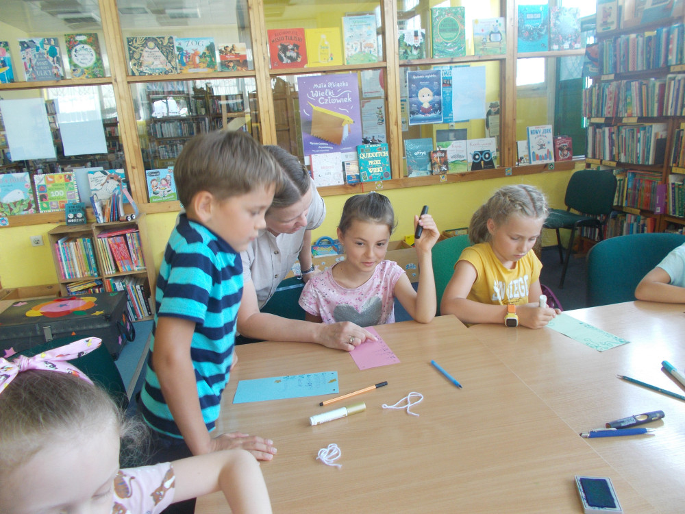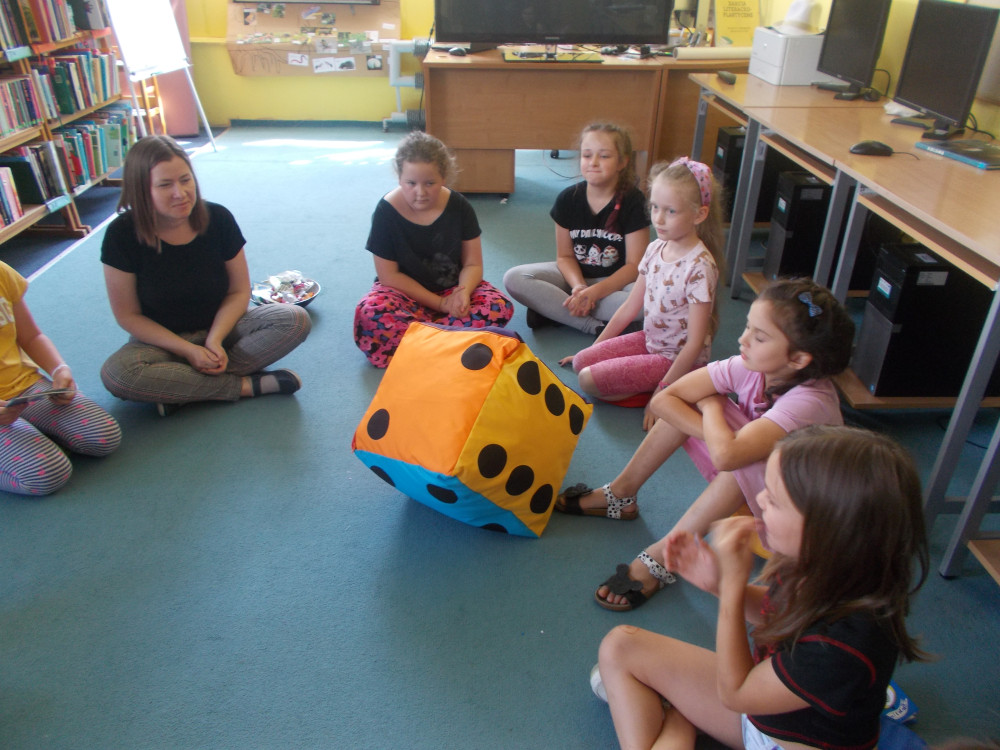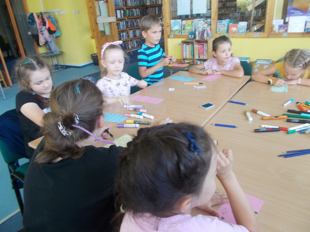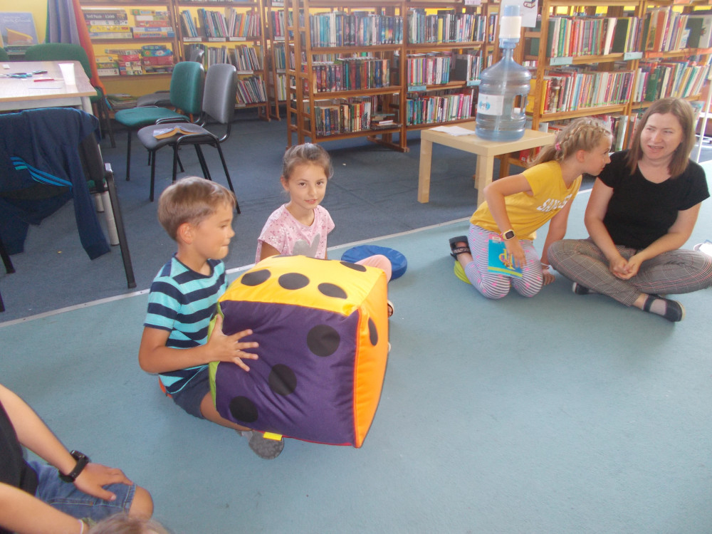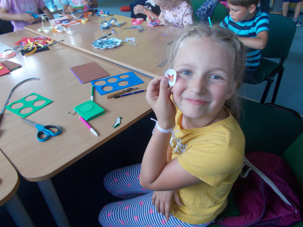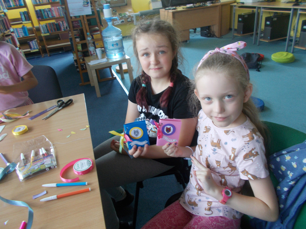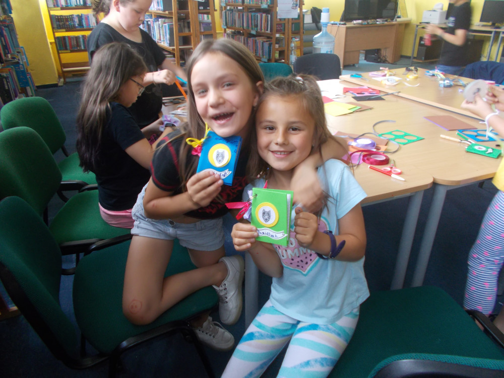 „(…) Kto raz przyjaźni poznał moc, nie będzie trwonić słów, (…) do zobaczenia znów”. Słowa fragmentu tej pięknej, harcerskiej piosenki symbolizują, że za nami już ostatni dzień wakacyjnego wypoczynku w bibliotece, ale dzieci nawiązały przyjaźnie i wymieniły się numerami telefonów. Nasza dwunastka, jak numer naszej filii, wzięła też udział w zajęciach biblioterapeutycznych, powiązanych z plastyką, przygotowanych przez sympatyczną Panią Beatę Piwar, z którą najmłodsi nawiązali świetny kontakt. Dzieci wysłuchały legendy „O dobrym i złym wilku”, podejmując dyskusję o dobru i złu, tkwiącym w każdym człowieku. Zadania miały na celu nazywanie swoich emocji, na koniec warsztatów każdy uczestnik wykonał własny notes, będący ich sekretnikiem. Graliśmy kostką XXL, która została zakupiona specjalnie na nasze zajęcia. Gdy ktoś wyrzucił odpowiednią liczbę oczek, mógł wylosować drobny upominek. Nie zabrakło też takich zabaw, jak pif-paf, biegnie, biegnie mały osioł czy oczko. Wisienką na torcie były pyszne lody dla ochłody, ufundowane przez Stowarzyszenie Bibliotekarzy Polskich, Zarząd Koła nr 1, za co jak zwykle najpiękniej dziękujemy w imieniu dzieci.