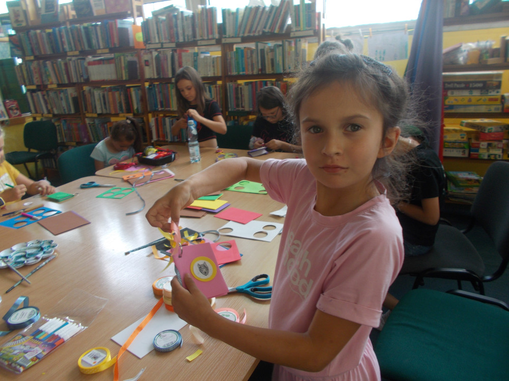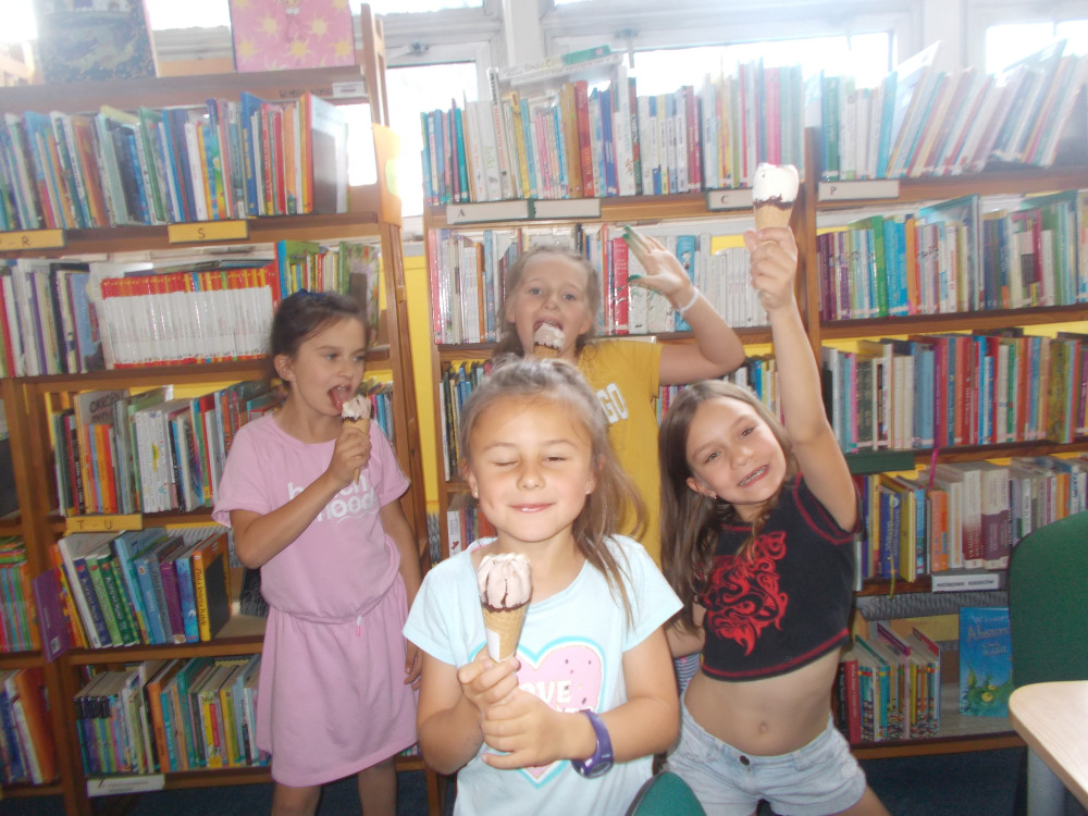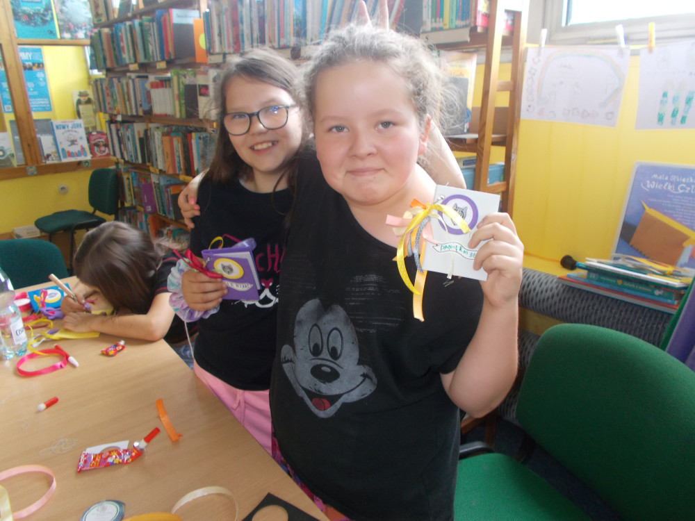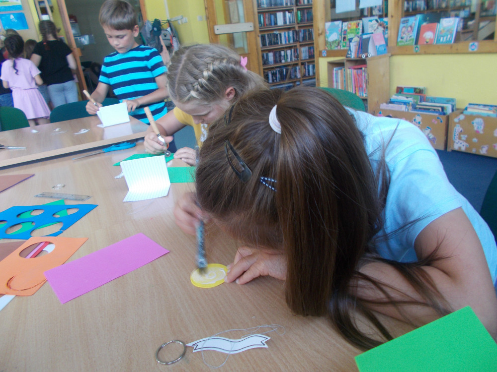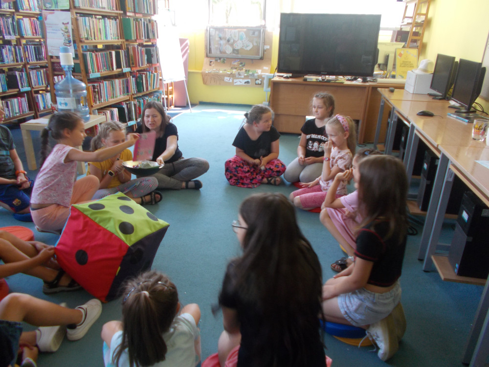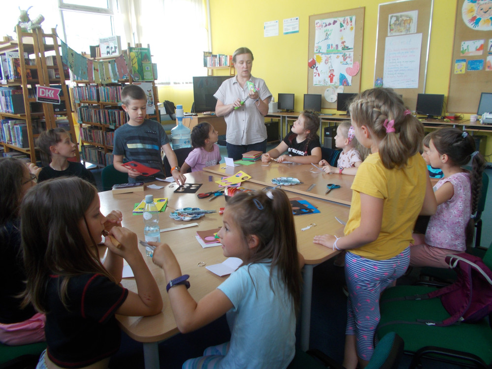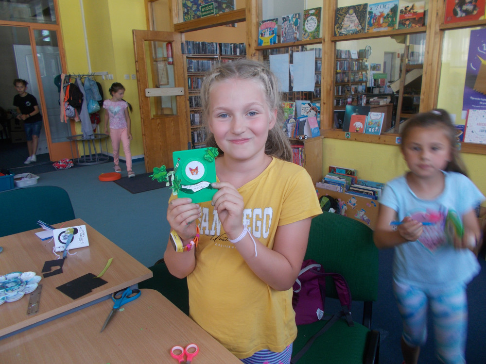 „(…) Kto raz przyjaźni poznał moc, nie będzie trwonić słów, (…) do zobaczenia znów”. Słowa fragmentu tej pięknej, harcerskiej piosenki symbolizują, że za nami już ostatni dzień wakacyjnego wypoczynku w bibliotece, ale dzieci nawiązały przyjaźnie i wymieniły się numerami telefonów. Nasza dwunastka, jak numer naszej filii, wzięła też udział w zajęciach biblioterapeutycznych, powiązanych z plastyką, przygotowanych przez sympatyczną Panią Beatę Piwar, z którą najmłodsi nawiązali świetny kontakt. Dzieci wysłuchały legendy „O dobrym i złym wilku”, podejmując dyskusję o dobru i złu, tkwiącym w każdym człowieku. Zadania miały na celu nazywanie swoich emocji, na koniec warsztatów każdy uczestnik wykonał własny notes, będący ich sekretnikiem. Graliśmy kostką XXL, która została zakupiona specjalnie na nasze zajęcia. Gdy ktoś wyrzucił odpowiednią liczbę oczek, mógł wylosować drobny upominek. Nie zabrakło też takich zabaw, jak pif-paf, biegnie, biegnie mały osioł czy oczko. Wisienką na torcie były pyszne lody dla ochłody, ufundowane przez Stowarzyszenie Bibliotekarzy Polskich, Zarząd Koła nr 1, za co jak zwykle najpiękniej dziękujemy w imieniu dzieci.