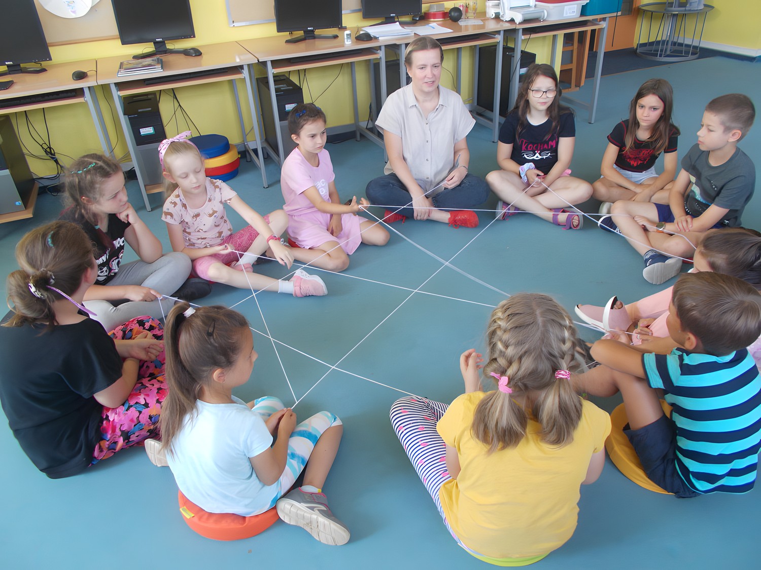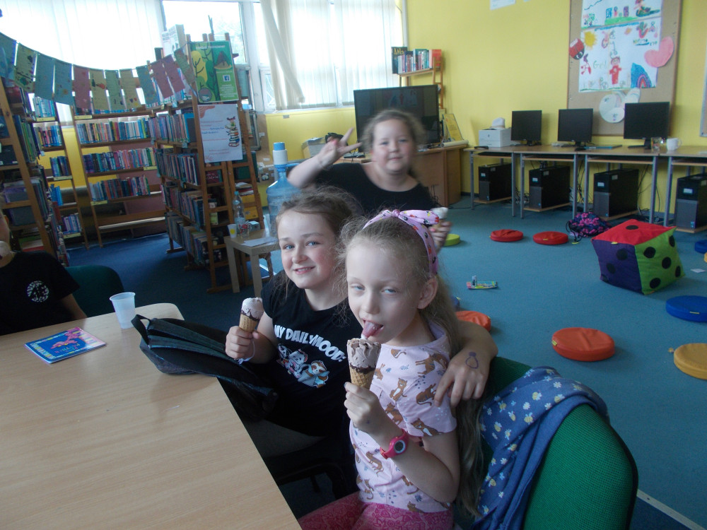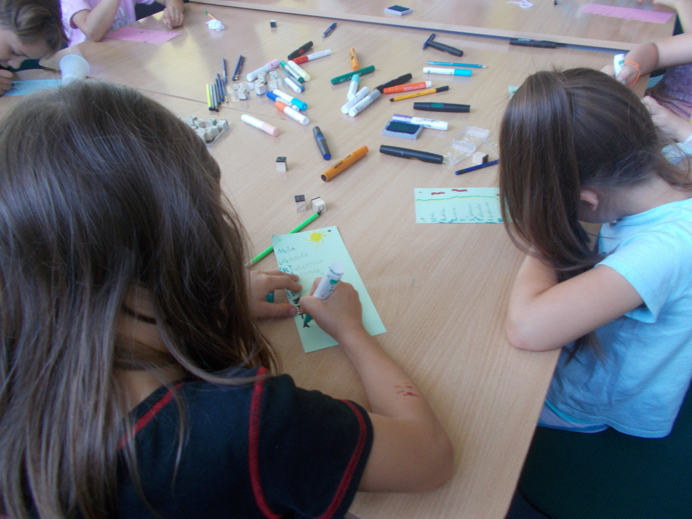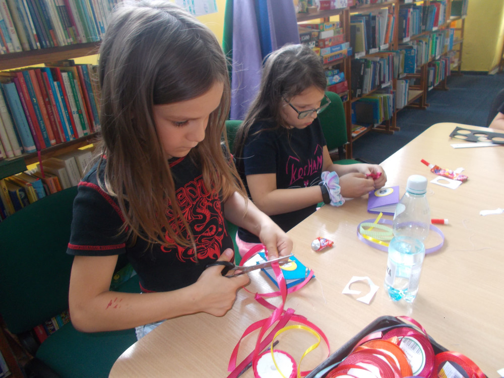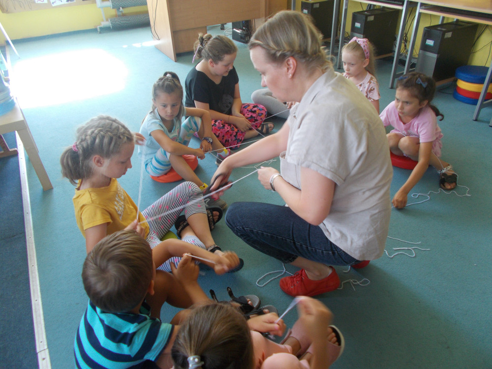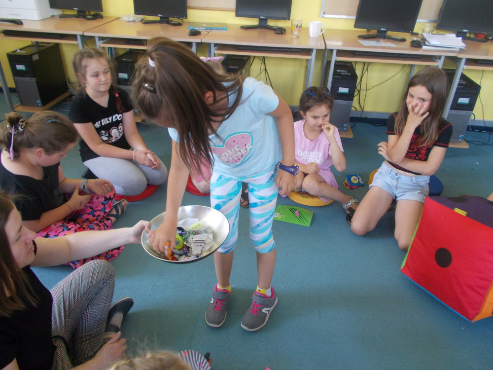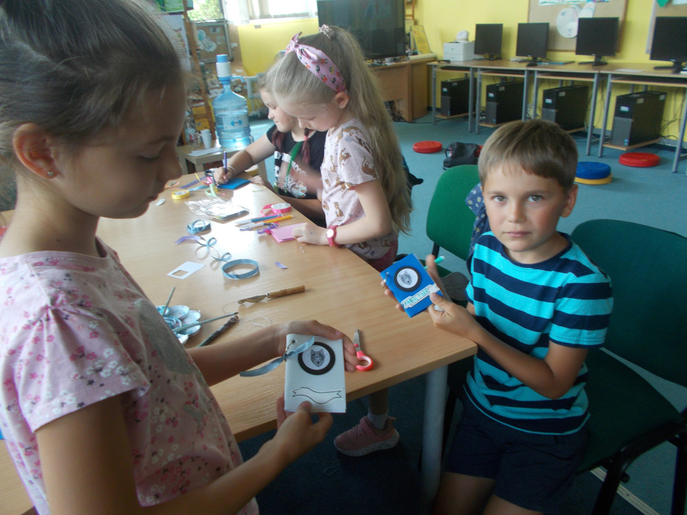 „(…) Kto raz przyjaźni poznał moc, nie będzie trwonić słów, (…) do zobaczenia znów”. Słowa fragmentu tej pięknej, harcerskiej piosenki symbolizują, że za nami już ostatni dzień wakacyjnego wypoczynku w bibliotece, ale dzieci nawiązały przyjaźnie i wymieniły się numerami telefonów. Nasza dwunastka, jak numer naszej filii, wzięła też udział w zajęciach biblioterapeutycznych, powiązanych z plastyką, przygotowanych przez sympatyczną Panią Beatę Piwar, z którą najmłodsi nawiązali świetny kontakt. Dzieci wysłuchały legendy „O dobrym i złym wilku”, podejmując dyskusję o dobru i złu, tkwiącym w każdym człowieku. Zadania miały na celu nazywanie swoich emocji, na koniec warsztatów każdy uczestnik wykonał własny notes, będący ich sekretnikiem. Graliśmy kostką XXL, która została zakupiona specjalnie na nasze zajęcia. Gdy ktoś wyrzucił odpowiednią liczbę oczek, mógł wylosować drobny upominek. Nie zabrakło też takich zabaw, jak pif-paf, biegnie, biegnie mały osioł czy oczko. Wisienką na torcie były pyszne lody dla ochłody, ufundowane przez Stowarzyszenie Bibliotekarzy Polskich, Zarząd Koła nr 1, za co jak zwykle najpiękniej dziękujemy w imieniu dzieci.