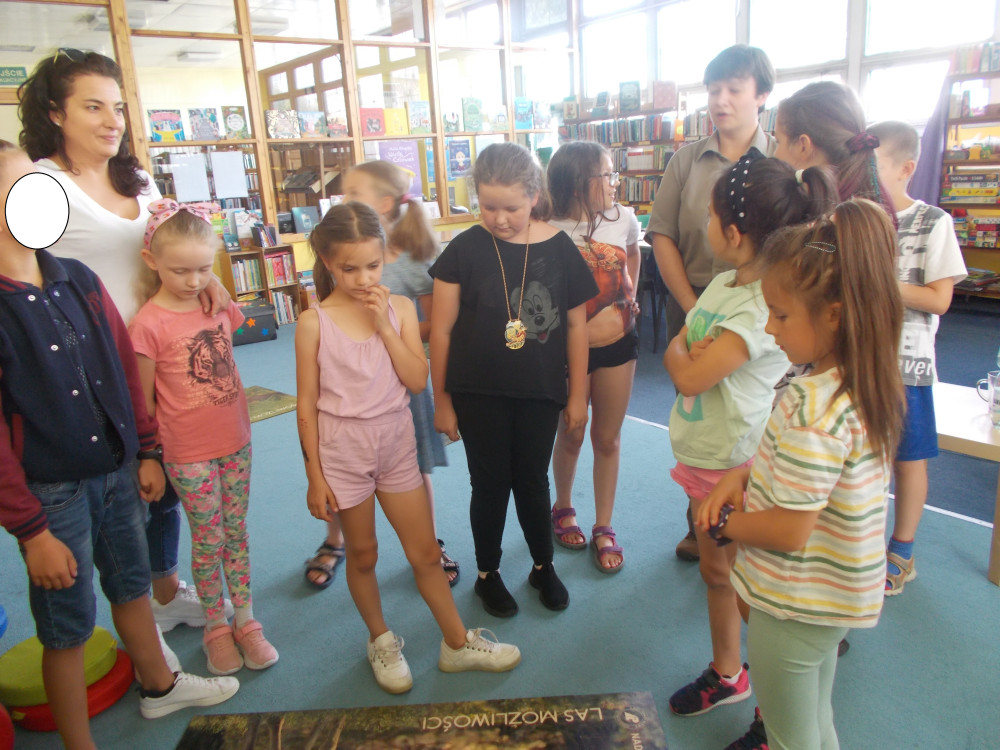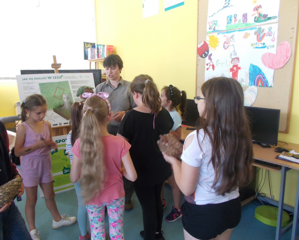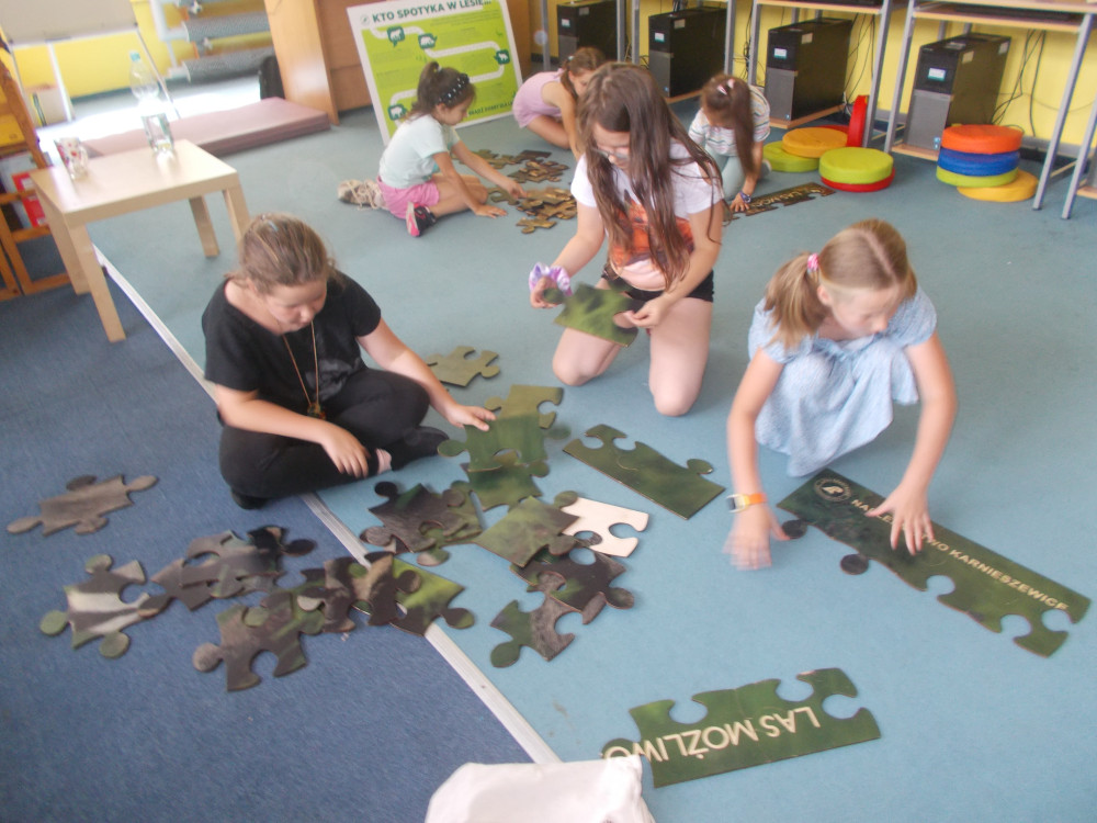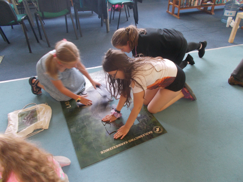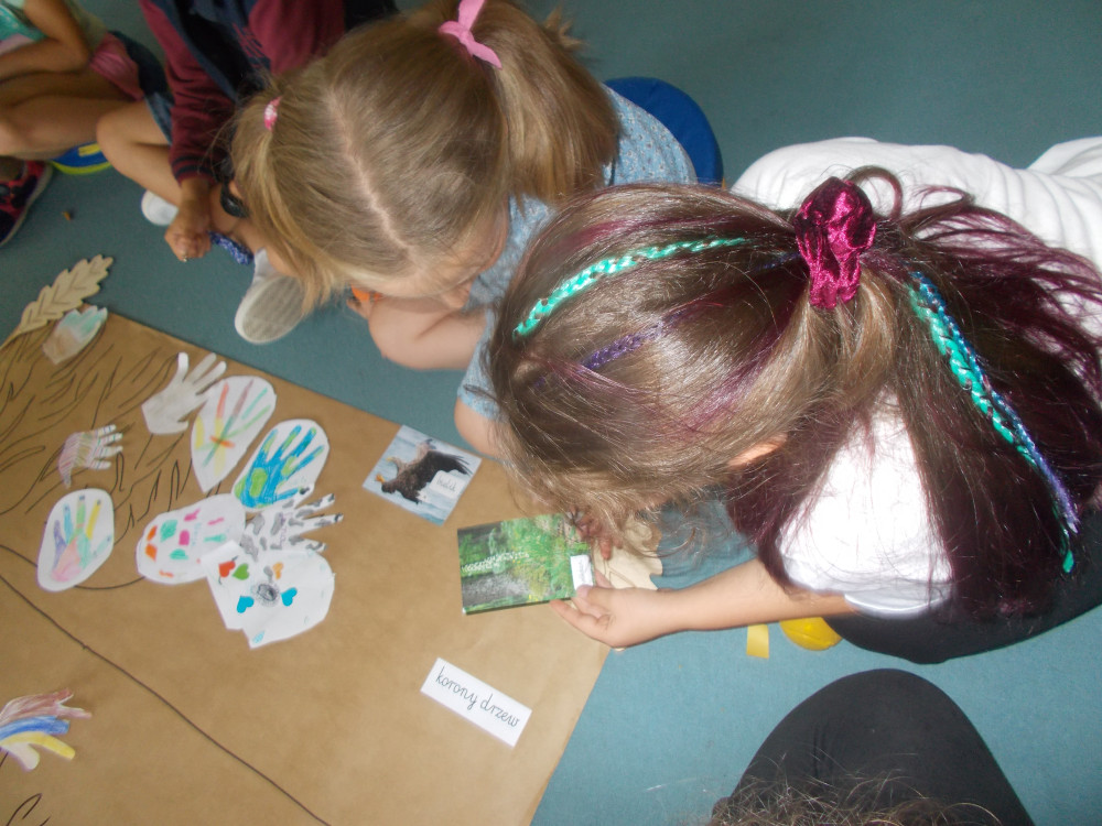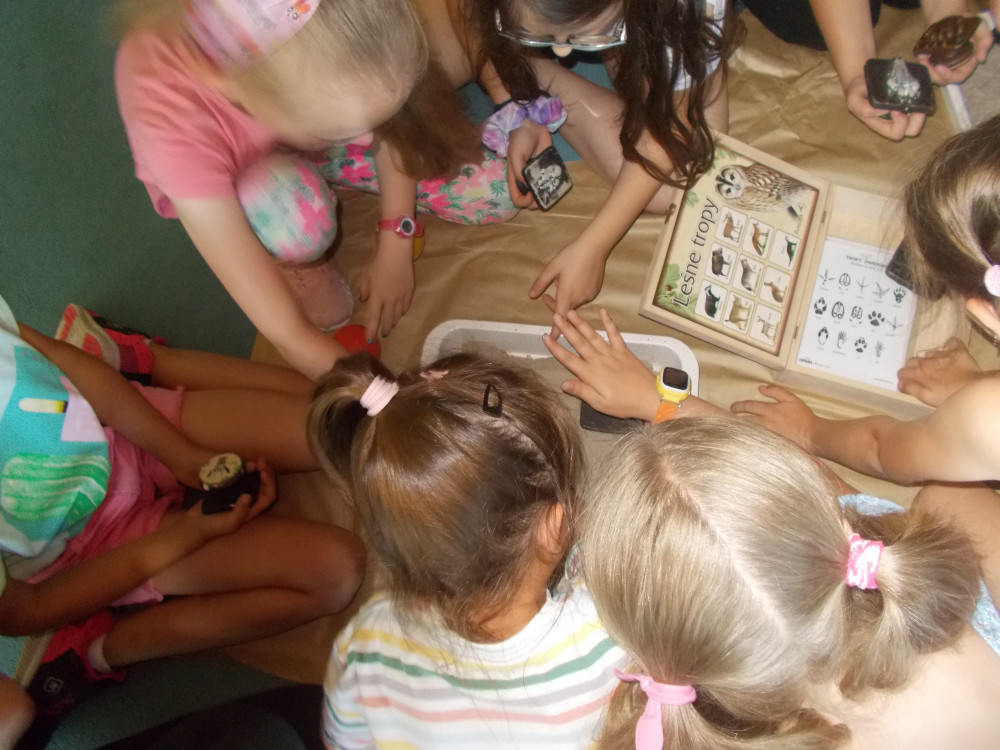 Na tym nie koniec. Klimat przybrał charakter typowo leśny, odwiedziła nas bowiem leśniczka, pani Kinga z Nadleśnictwa Karnieszewice, która w bardzo ciekawy sposób opowiadała o swojej pracy i gatunkach zwierząt oraz o zasadach panujących w lesie. Dzieci wzięły udział w zawodach w układaniu ogromnych puzzli z wizerunkiem leśnych zwierząt, wspólnie tworzyły drzewo i utrwalały wiedzę na temat warstw lasu oraz poznawały tropy zwierząt, odciskając je w masie. Na koniec porwaliśmy Panią Kingę do wspólnej zabawy: burza piaskowa. Każde dziecko otrzymało upominek od Nadleśnictwa Karnieszewice.
