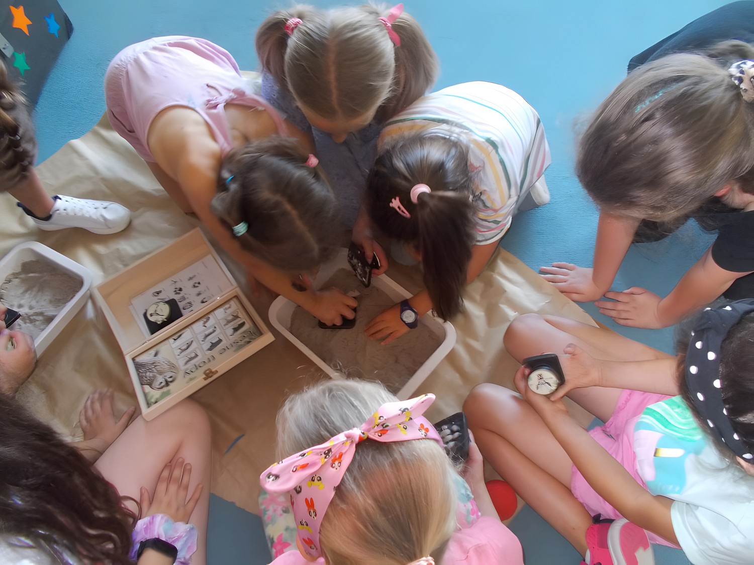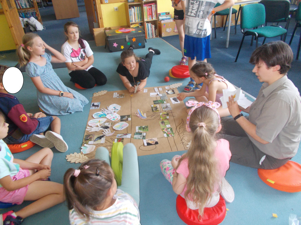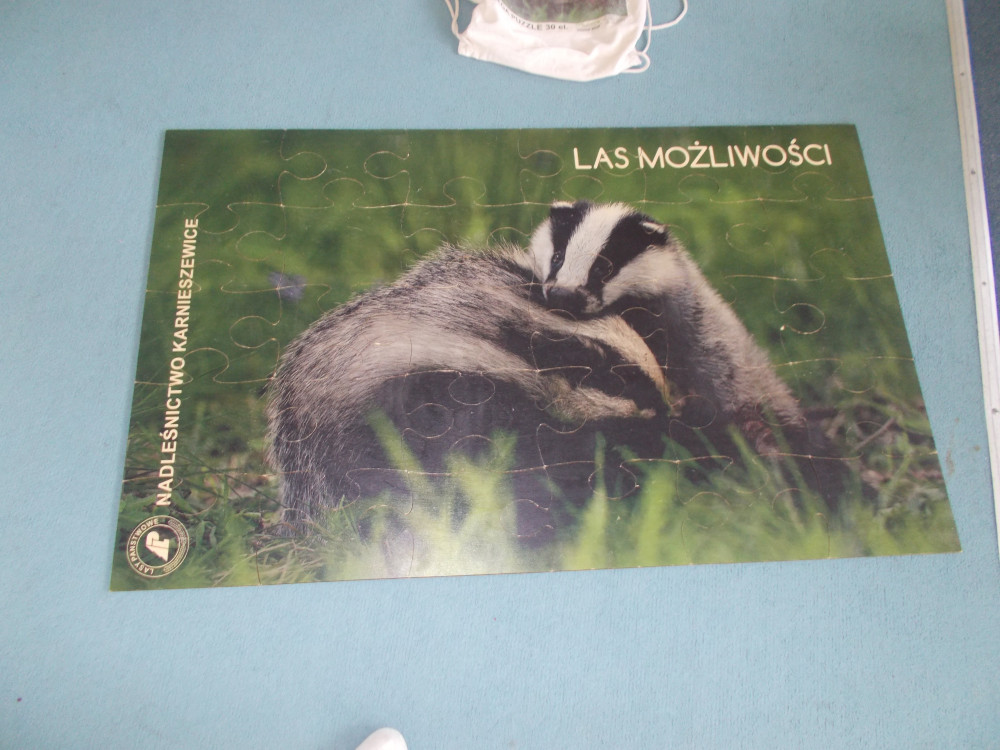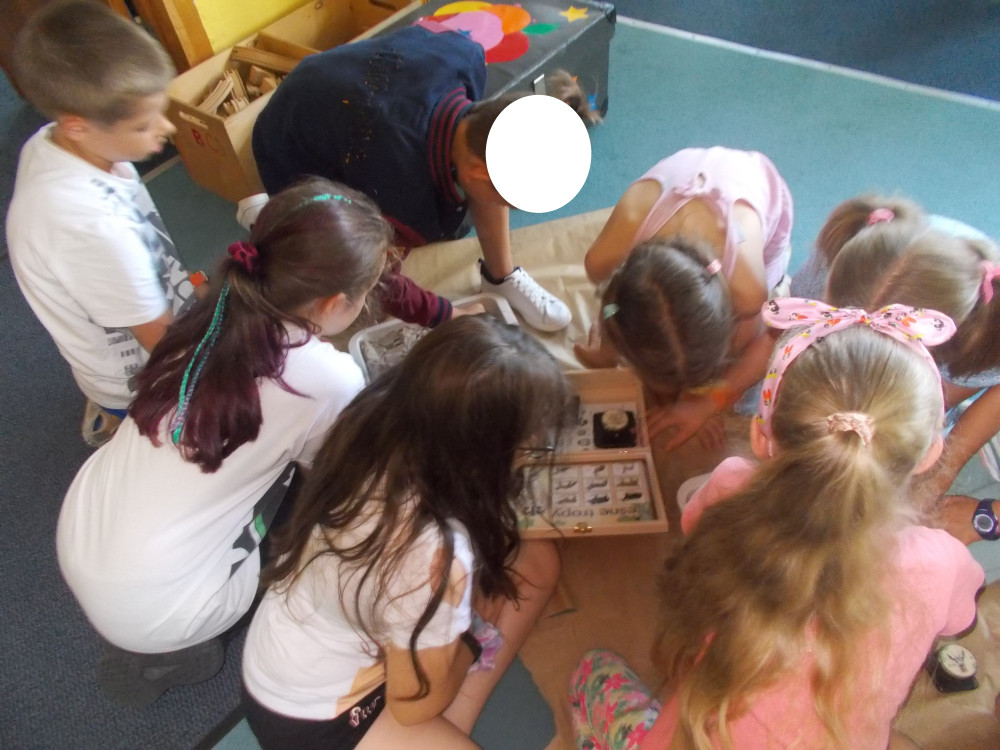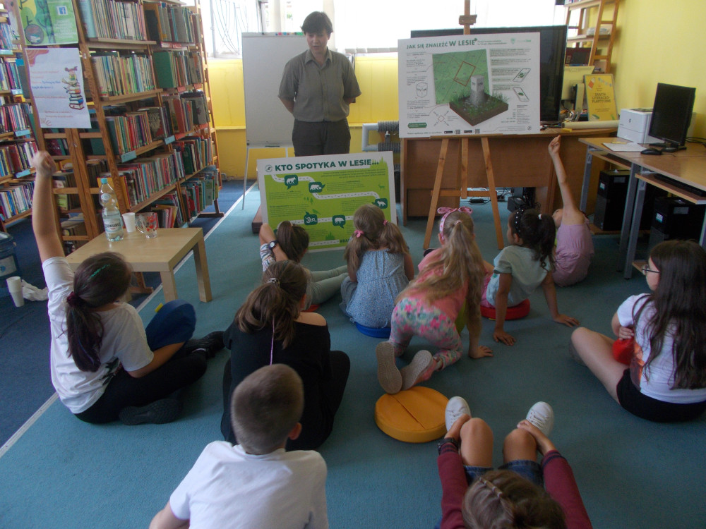 Na tym nie koniec. Klimat przybrał charakter typowo leśny, odwiedziła nas bowiem leśniczka, pani Kinga z Nadleśnictwa Karnieszewice, która w bardzo ciekawy sposób opowiadała o swojej pracy i gatunkach zwierząt oraz o zasadach panujących w lesie. Dzieci wzięły udział w zawodach w układaniu ogromnych puzzli z wizerunkiem leśnych zwierząt, wspólnie tworzyły drzewo i utrwalały wiedzę na temat warstw lasu oraz poznawały tropy zwierząt, odciskając je w masie. Na koniec porwaliśmy Panią Kingę do wspólnej zabawy: burza piaskowa. Każde dziecko otrzymało upominek od Nadleśnictwa Karnieszewice.