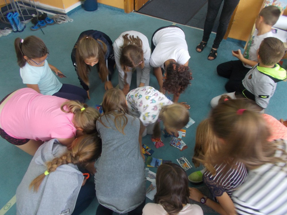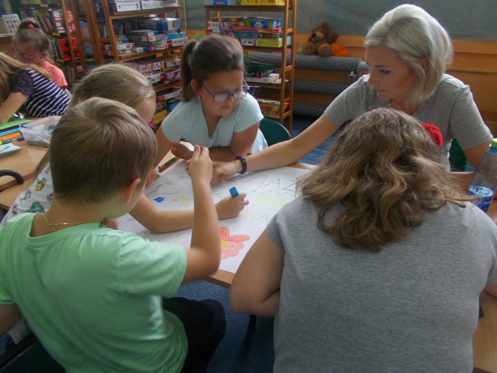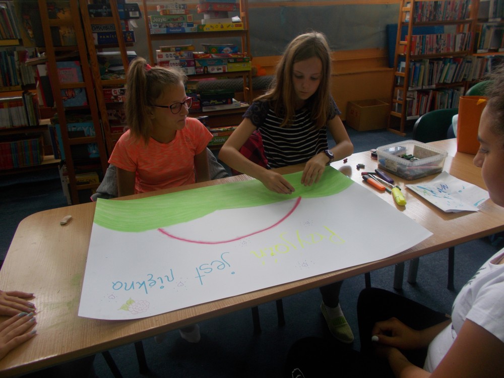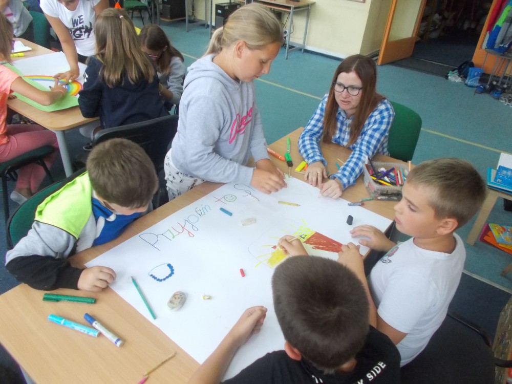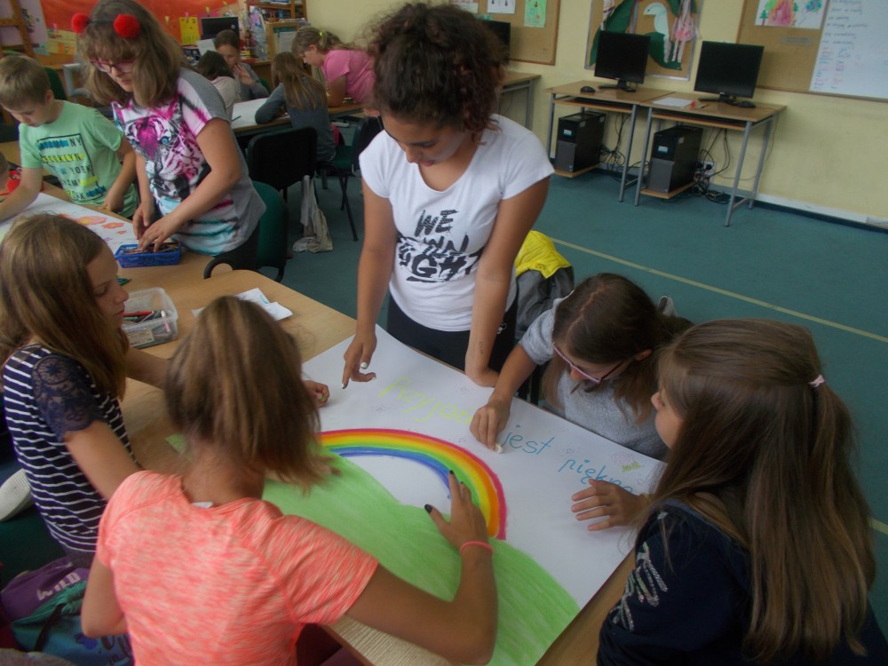 Drugi dzień warsztatów upłynął nam na inspirujących dyskusjach o przyjaźni, o naszych talentach i umiejętnościach, które czynią nas wyjątkowymi. Wspólnie stworzyliśmy plakaty z hasłami o bliskich relacjach między ludźmi, które będą przypominać nam o ważnych wartościach. Dla zacieśnienia więzi w naszej grupie, Pani Beata zorganizowała mnóstwo ciekawych zabaw integracyjnych.