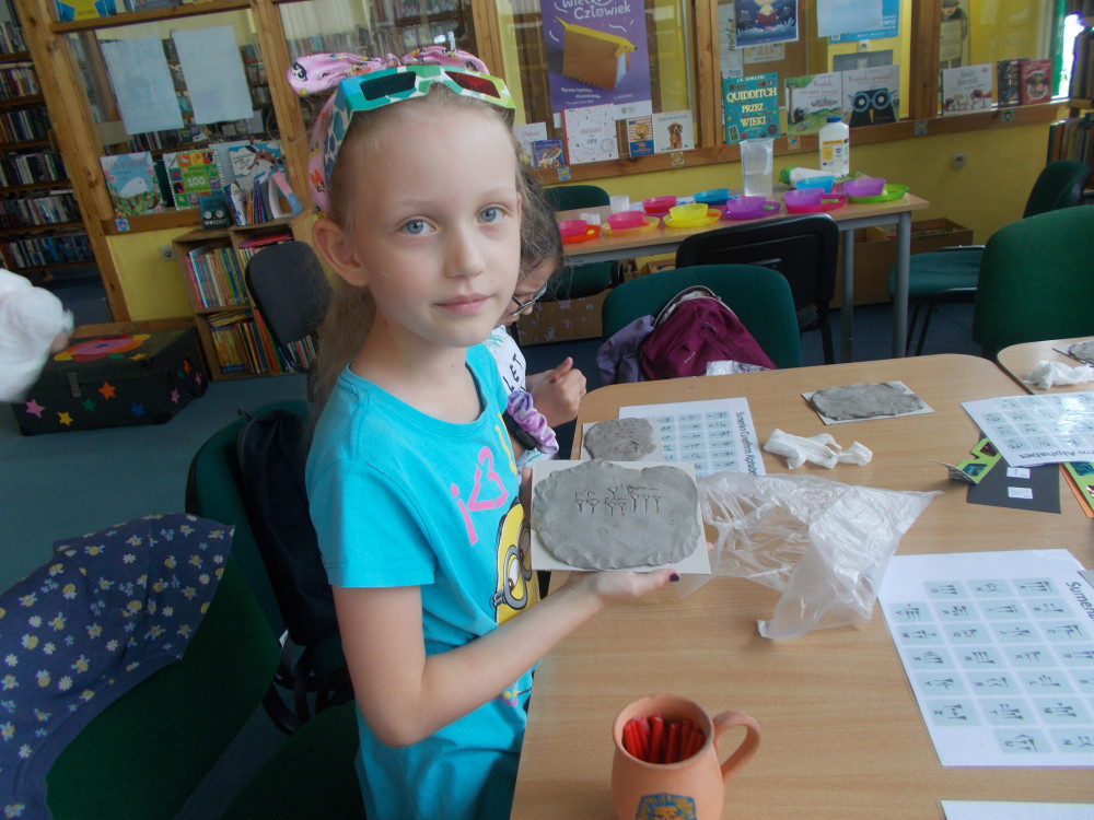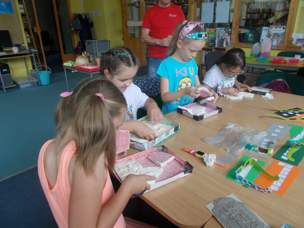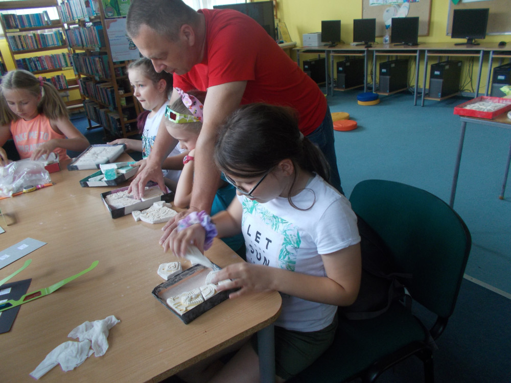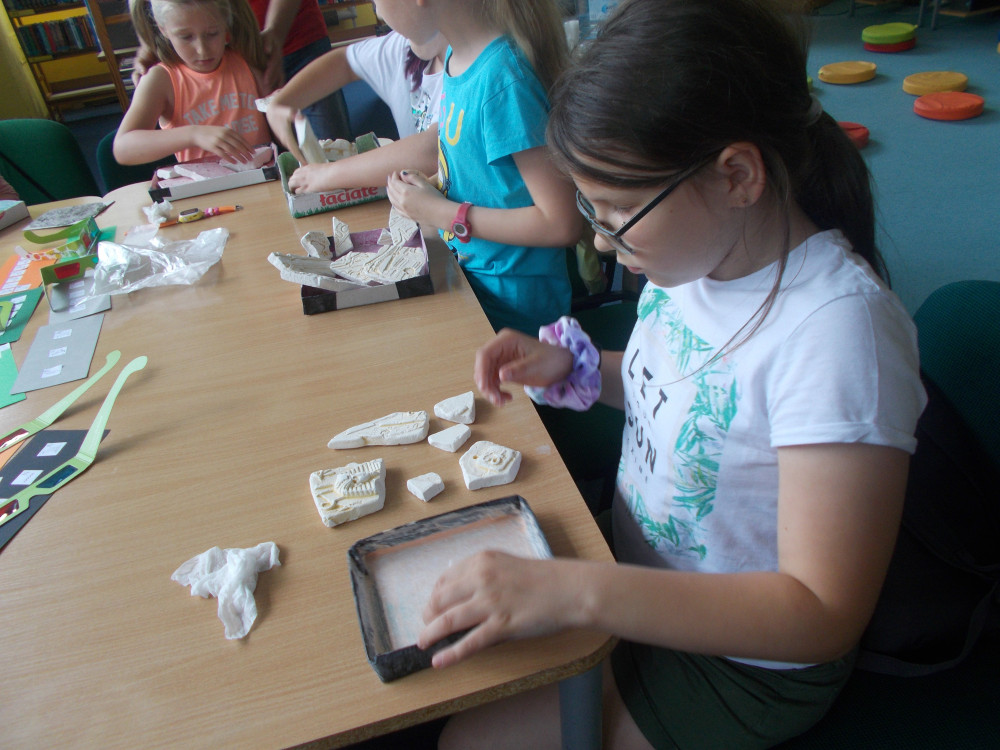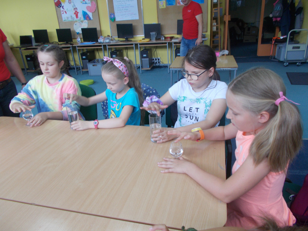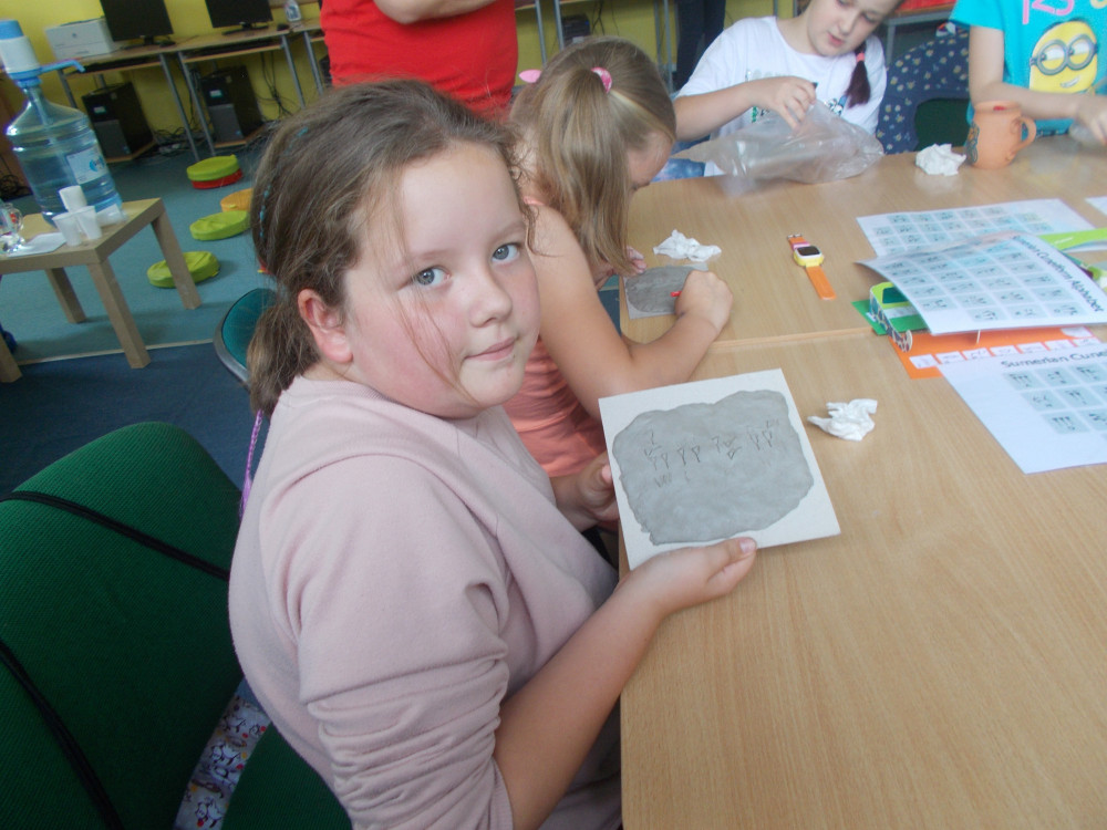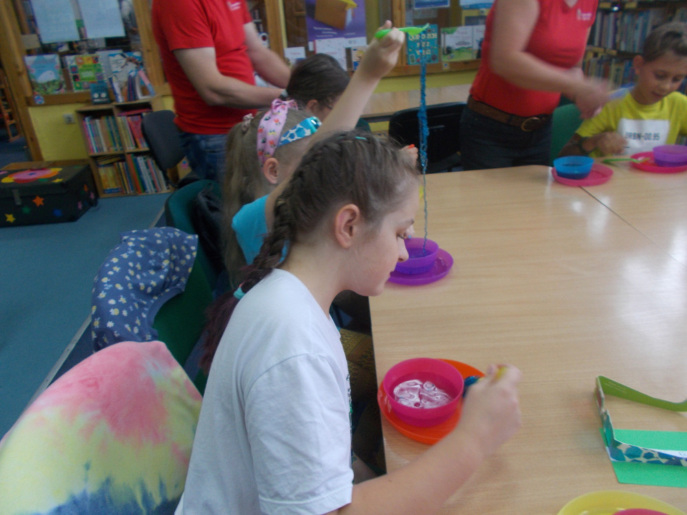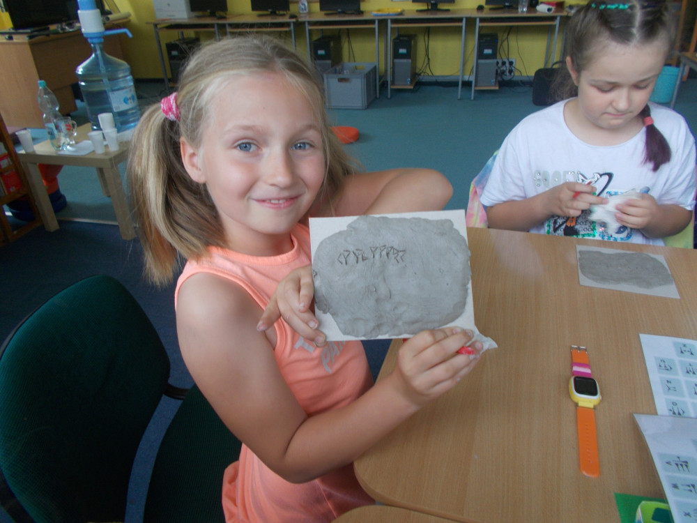 Wczorajszy dzień również był pełen wrażeń. Najpierw oddaliśmy się wesołym zabawom, a następnie odwiedziła nas „Pomysłowa Fabryka”, która przygotowała dla nas rewelacyjne warsztaty, podczas których eksperymentowaliśmy z dźwiękiem, dowiadując się wielu ciekawostek ze świata fizyki. Jakie było zdziwienie najmłodszych, kiedy okazało się, że można ugasić ogień dźwiękiem, czy zagrać melodie palcami na brzegach kieliszków, wypełnionych wodą. W drugiej części warsztatów, dzieci miały okazję wcielić się w rolę małych archeologów, dowiadując się tajemnic na temat tej niesamowitej profesji. Uczestnicy naszych wakacji ,podpisywały gliniane tabliczki egipskimi hieroglifami i pismem klinowym. Na koniec,każde dziecko wykonywało swojego robala z substancji chemicznych.