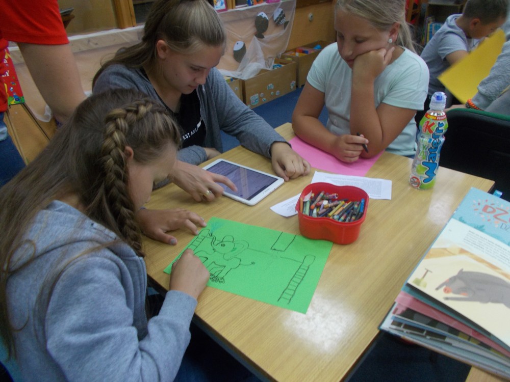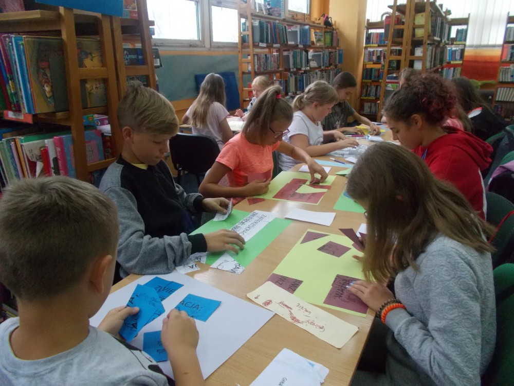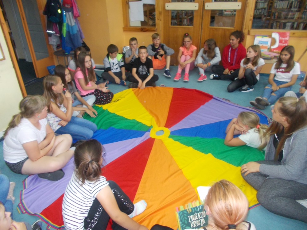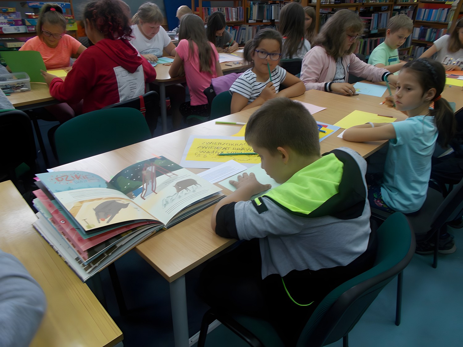 Wspólnie spędzony czas w bibliotece obfitował w zabawy integracyjne, ruchowe i plastyczne. Motywem przewodnim zajęć była książka „Zwierzokracja” Oli Woldańskiej-Płocińskiej, której treść zainspirowała nas do stworzenia scenariusza zabaw edukacyjnych uświadamiających dzieci o konieczności poszanowania praw zwierząt.