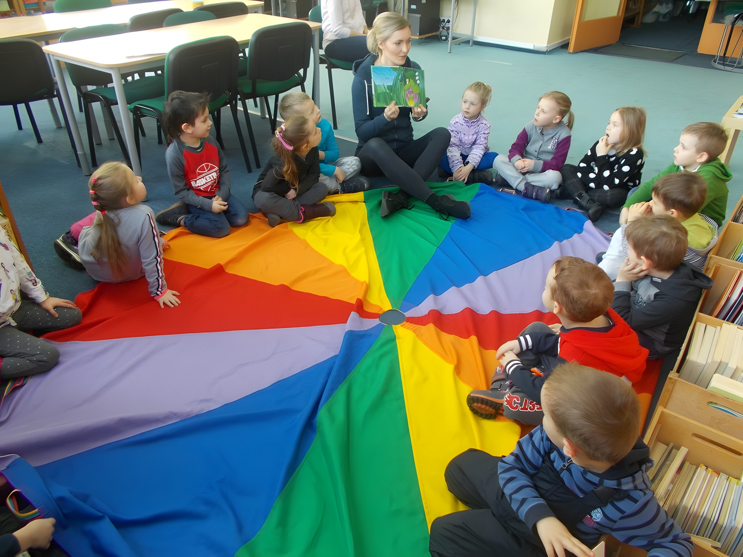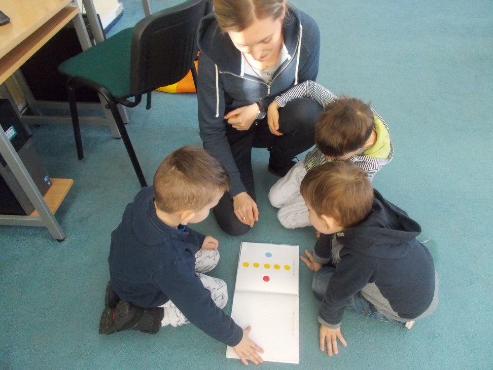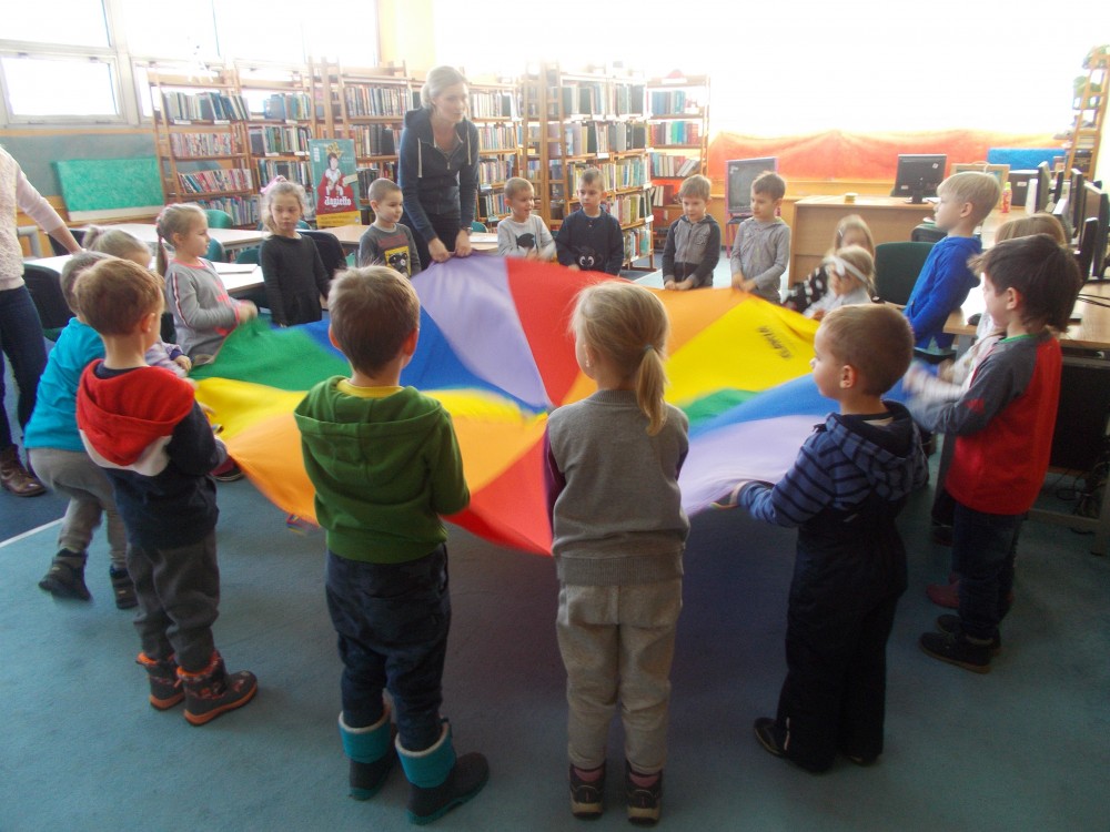 We wtorkowy poranek odwiedziła nas grupa ,,Jeżyków”, czyli pięciolatków z Przedszkola nr 13 w Koszalinie. Miłe spotkanie rozpoczęliśmy od przeczytania książki ,,Żabka mała” Barbary Żołądek. Tytułowa bohaterka opowiadania miała jedno zmartwienie-nie chciała być zielona. O tym, czy warto być koloru kabaczka czy trawy przekonała się podczas napotkania na swojej drodze bociana…