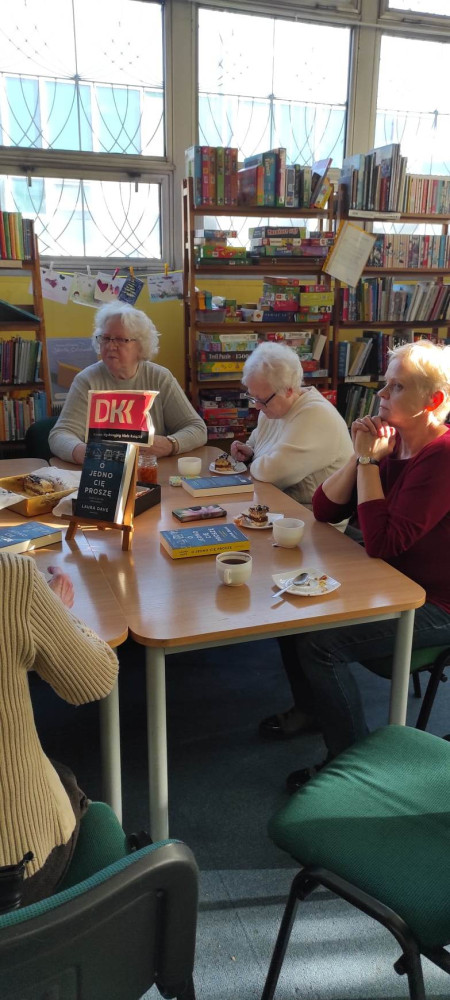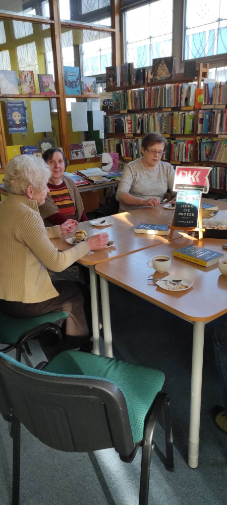 Dziś rozmawiałyśmy o książce "O jedno Cię proszę" Laury Dave. Świetny thriller psychologiczny, który uzmysławia nam, jak często nie można do końca poznać człowieka. Tajemnica goni tajemnicę, a w finale ma to wpływ na życie wielu tak ważnych dla głównego bohatera osób. Panie zwróciły uwagę na psychologię postaci, a dyskusja była bardzo żywa. Spotkanie zostało osłodzone pysznym ciastem, przyniesionym przez Panią Marię, która 2 lutego obchodziła swoje imieniny. Pani Mario, jeszcze raz wszystkiego najpiękniejszego