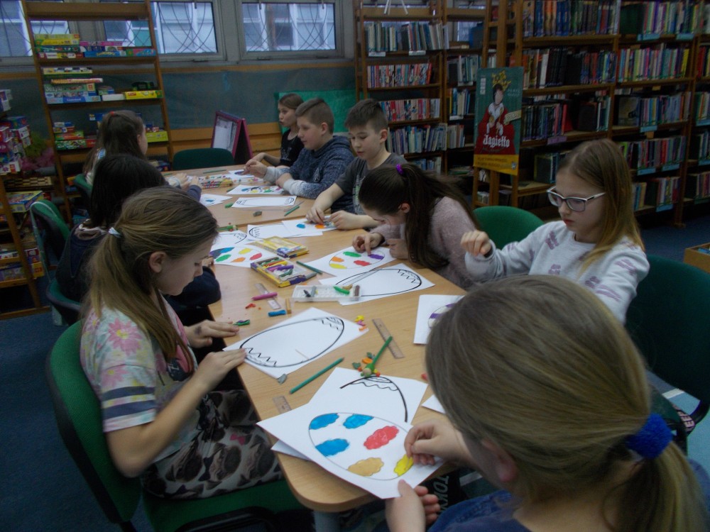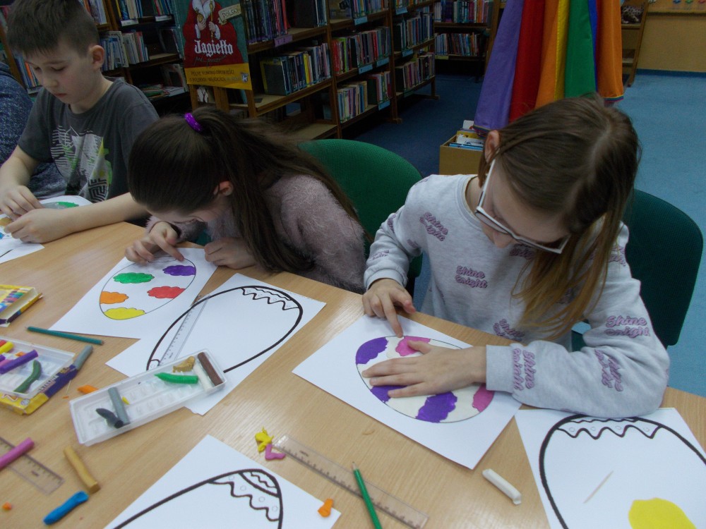 Wielkimi krokami zbliża się Wielkanoc, więc podczas naszego czwartkowego spotkania przekształciliśmy przypuszczenie, zawarte w tytule książki Renaty Piątkowskiej „Gdyby jajko mogło mówić i inne opowiadania”, na pytanie i próbowaliśmy na nie odpowiedzieć. Pomysły były różne i dość oryginalne. Czytaliśmy opowiadania o tradycji Śmigusa- Dyngusa i Prima Aprilis. Dzieci chętnie opowiedziały o swoich tradycjach i doświadczeniach związanych z świętami wielkanocnymi. Podczas naszych zajęć powstały piękne, papierowe pisanki ozdobione kolorową plasteliną.