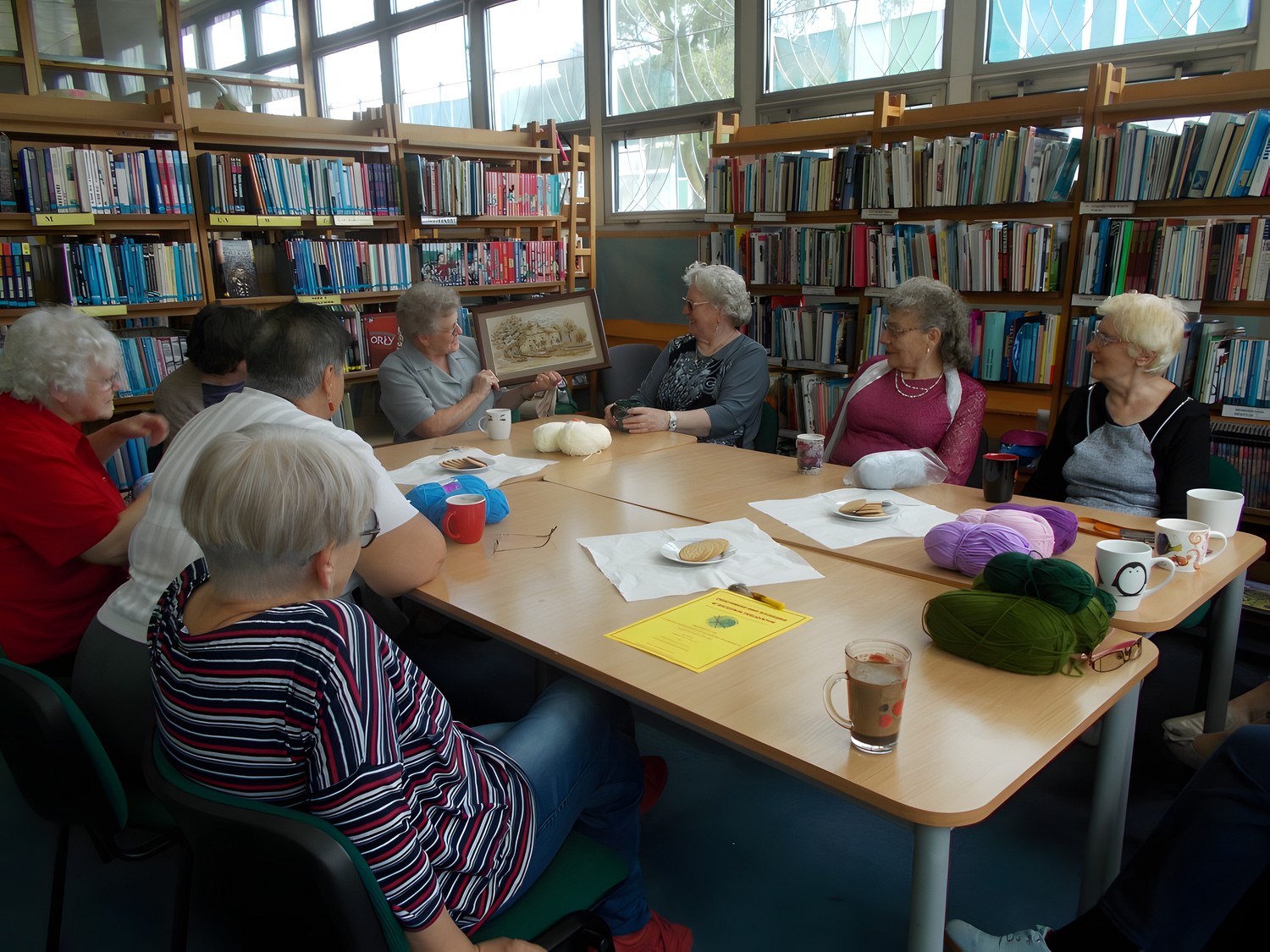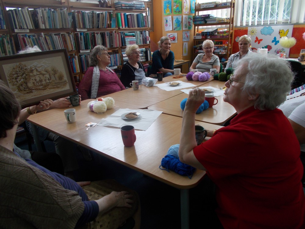 Choć pogoda na zewnątrz nie napawa optymizmem, my postanowiłyśmy na przekór pochmurnego nieba ponieść się radości manii włóczkowania. Na naszych stołach pojawiły się różnokolorowe kłębki wełny. Oprócz ożywionych dyskusji o literaturze i nie tylko, jedna z Pań pochwaliła się pięknym obrazem wyszytym własnoręcznie przez siebie. Jak zwykle atmosfera była sympatyczna i udzieliła się nam wszystkim.