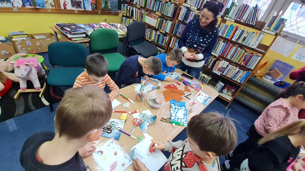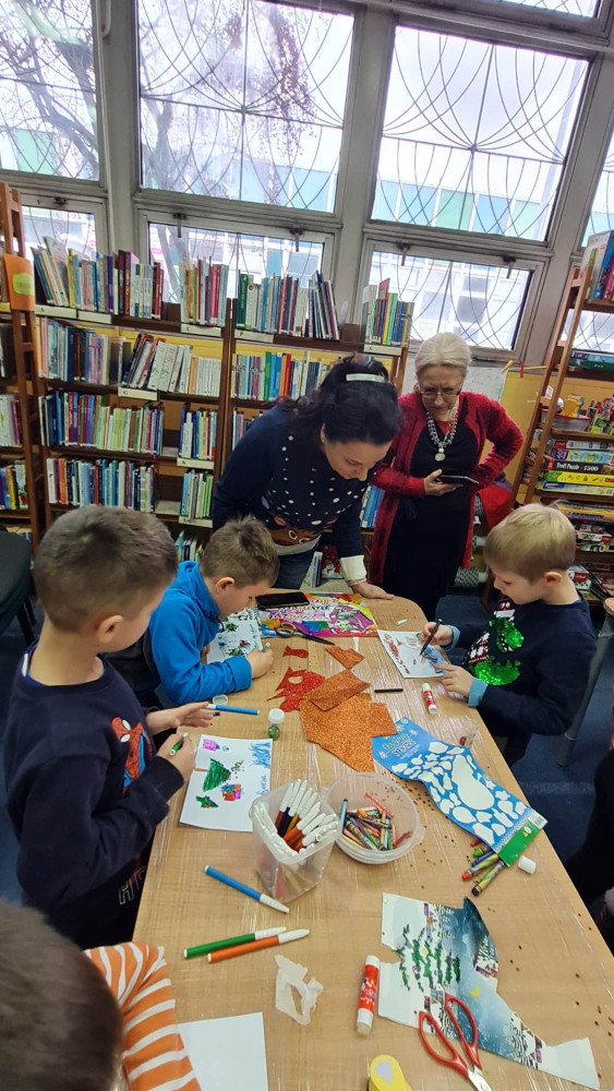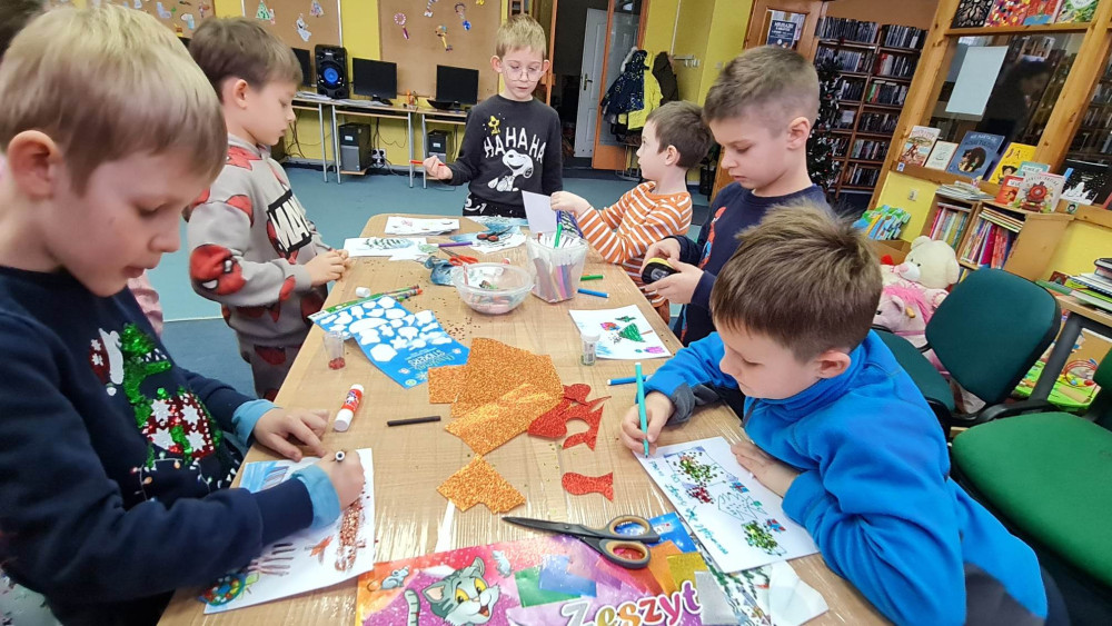 Przedświąteczna wizyta pierwszoklasistów ze SP nr 5, to kolejne odwiedziny w naszej bibliotece. Poprzez wspólną zabawę przypomnieliśmy sobie tradycje i zwyczaje świąteczne. Natomiast gwiazdkowe przygody Złego Kocurka oraz wykonywanie kartek świątecznych wprowadziły wszystkich w bożonarodzeniowy nastrój.