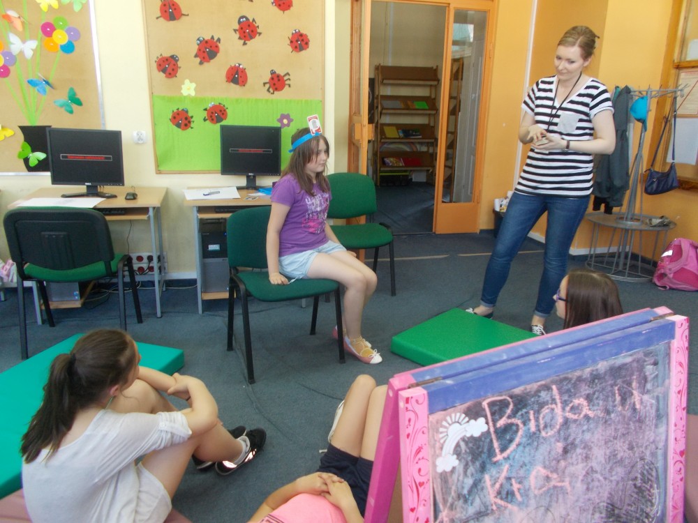 Dziewczynka siedzi na krześle z ilustracją na głowie, a reszta dzieci i bibliotekarka odpowiadają na jej pytania