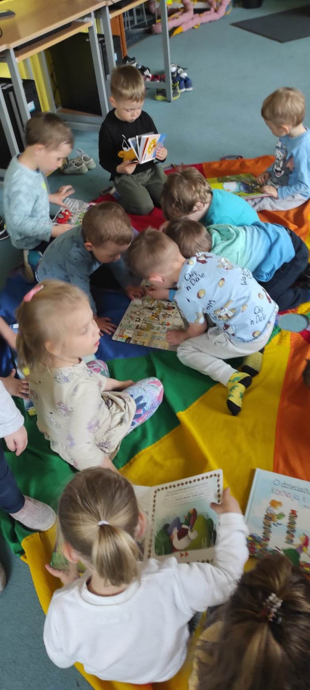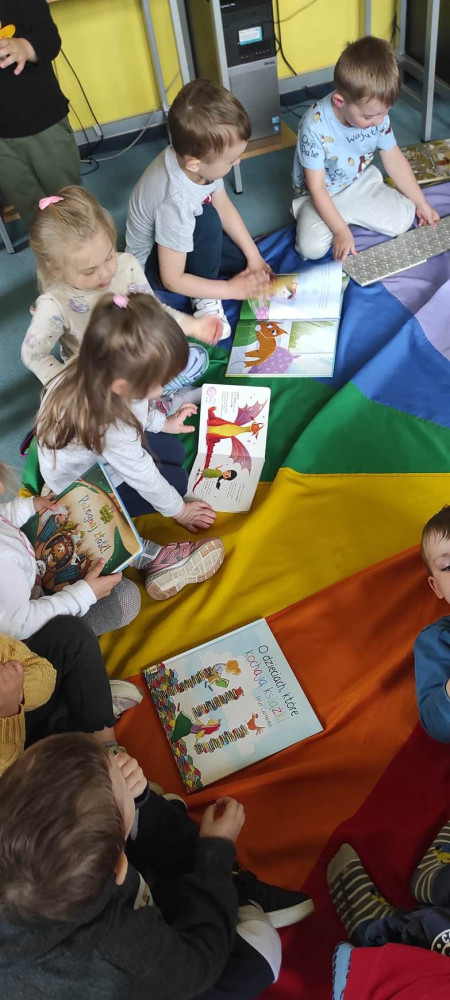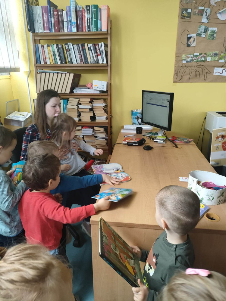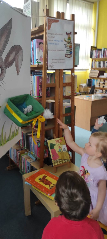 W poniedziałkowy poranek, w ostatni dzień Tygodnia Bibliotek z pierwszą wizytą przyjechały do nas czteroletnie "Zajączki" z Przedszkola Happy Days. Liczna grupa maluchów wysłuchała opowiadania "O dzieciach, które kochają książki" Peter Carnavas, a także dowiedziały się, jak zapisać się do biblioteki. Dzieci same wcieliły się w rolę bibliotekarzy i wypożyczyły swoją pierwszą książkę. "Zajączki" wzięły udział w zabawach i chętnie oglądały książki, znajdujące się w naszej bibliotece. Na zakończenie każde dziecko otrzymało zakładkę do książki i balona.