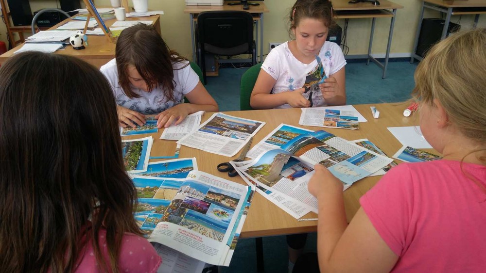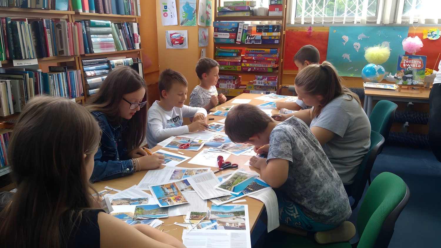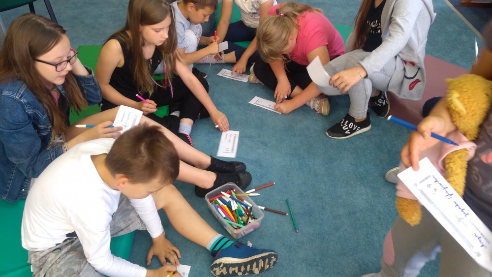 W poniedziałek, 17 lipca rozpoczęliśmy wakacyjną przygodę w bibliotece. Uczestnicy zajęć wykonali wizytówki w kształcie biletów z imionami i nazwą kraju do którego chciałyby się udać. Dzieci wypisały zasady, które są przestrzegane na naszych zajęciach na stworzonych przez siebie pocztówkach techniką kolażu. Najważniejszym punktem naszych zajęć jest zawsze integracja, dlatego nie zabrakło różnorodnych zabaw. Nasi mali odkrywcy zadowoleni i radośni dopytywali o kolejne dni naszych zajęć.