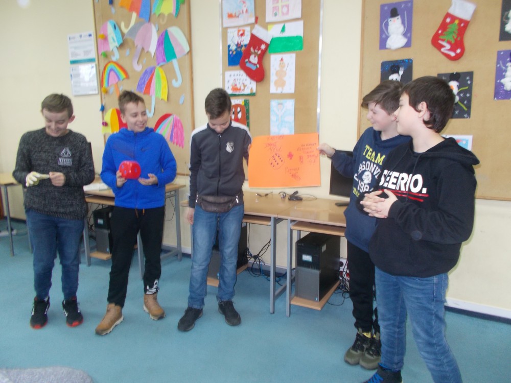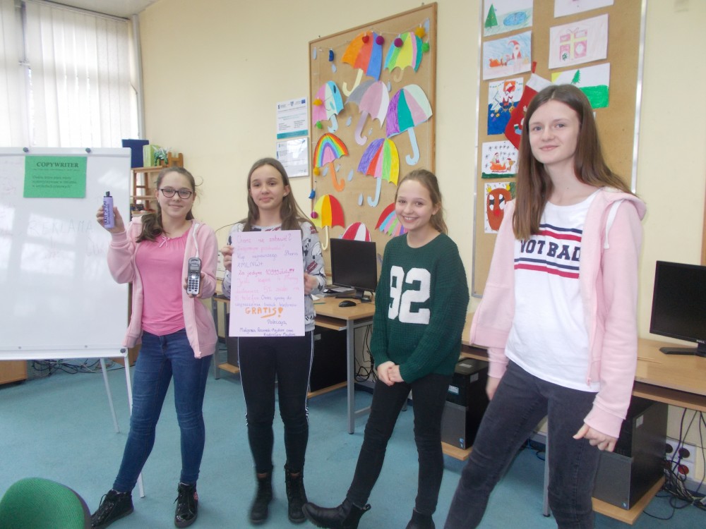 Podczas części praktycznej tych zajęć, uczniowie mogli się wcielić w twórców reklam i przekonać się, jak tanie przedmioty mogą stać się bardzo ekskluzywne, dzięki świetnej promocji. Klasa wykazała się kreatywnością i aktywnością. To ćwiczenie uświadomiło dzieciom, jak mało istotne jest posiadanie modnych gadżetów.