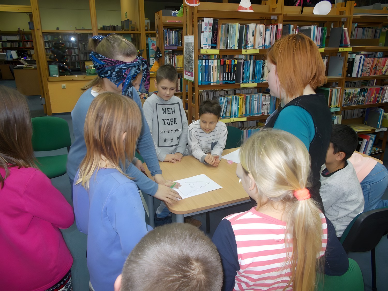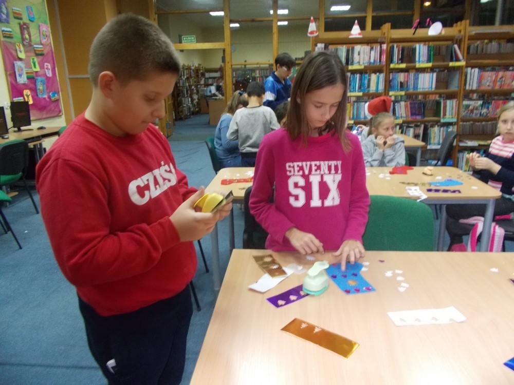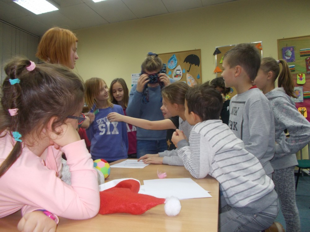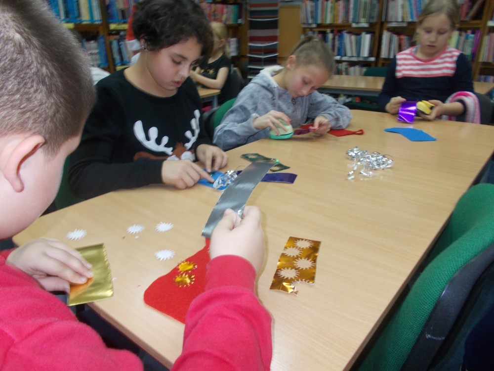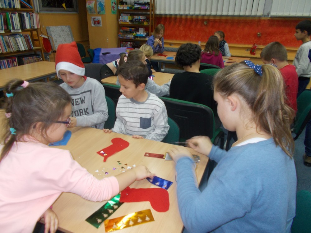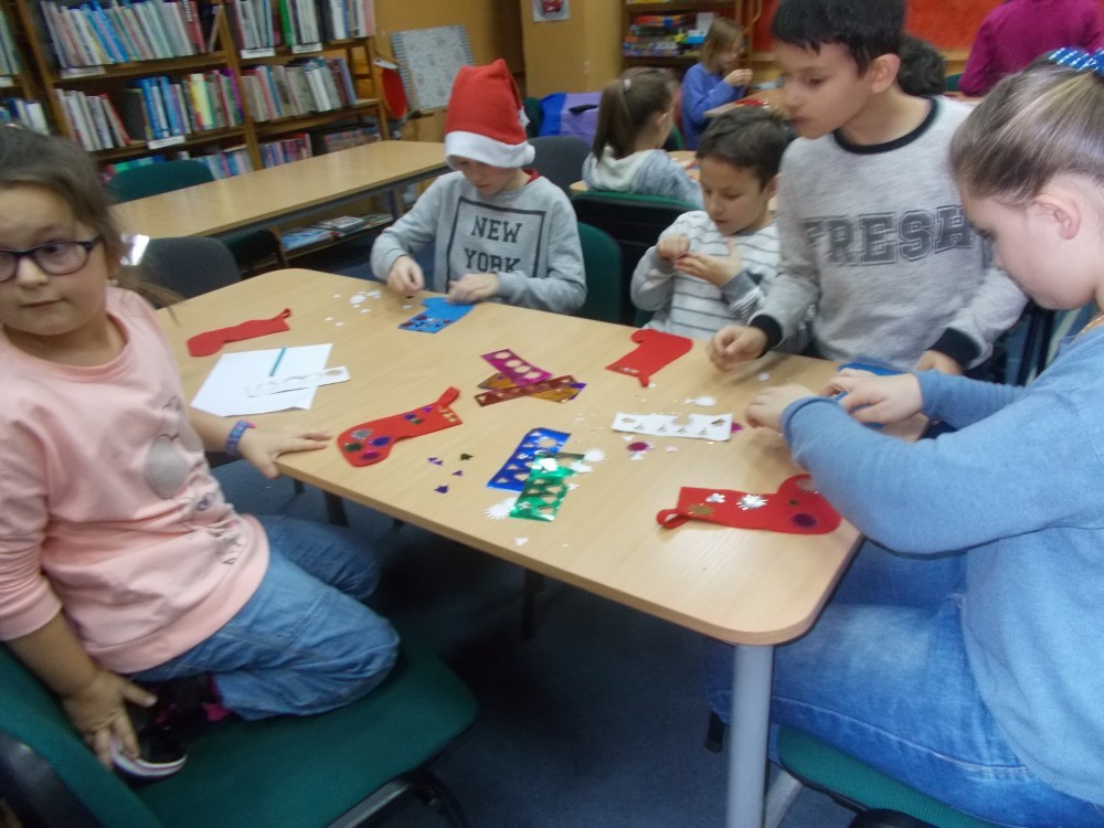 W czwartek, 8 grudnia podczas naszych cotygodniowych zajęć literacko-plastycznych, tematem przewodnim były zbliżające się święta. Mikołaj i jego elfy napisały do dzieci list, w którym prosi naszych podopiecznych o znalezienie zadań i ich wspólne wykonanie. Nasi czytelnicy musieli m.in. wyczuć za pomocą samego dotyku ,co kryje się w czapce Mikołaja, z zamkniętymi oczami narysować Mikołaja i dorysować bombki na choince, rozwiązać rebus i czytać teksty „łamiące język" , a także za pomocą gestów pokazywać czynności świąteczne. Potem ,zaspokoiliśmy dziecięcą ciekawość opowiadaniem „Skąd Mikołaj bierze prezenty?". Spotkanie zakończyliśmy ozdabianiem skarpetek z filcu, które pięknie zdobią naszą bibliotekę.