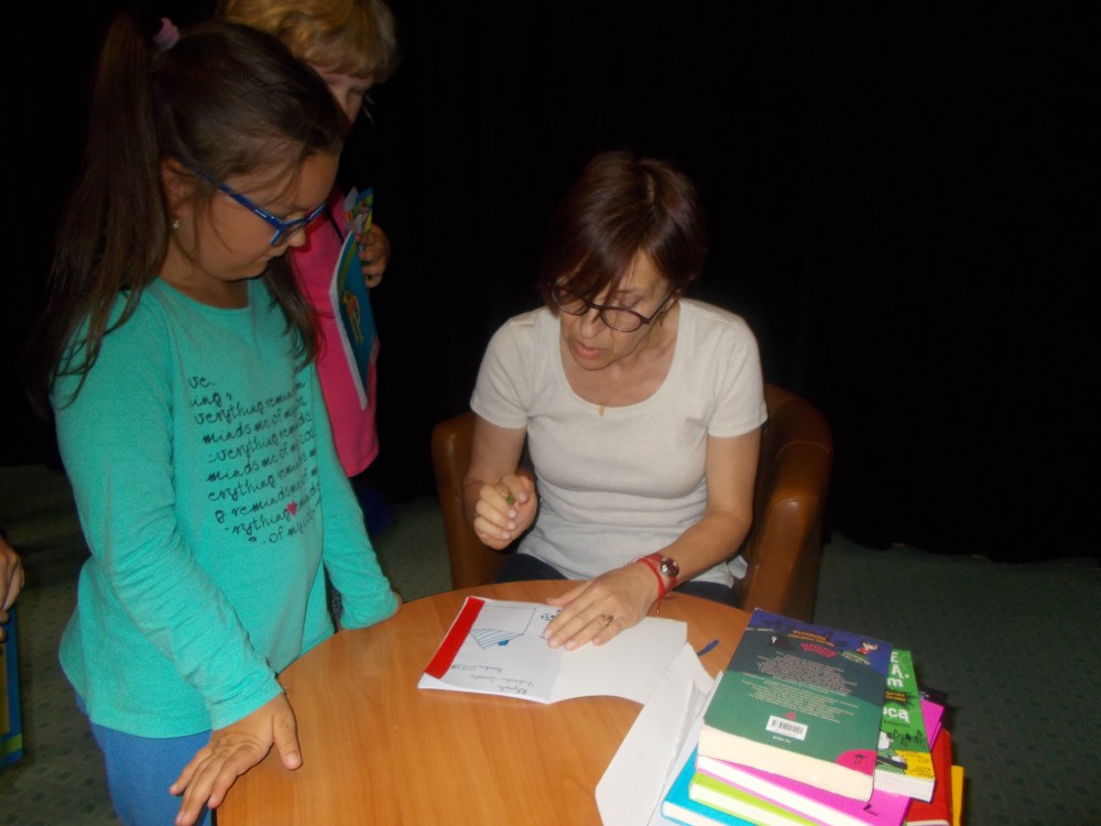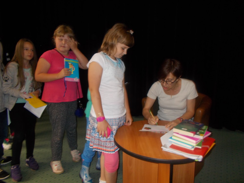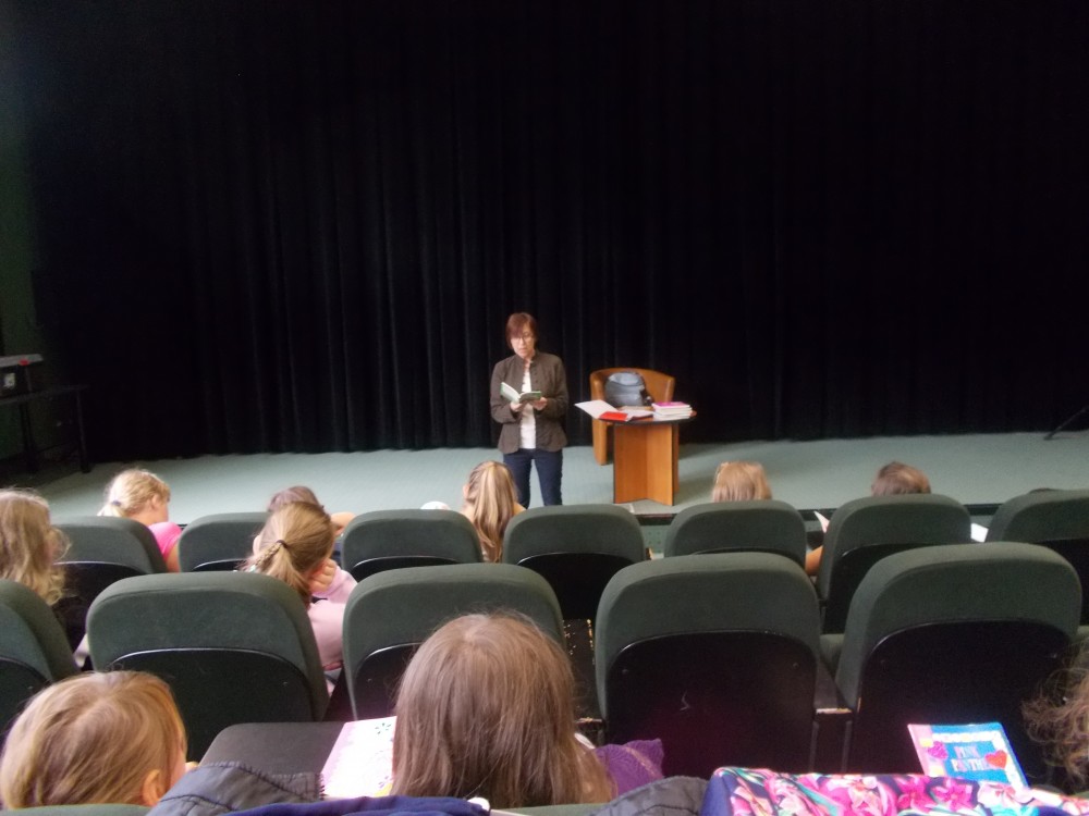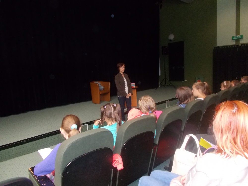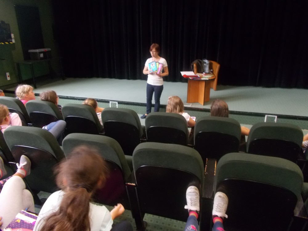 dzieci siedzą na widowni i słuchają opowieści pisarki