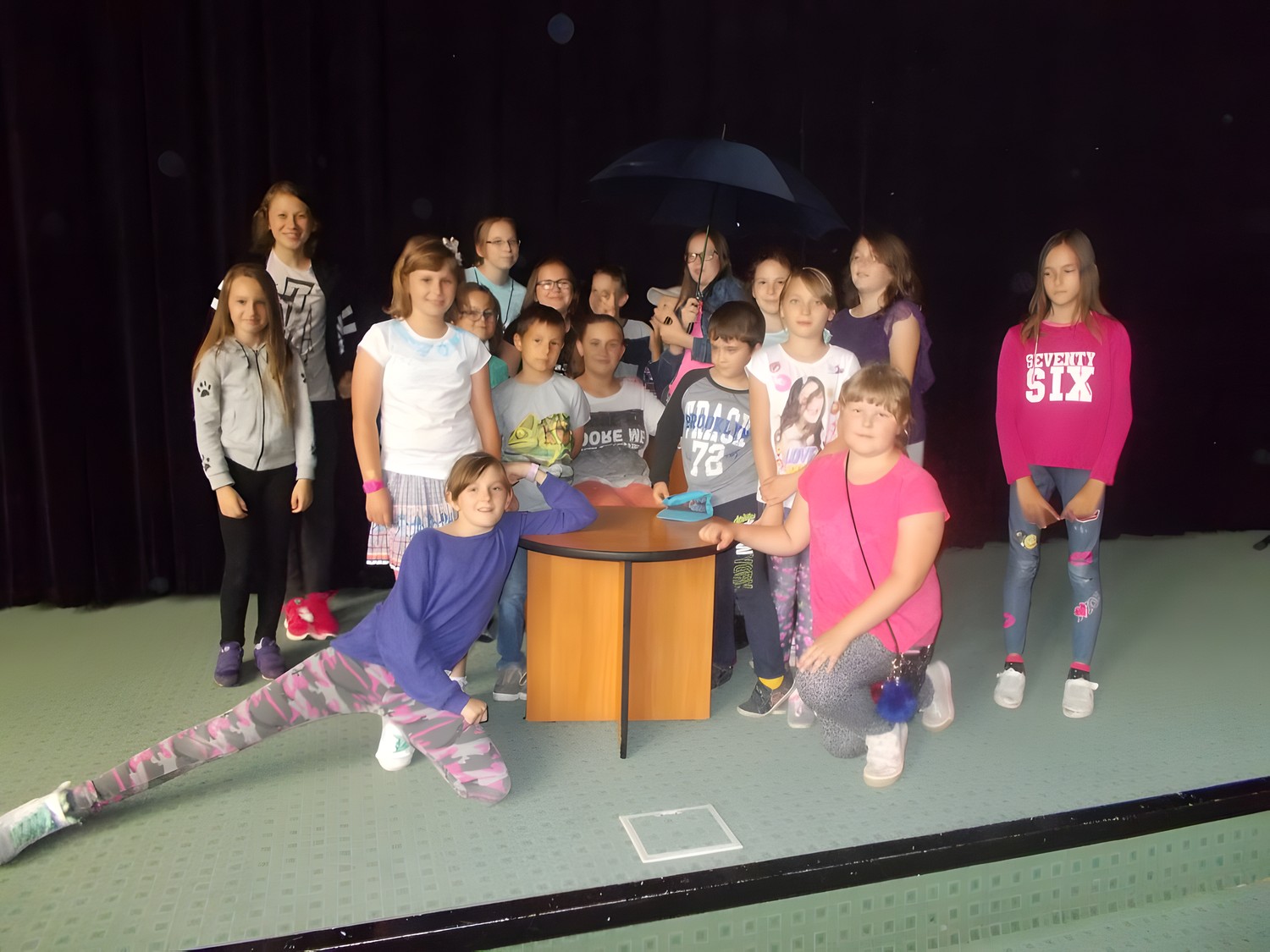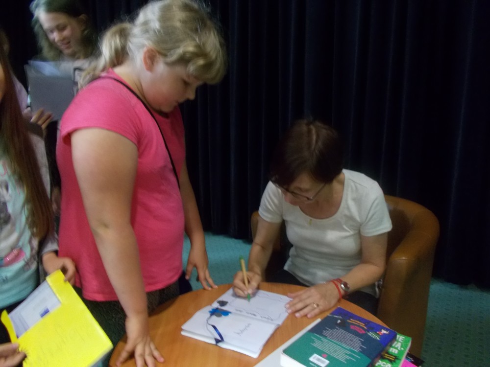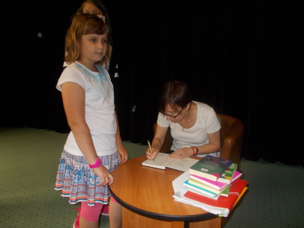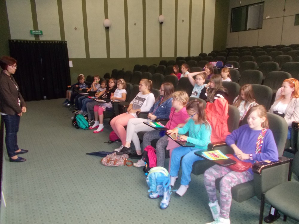 dzieci siedzą na widowni i słuchają opowieści pisarki