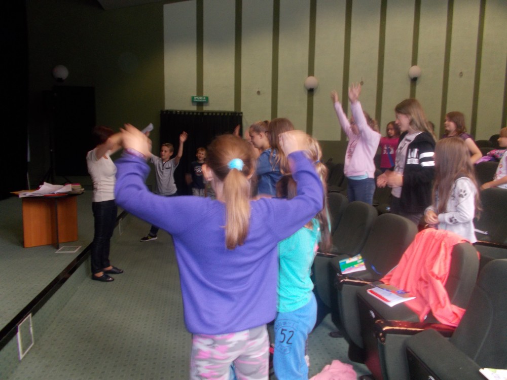 Pisarka wspólnie z dziećmi powtarzają ruchy do rymowanego tekstu