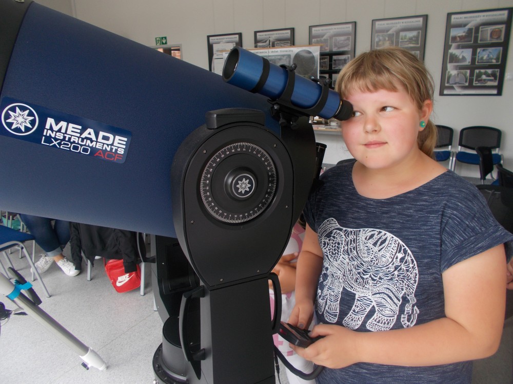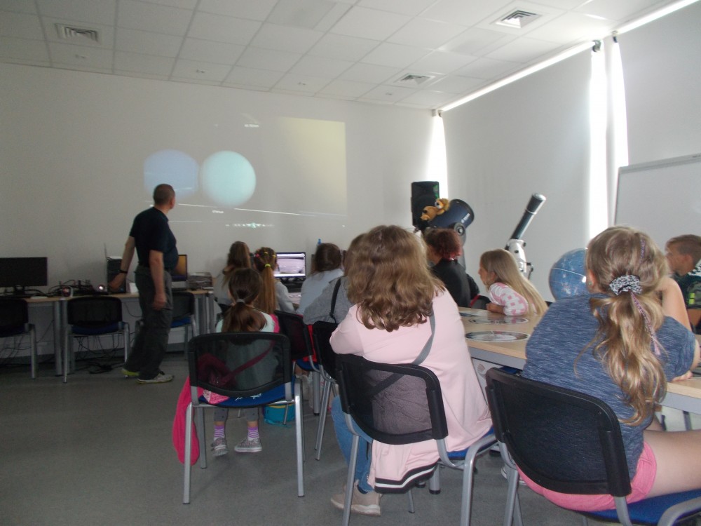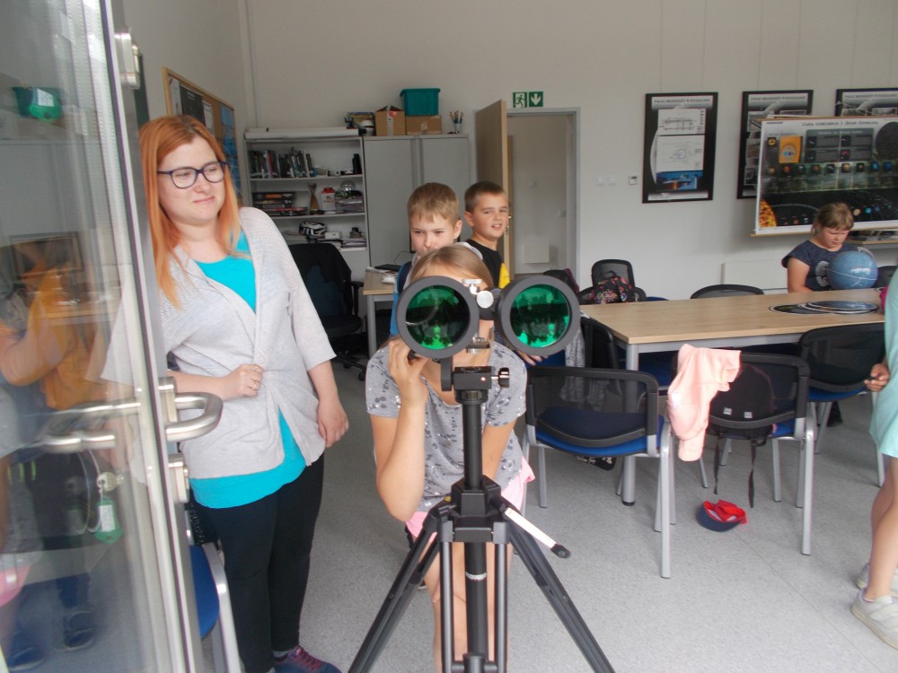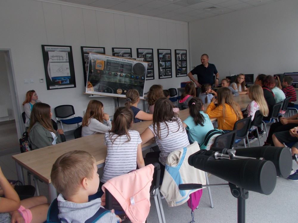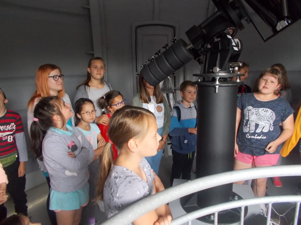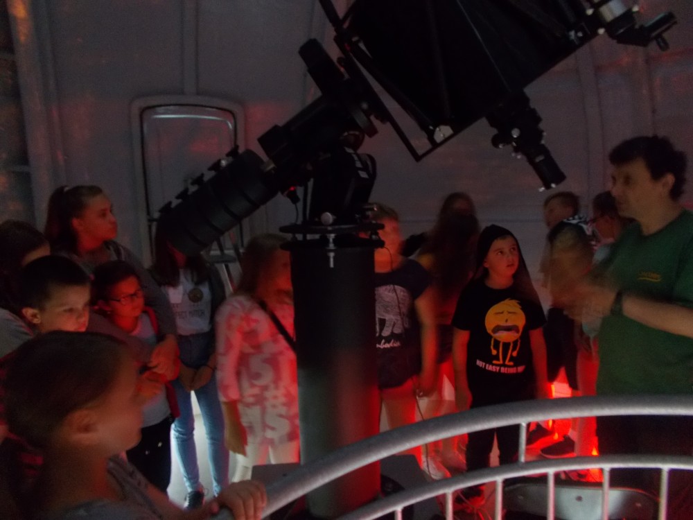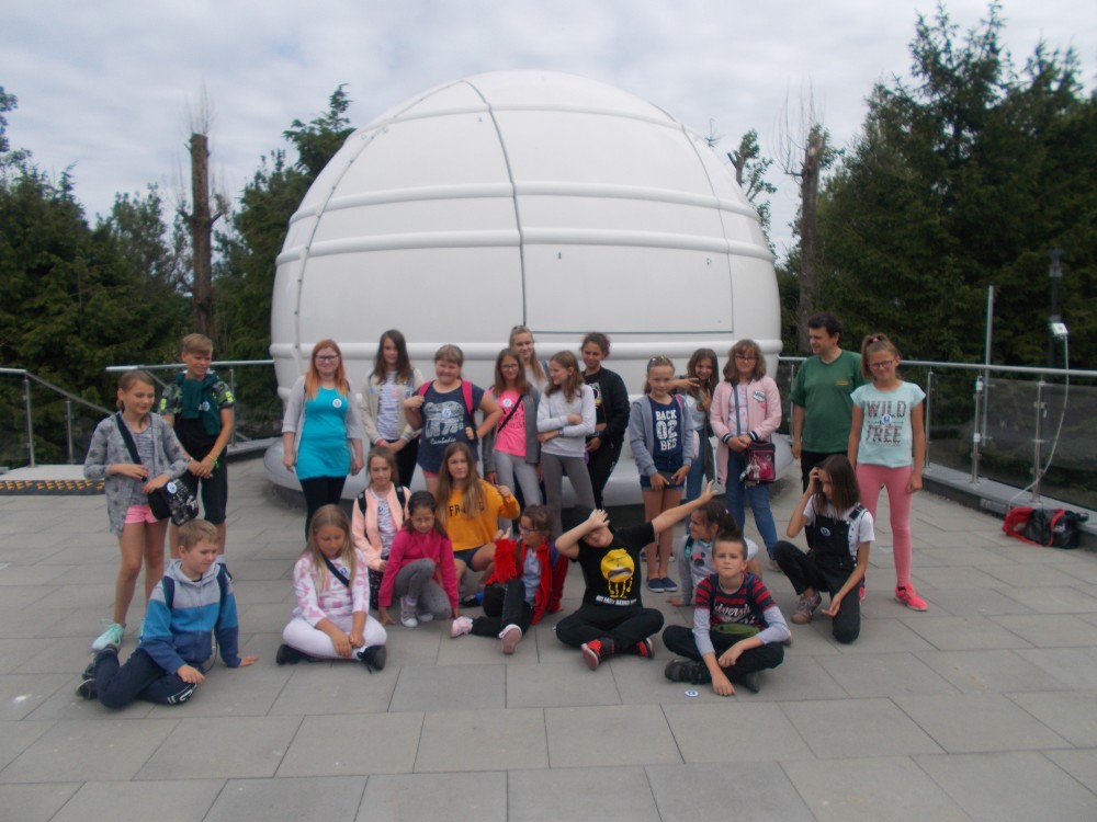 Drugiego dnia naszego wakacyjnego wypoczynku wybraliśmy się na wycieczkę do Obserwatorium Astronomicznego w Koszalinie. Dzieci miały okazję oglądać świat przez lornetki, lunety i teleskopy. Udało nam się nawet wejść na samą górę, do kopuły, w której mieści się główny teleskop. Dzieci z ciekawością odkrywały fakty o otaczającym nas wszechświecie. Okazało się, że wśród uczestników naszych zajęć są dzieci, które mają dużą wiedzę o kosmosie i marzą o zawodzie astronauty. Na zakończenie pobytu dzieci otrzymały odznakę małego astronauty. To był bardzo udany dzień.