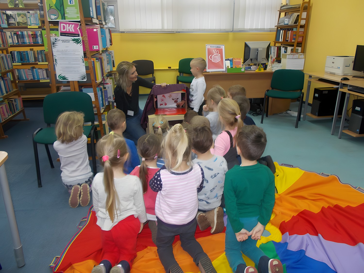 Piątkowa wizyta ,,Lisków” z Przedszkola nr 13 w Koszalinie odbyła się w świątecznym nastroju. Dzieci wysłuchały opowiadania ,,Święta z Zosią i Stasiem”, a następnie wzięły udział w zabawie, podczas której ich zadaniem było odgadywanie za pomocą dotyku przedmiotów kojarzących się ze Świętami Bożego Narodzenia.