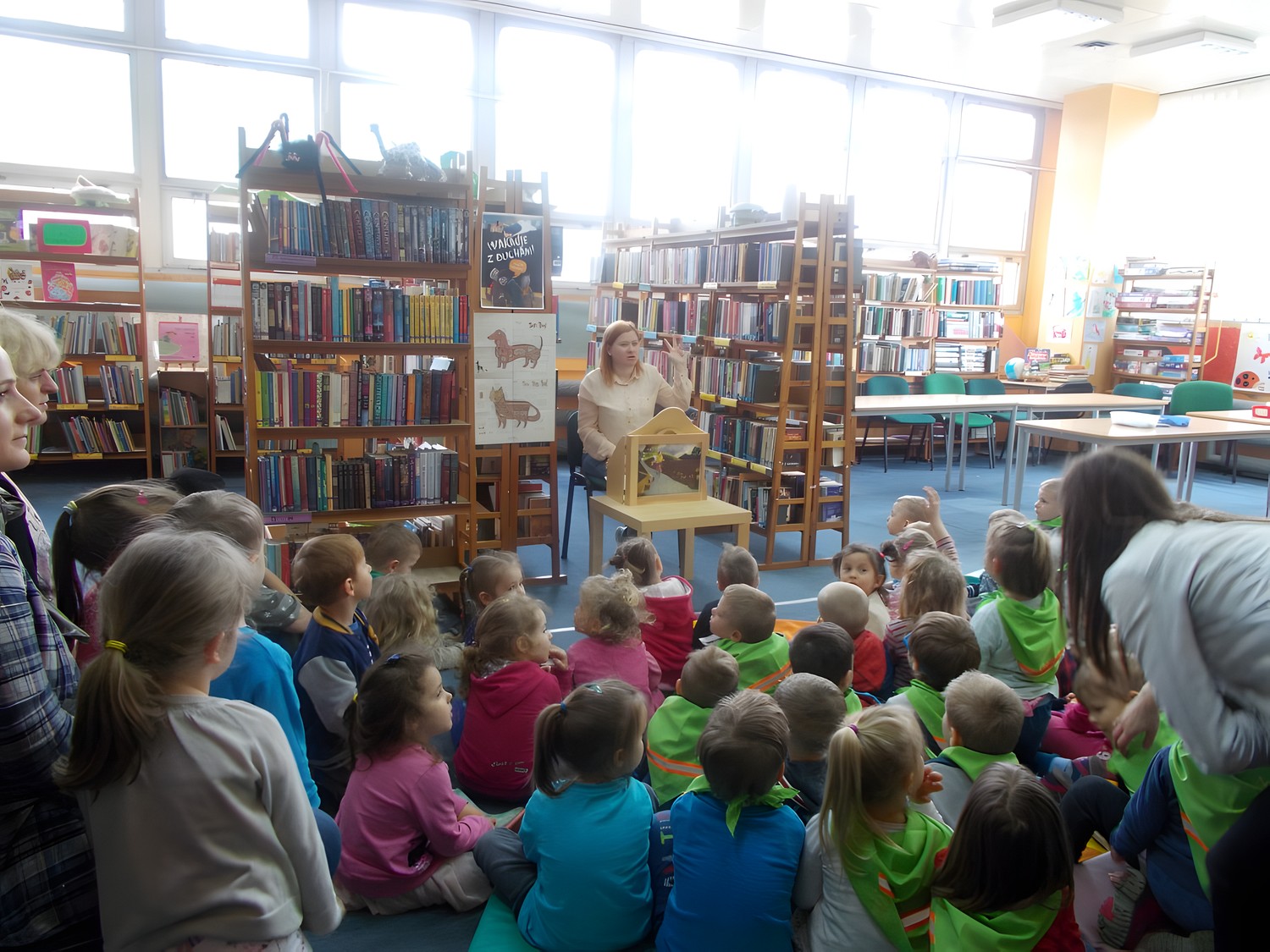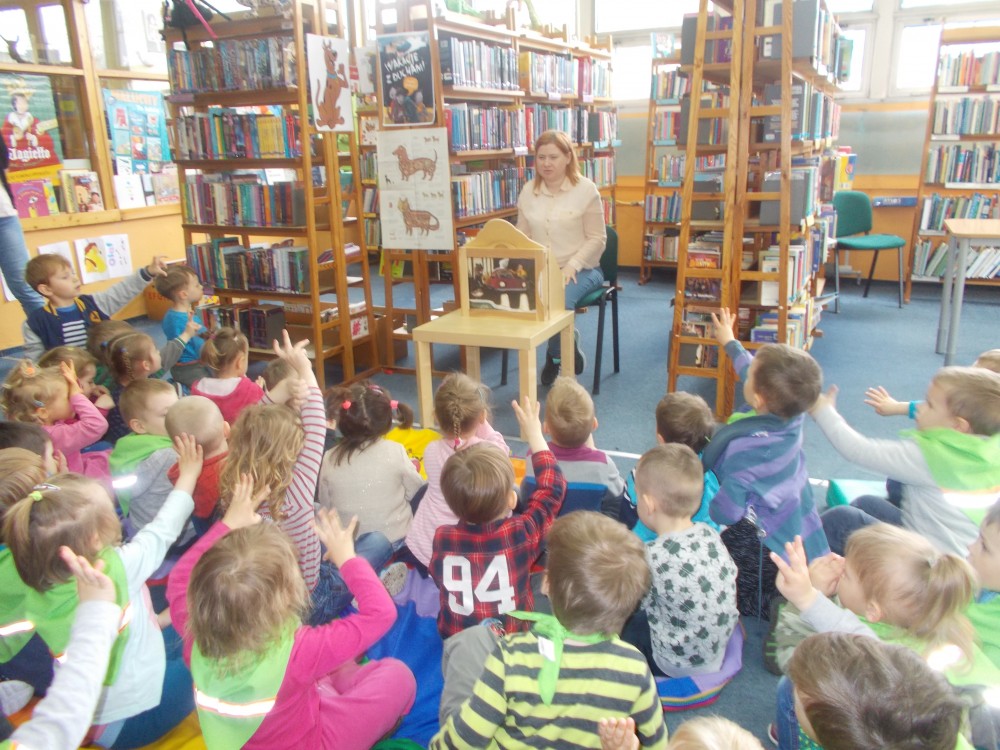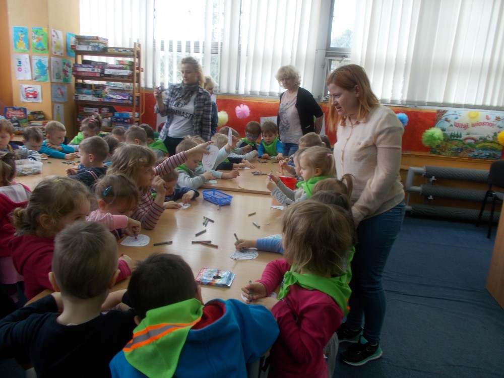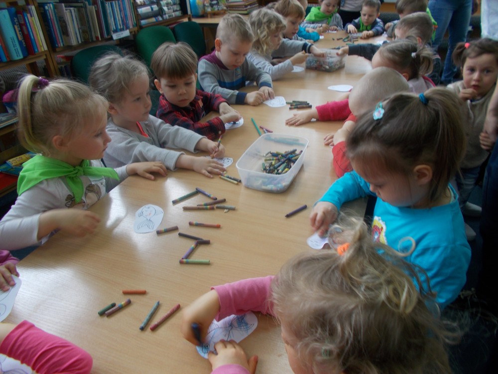 W czwartek, kolejnego już dnia Tygodnia Bibliotek, odwiedziły nas dwie grupy trzylatków z Przedszkola nr 13 w Koszalinie: Sówki i Skrzaty. Dzieci uważnie wysłuchały historii „Rower Walentynki” przedstawionej za pomocą teatrzyka kamishibai, kolejno wyliczając zwierzęta, które zabrała ze sobą dziewczynka. Dzieci uwielbiają rysować, co udowodniły kolorując zwierzęta występujące w poznanej historii. Na koniec wizyty wśród kolorowych postaci bajkowych przedszkolaki otrzymały słodką niespodziankę.