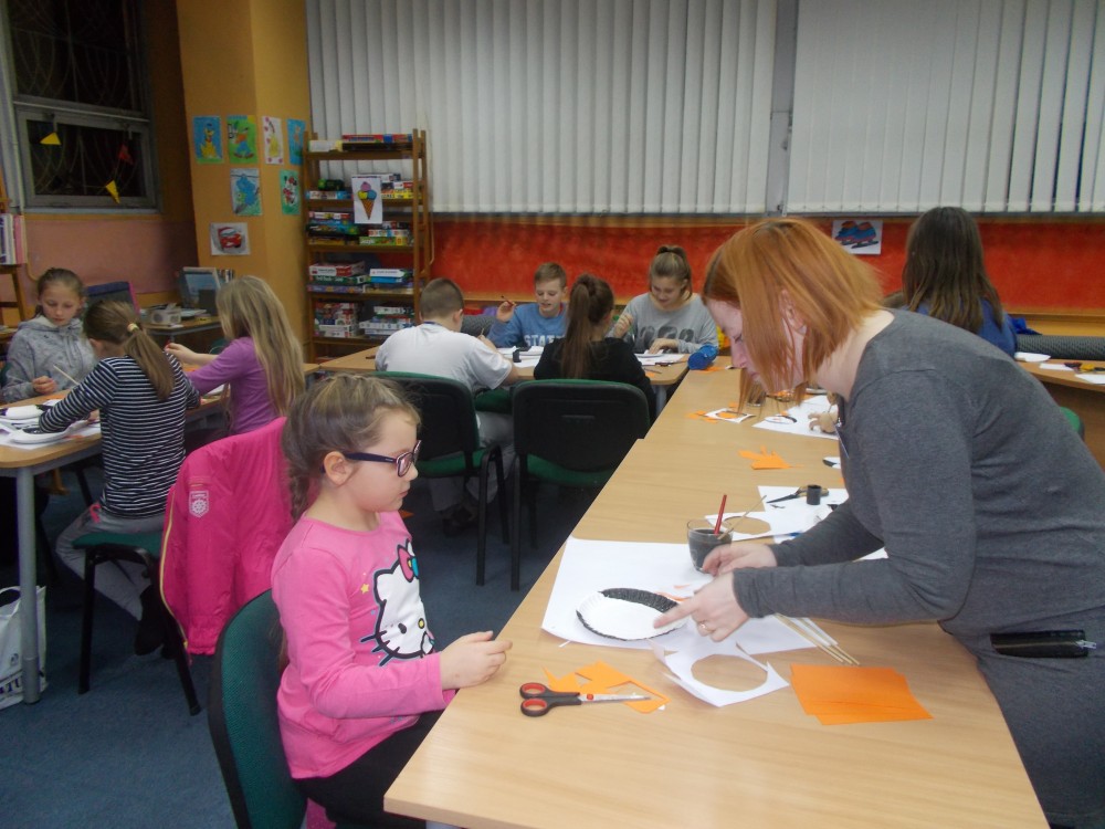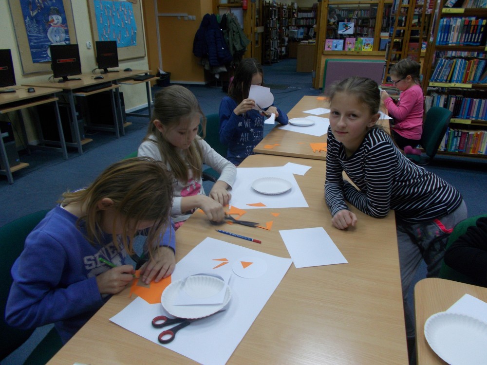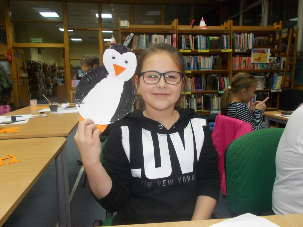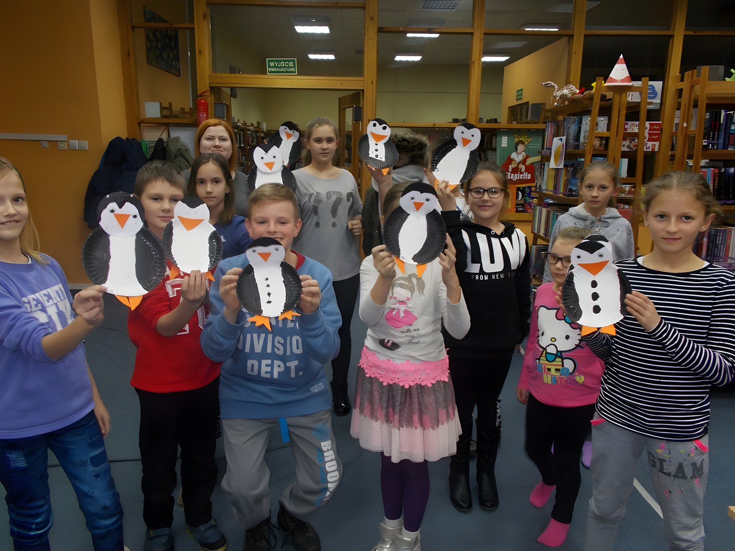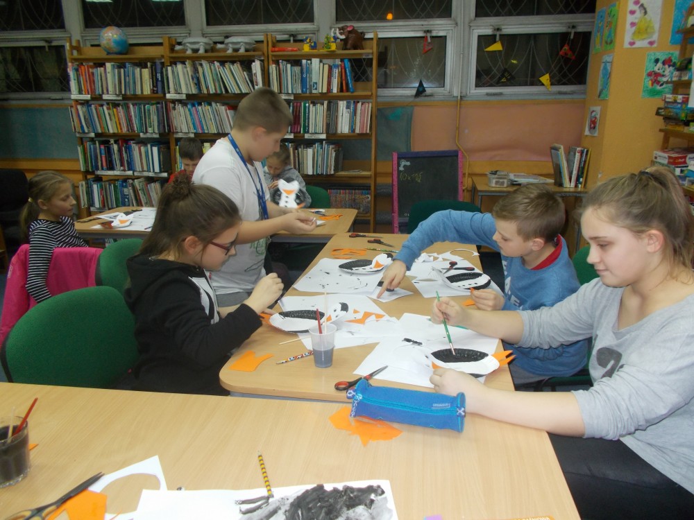Jak co czwartek, 19 stycznia spotkaliśmy się na naszych zajęciach literacko-plastycznych. Tym razem naszą uwagę przykuły pingwiny. Rozwiązywaliśmy bajkę matematyczną, słuchaliśmy ciekawostek o pingwinach, a także czytaliśmy fragment przygód pt. „Mały pingwin Pik-Pok” Adama Bahdaja. Następnie dzieci wykonały wesołe pingwiny, które wiszą na wystawie w naszej bibliotece. Zajęcia zakończyliśmy zabawą ruchową „O jak przyjemnie i jak wesoło w pingwina bawić się”.