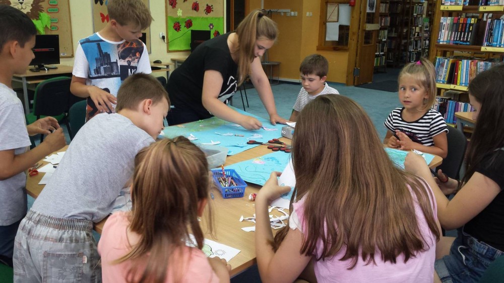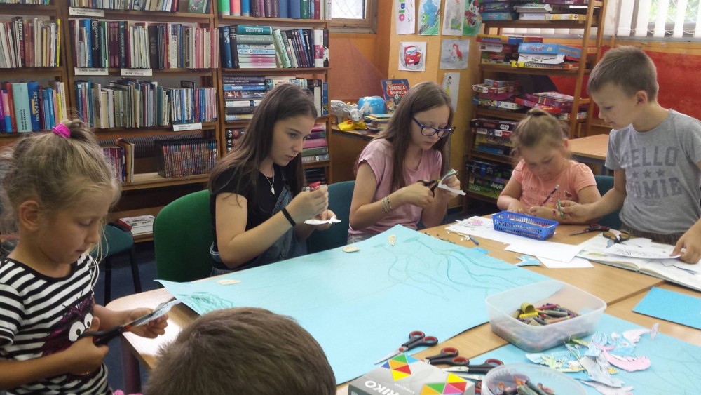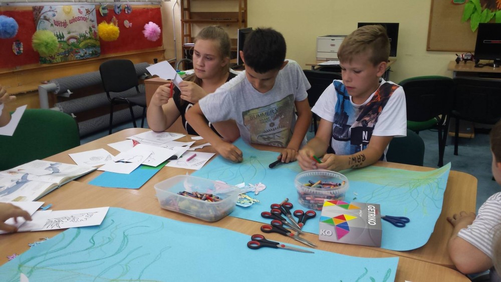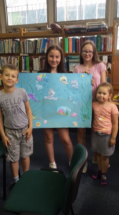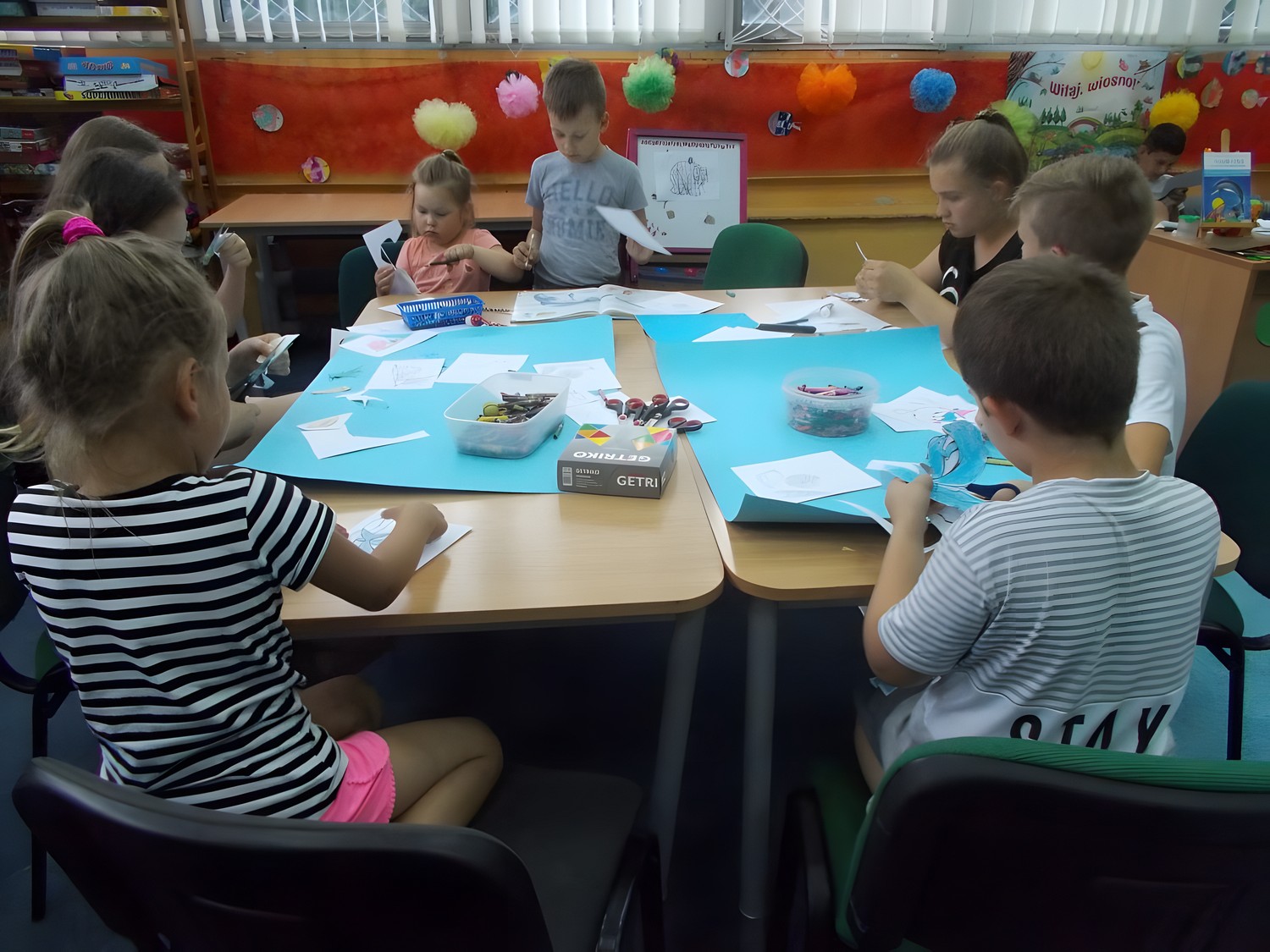 Tematem przewodnim naszych ostatnich przed wakacjami zajęć były delfiny i ich zwyczaje. Dzieci poznały przygody „Tomka i Oli w krainie delfinów” A. Michałowskiej. Następnie uczestnicy naszych zajęć, podzieleni na drużyny szukały w książkach i w Internecie informacji o delfinach, a także tworzyły oceanarium. Zaczęły się już wakacje, więc nie zabrakło ulubionych zabaw „Pif-paf” czy „oczko”. Następne spotkania popołudniowe już we wrześniu.