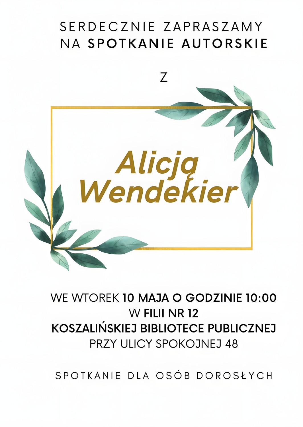 W ramach Tygodnia Bibliotek serdecznie zapraszamy na spotkanie autorskie z Alicją Wendekier, koszalińską pisarką i poetką. Pani Alicja jest autorką książek, zarówno dla dzieci i dorosłych. Tym razem autorka kieruje swoje spotkanie dla dorosłych czytelników. Spotkanie odbędzie się we wtorek, 10 maja 2022 roku w naszej filii nr 12 przy ulicy Spokojnej 48. Nie może Państwa zabraknąć!