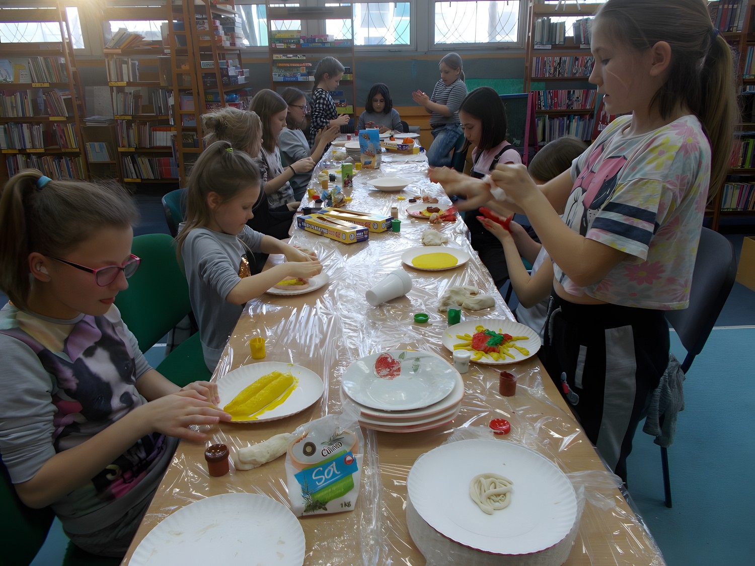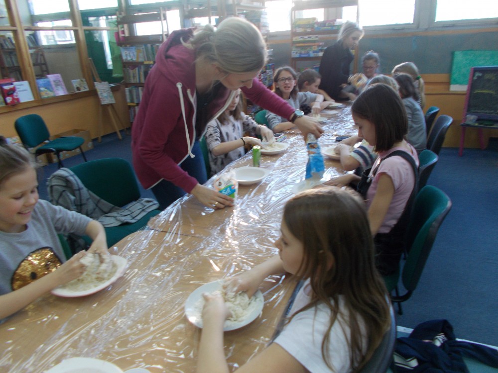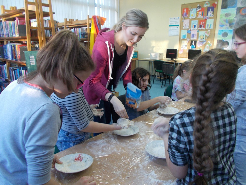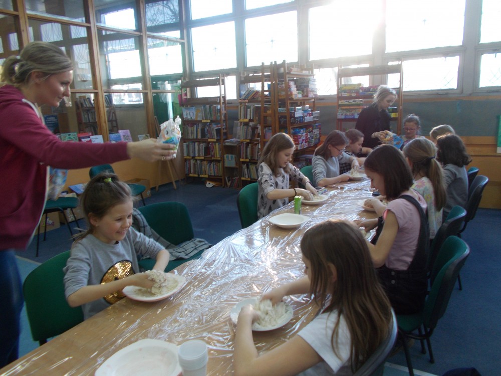 W czwartkowe popołudnie biblioteka przemieniła się w wykwintną restaurację, w której znakomici, mali szefowie kuchni podawali wyśmienicie prezentujące się dania. Wszystko za sprawą masy solnej, która rozbudziła wyobraźnię i posłużyła do stworzenia różnych potraw. Uczestnicy spierali się, jaka kuchnia jest najlepsza, w wyniku czego powstało międzynarodowe menu.