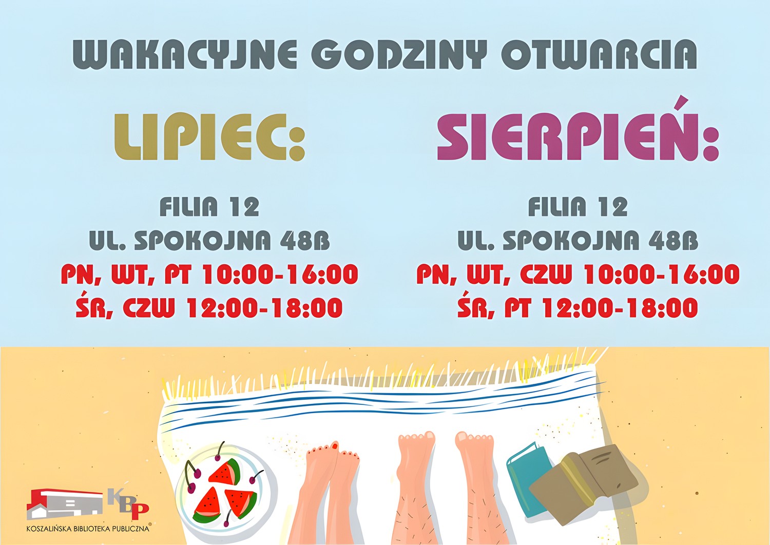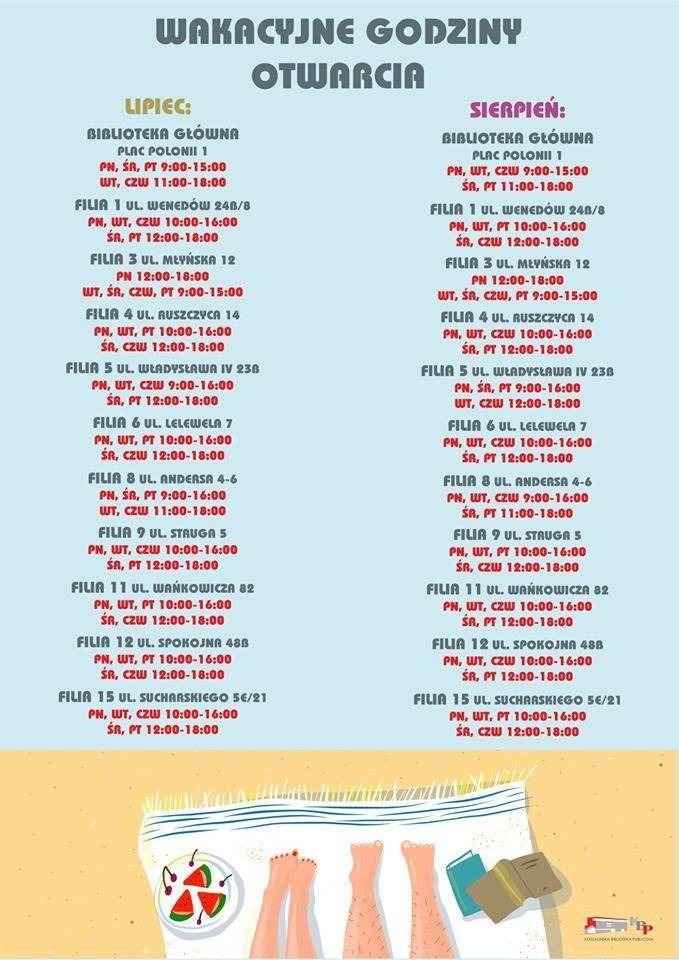 W okresie Wakacji wprowadzone zostały zmiany godzin pracy biblioteki .