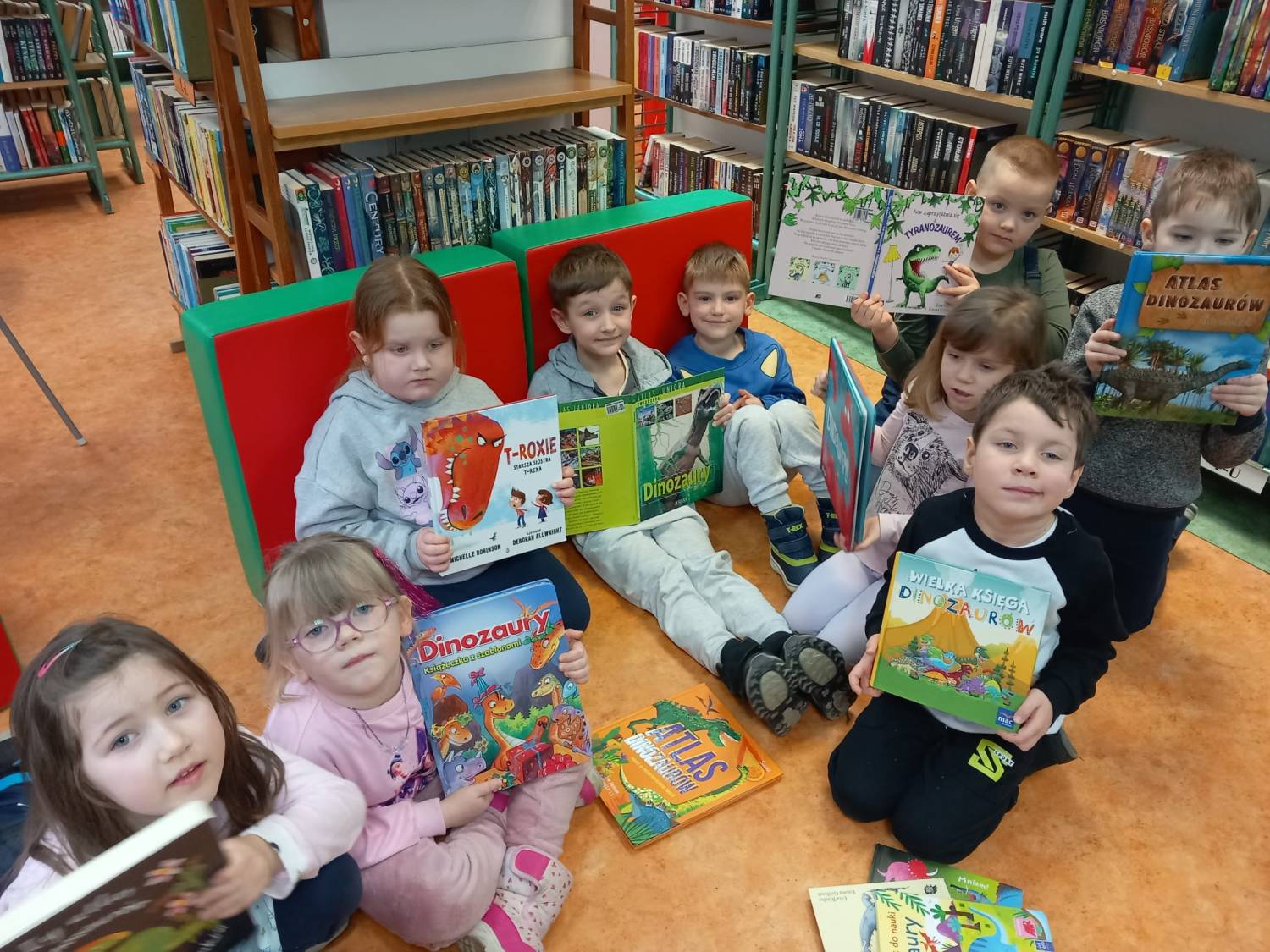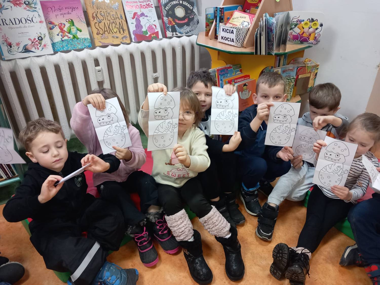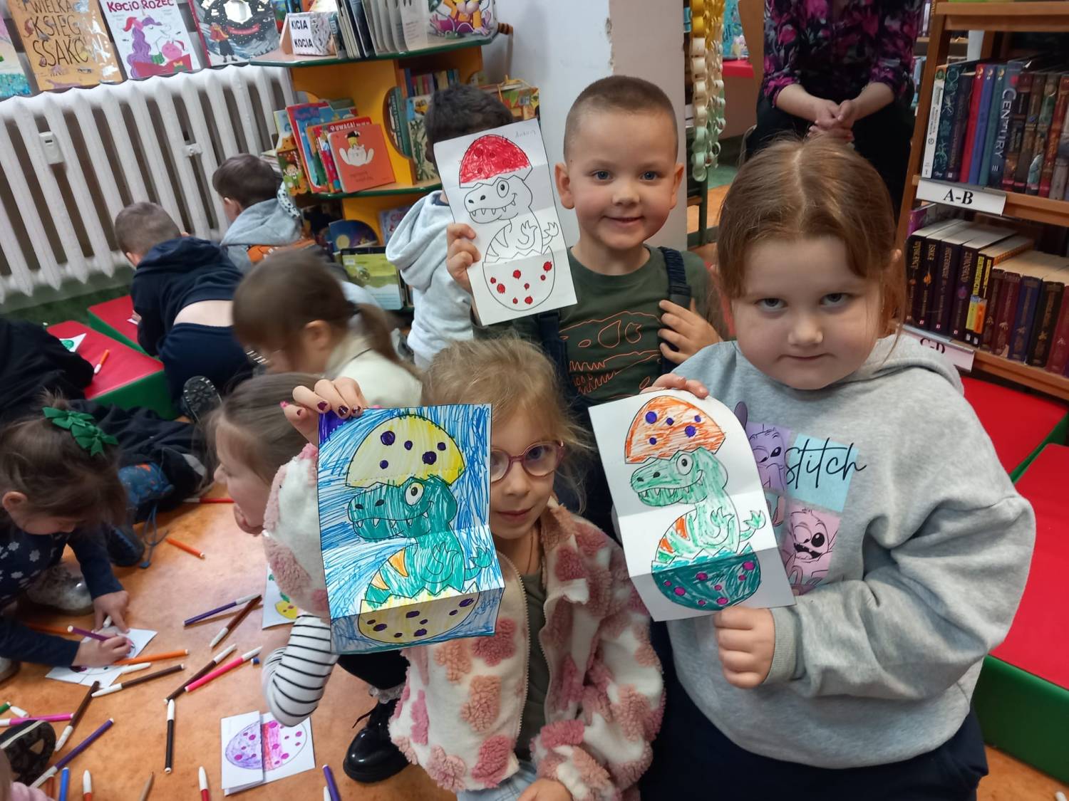 Dzisiaj w naszej filii wspólnie z „Sówkami” z przedszkola nr 23 w Koszalinie obchodziliśmy Dzień Dinozaura, który w tym roku wypada 26 lutego. Na dzieci czekało wiele zadań. Przypomnieliśmy sobie nazwy wszystkich dinozaurów a następnie poznaliśmy nazwy wielu ptaków które tak jak dinozaury wykluwają się z jaj. Przedszkolaki z radością wysłuchały książkę pt. „ T- Roxie, starsza siostra T-Rexa”, a na zakończenie spotkania pokolorowali własne podobizny T-Rexa i T-Roxie. Dziękujemy za odwiedziny i zapraszamy wraz z rodzicami do biblioteki.