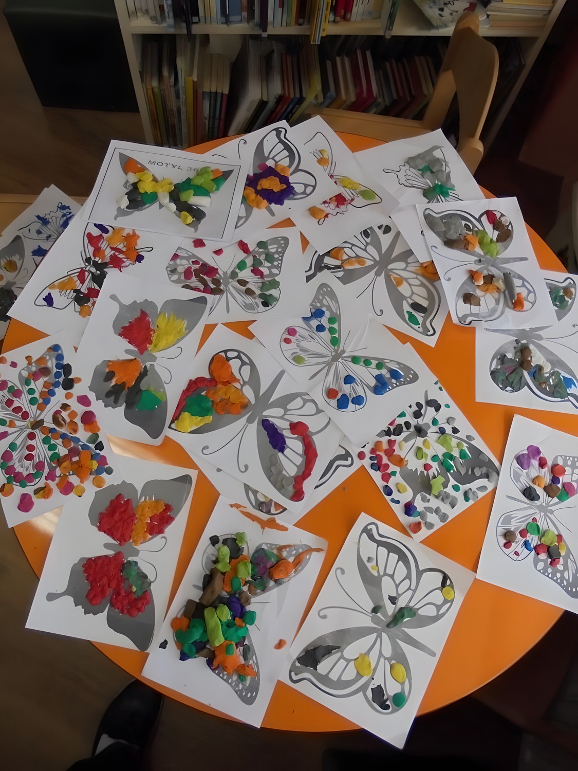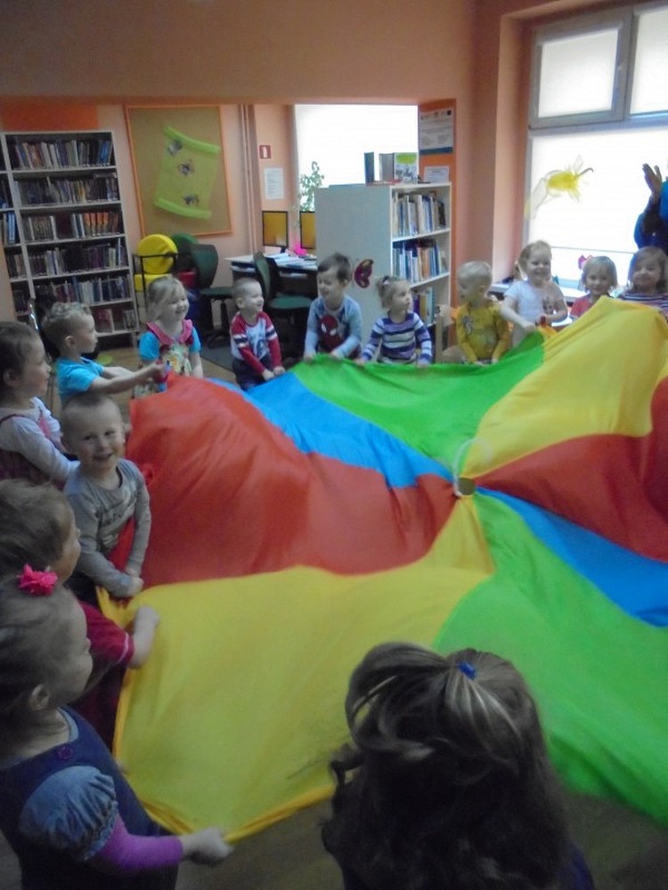 Dzisiaj było u nas kolorowo i wesoło, bo przybyła do nas grupa „Biedronek", dzieci 3-4 letnich z Przedszkola Happy Days. Przedszkolaki w wiosennym nastroju bawiły się z nami, były tańce z chusteczkami, jak i wylepianie bajecznych motyli. Tradycyjnie nie mogło zabraknąć zabaw z książką.