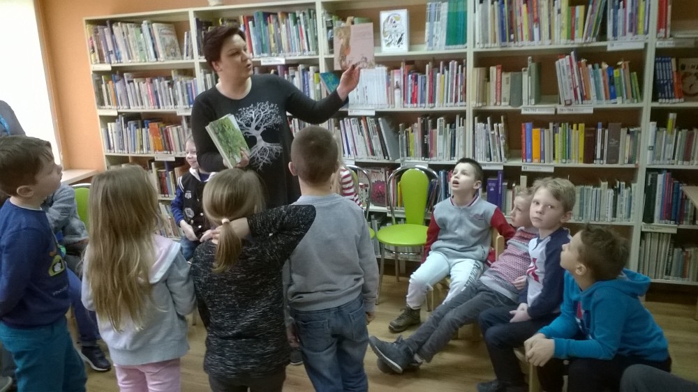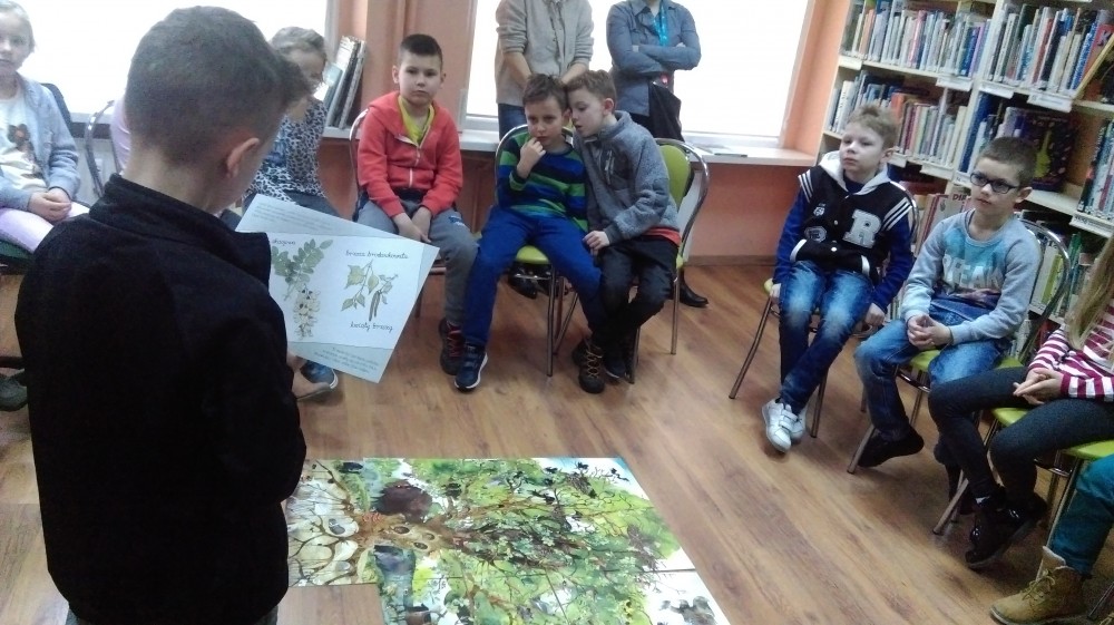 Kolejne spotkanie z uczniami klasy II „b” Szkoły Podstawowej nr 1. Spotkanie rozpoczęliśmy od prezentacji ciekawych książek, okazało się, że dzieci lubią zwierzęta i o takich właśnie książkach najwięcej rozmawialiśmy. Poznali również nietypową książkę, w formie osobnych kart, Katarzyny Bajerowicz „Drzewo”, by następnie z tych kart ułożyć drzewo. Mogli się także dowiedzieć jakie zwierzęta leśne w nim zamieszkują. Zabawą w „Ąse madonse” zakończyliśmy spotkanie.