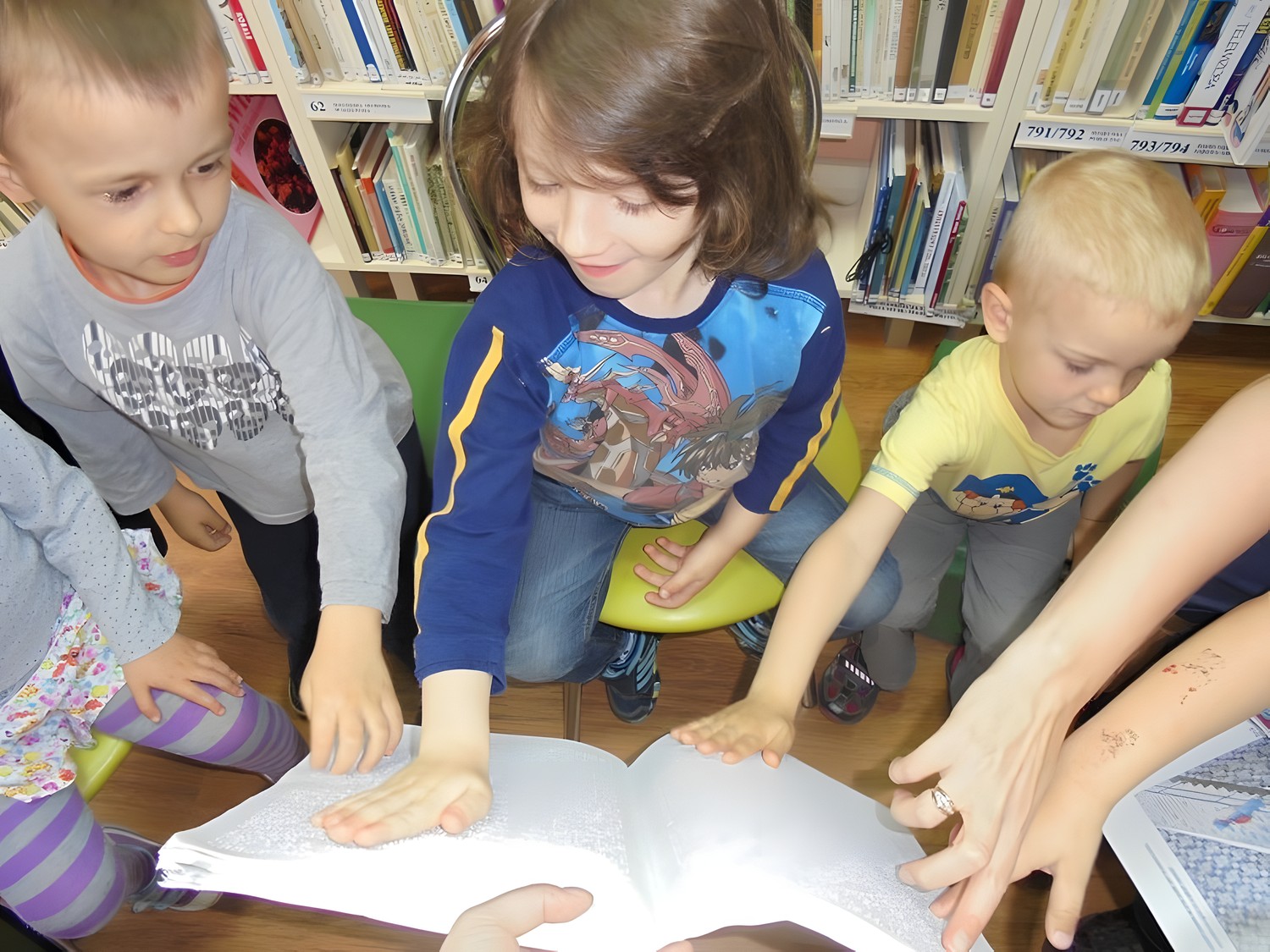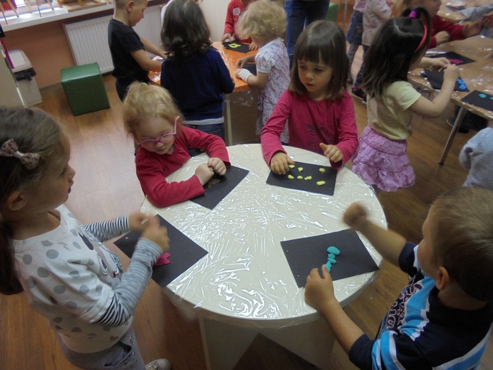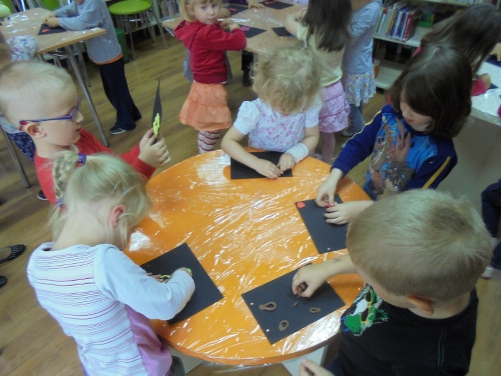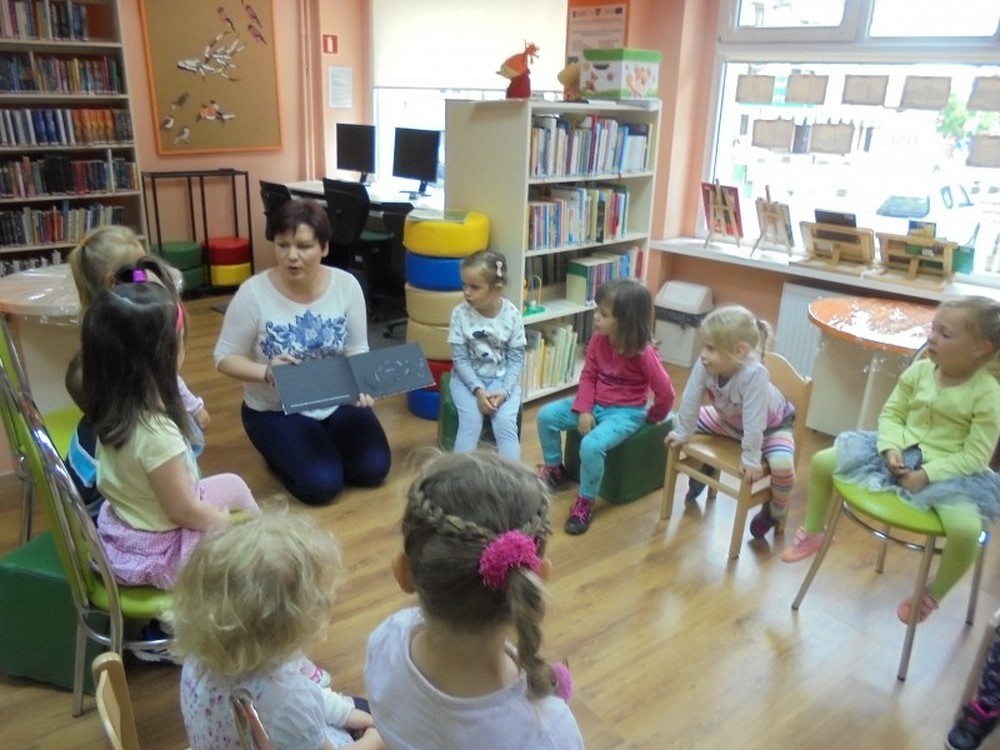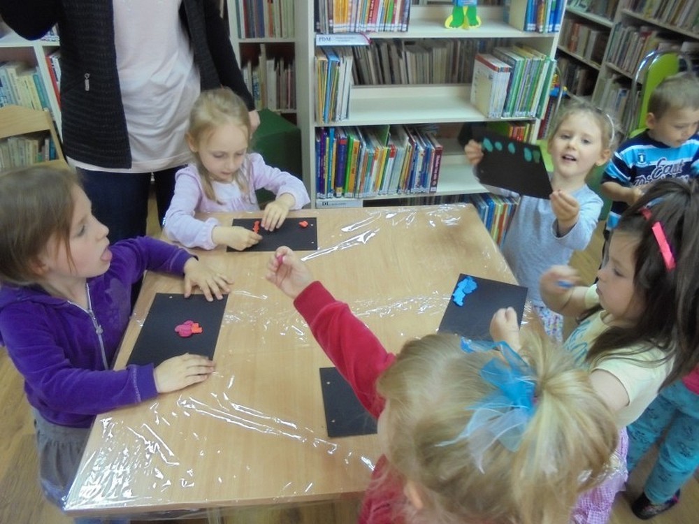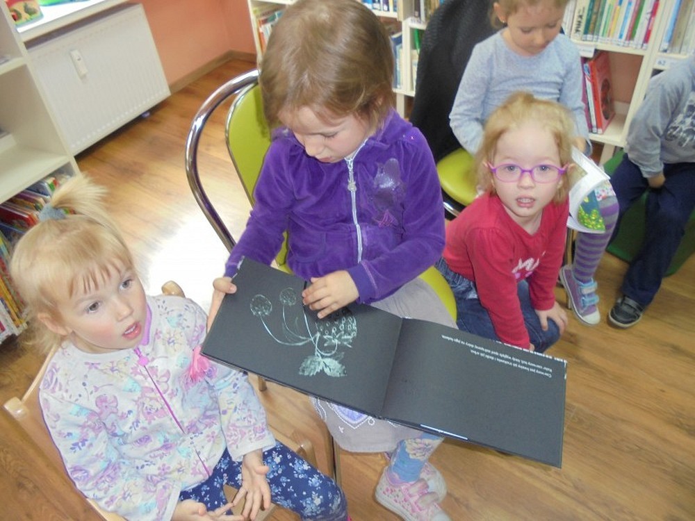 Na spotkanie z niewidomym Tomkiem przybyły 4- letnie „Pszczółki" z Przedszkola „Happy Days". Podczas spotkania dzieci zapoznały się z tematem tolerancji, inności, a także wcieliły się w postać osoby niewidomej. Zadaniem przedszkolaków było rozpoznanie po głosie swoich kolegów oraz niektórych przedmiotów poprzez dotyk, ale z zakrytymi oczami. Na zakończenie zajęć dzieci wykonały własną Czarną Książkę Kolorów.