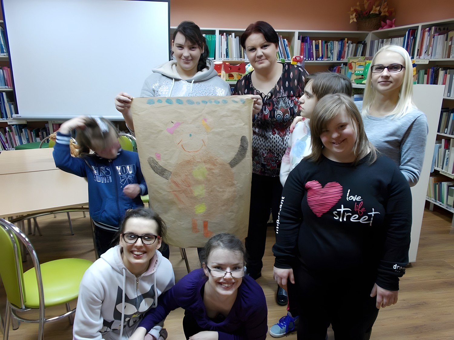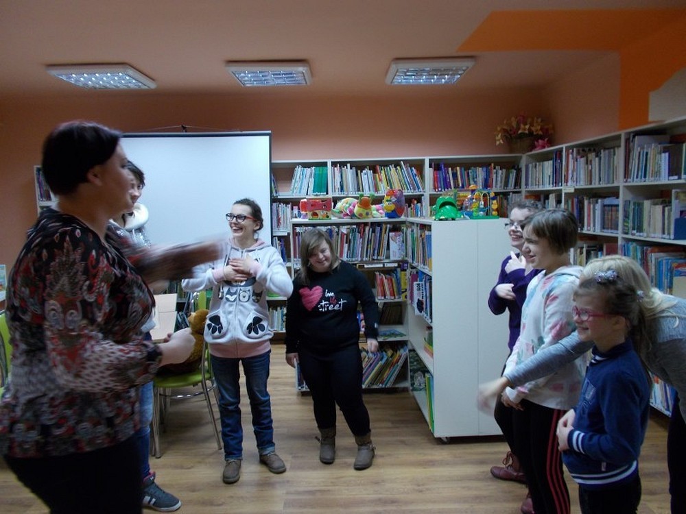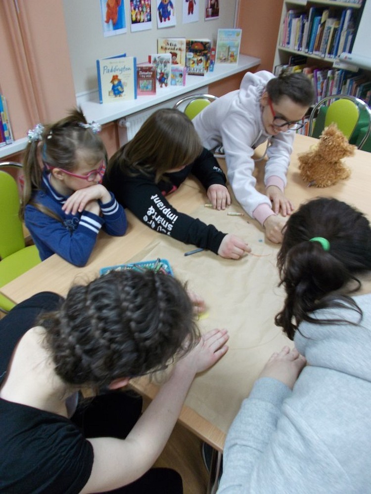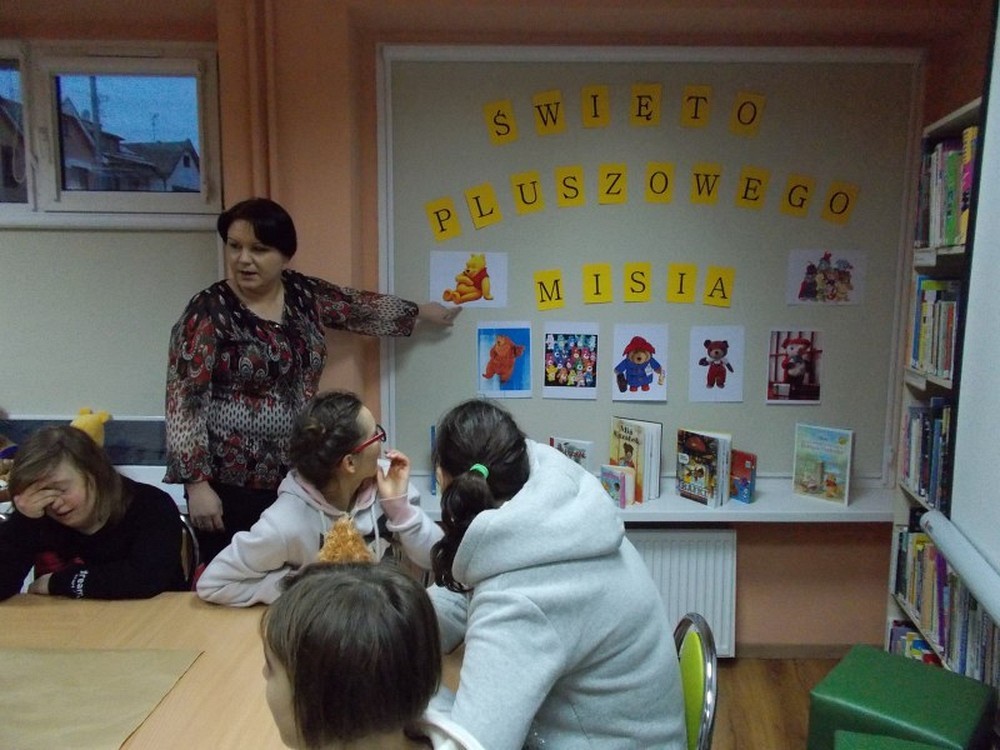 Nasz sprytny miś przygotował dla naszych bibliotecznych już podopiecznych Specjalnego Ośrodka Szkolno-Wychowawczego nie lada zadania do wykonania. W związku z jego świętem nasze dziewczyny wraz z Panią Małgosią z zaciekawieniem zabrały się do ich wykonania. Miś nasz prosił by m. in. wykonały piosenkę na jego cześć, narysowały jego portret, pobawiły się i obudziły starego niedźwiedzia ze snu oraz wyraziły okrzykiem na ganku biblioteki jak bardzo kochają misie. Wszyscy świetnie się bawili razem z misiem, bo kto jak nie my wszyscy będziemy pamiętać o misiowym święcie.