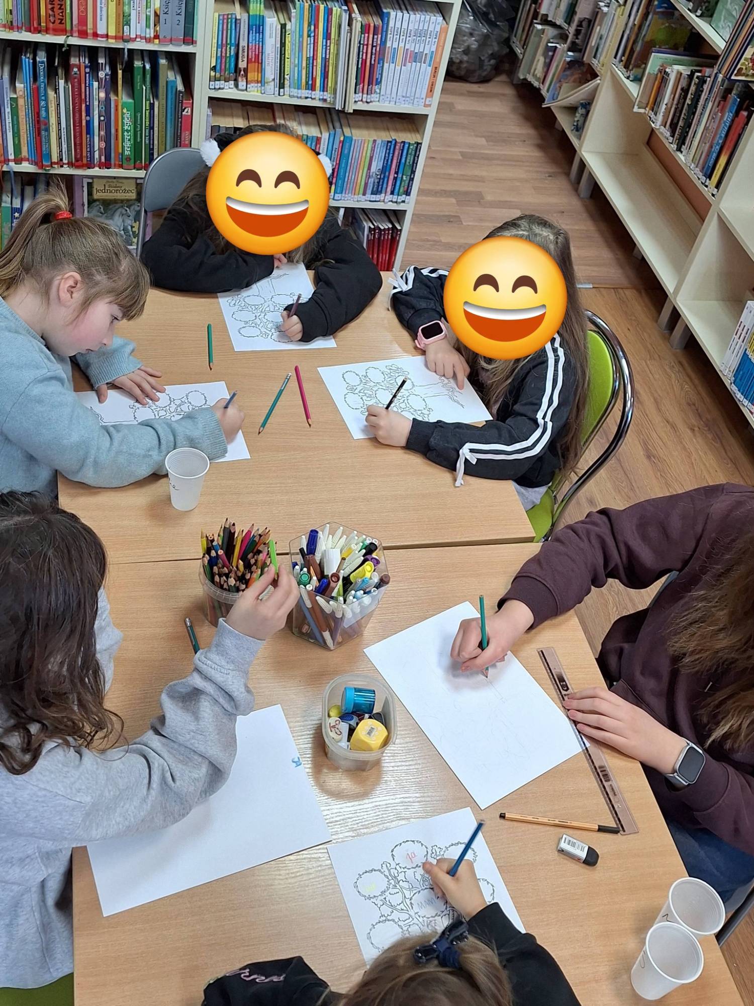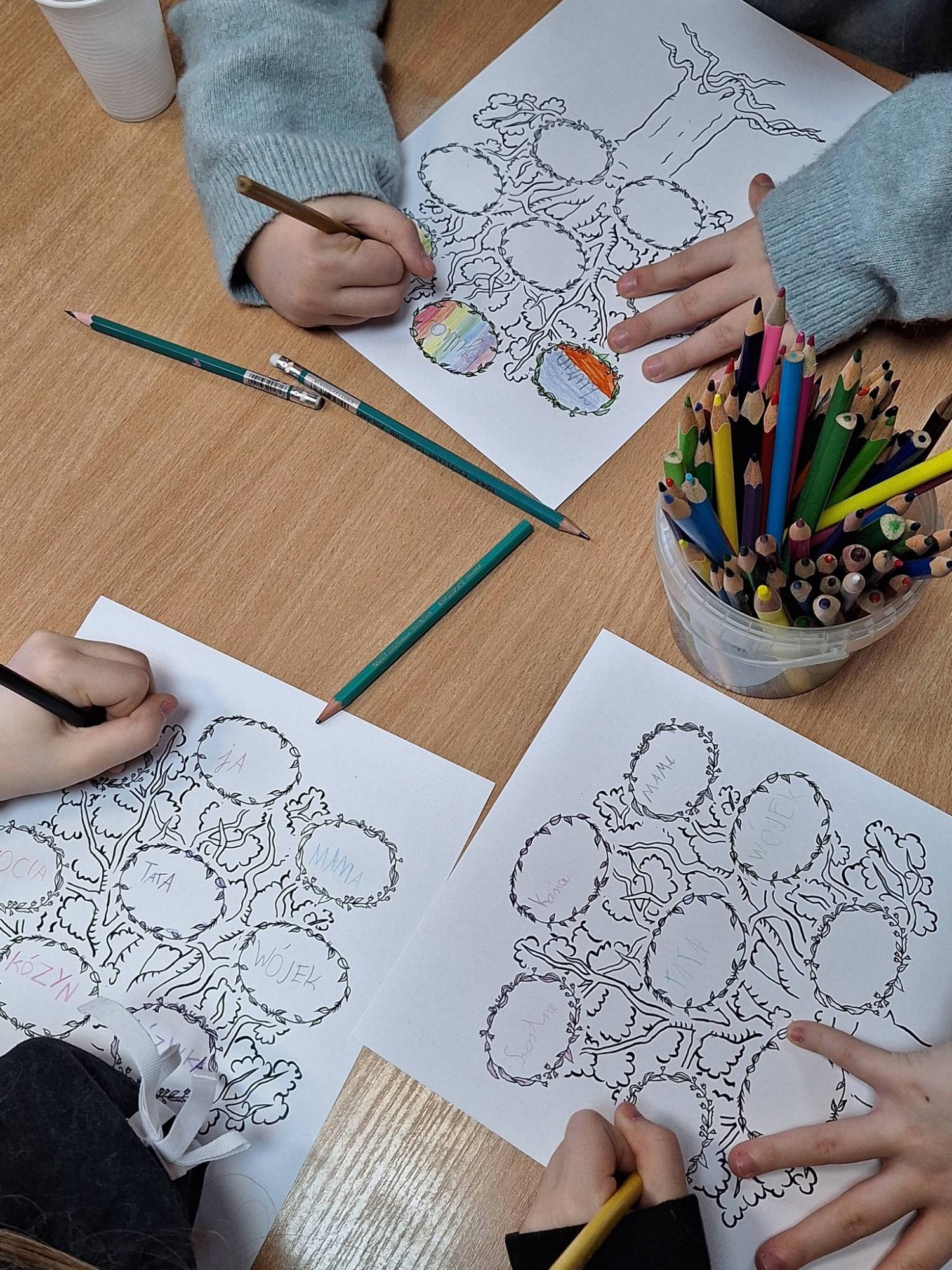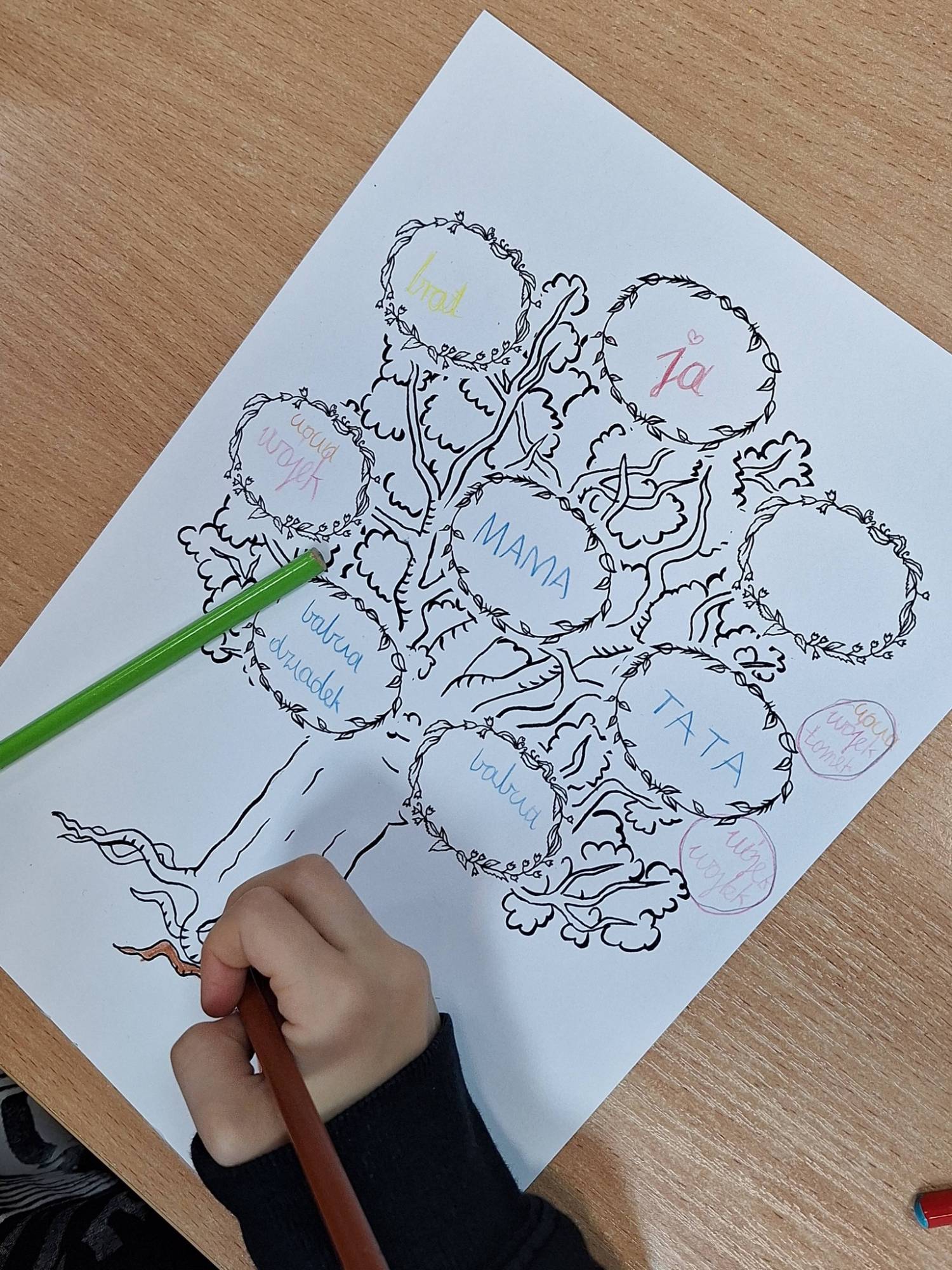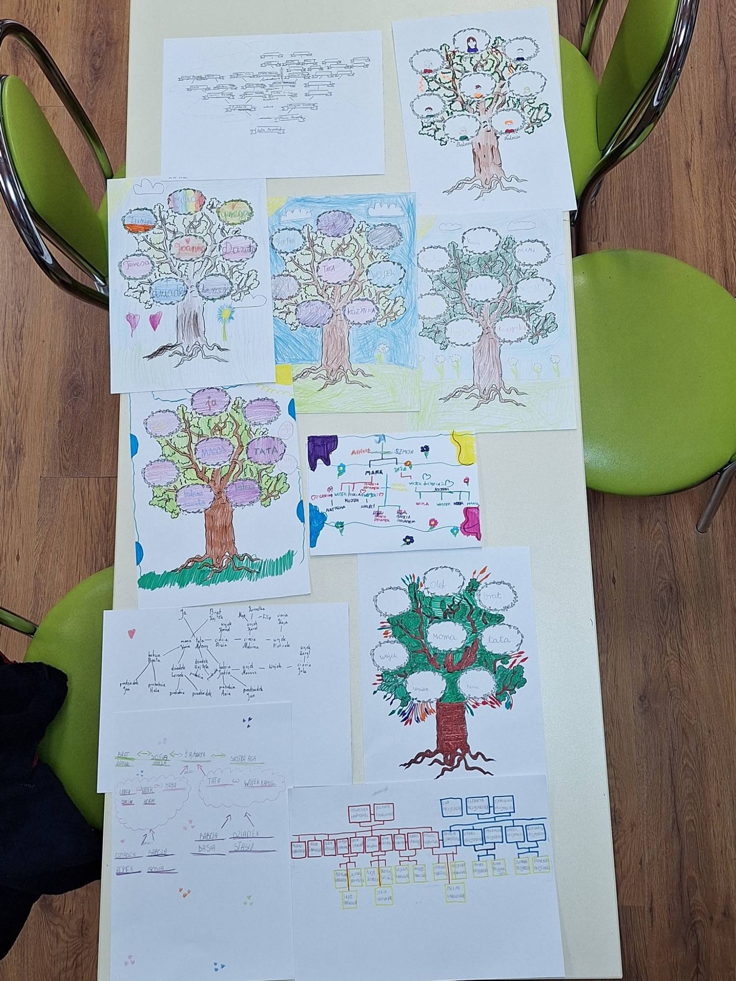 W nawiązaniu do tematu pani Lucyna opowiedziała dzieciom o tym jak dużo trzeba poświęcić czasu i cierpliwości, aby spisać dzieje swojej rodziny. Przybliżyła dzieciom historyjki, opowieści i informacje o swoim rodzie opisane w swojej książce. Nasi uczestnicy Bezpiecznych Ferii wykonali drzewa genealogiczne swoich rodzin.