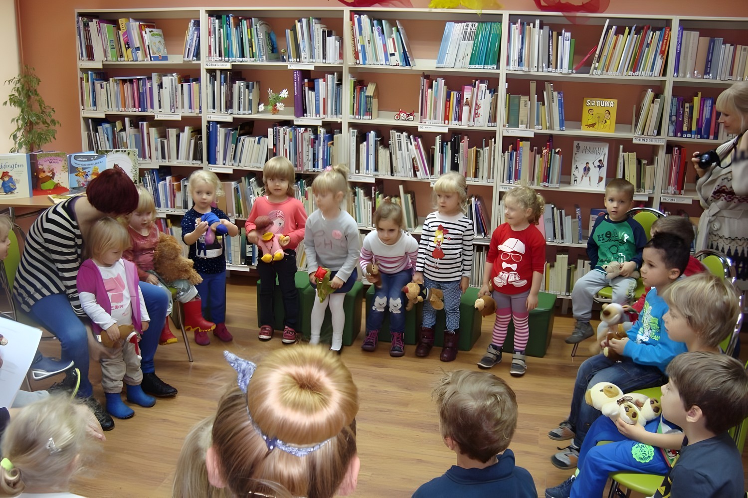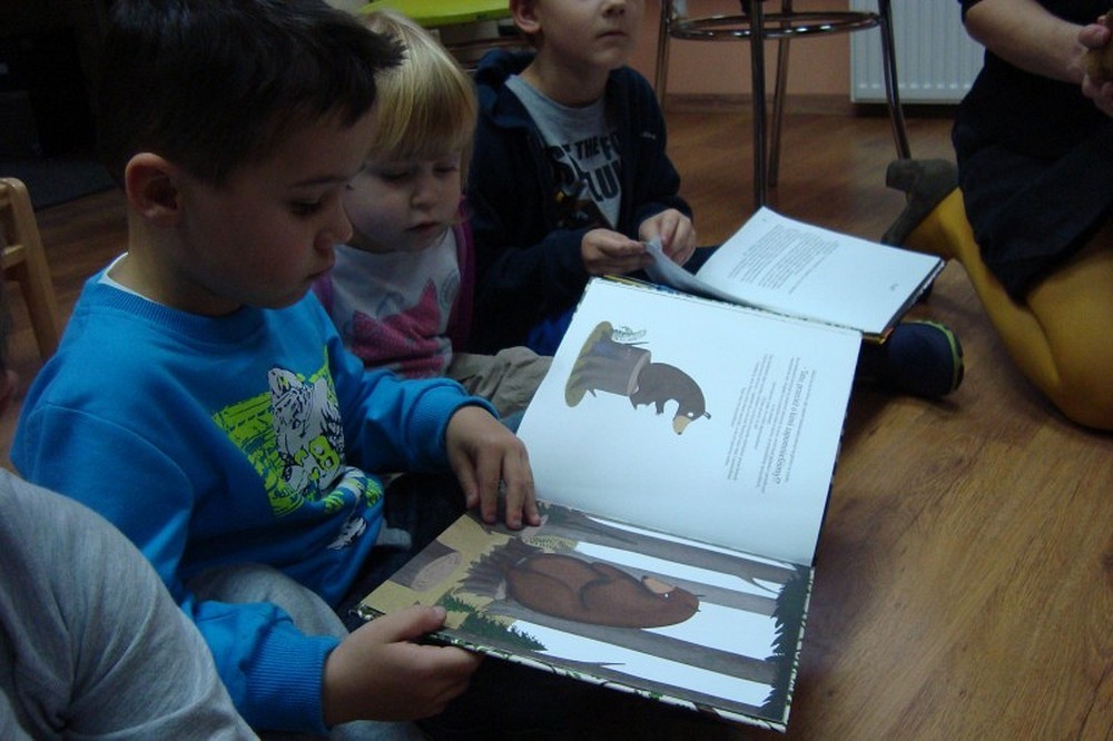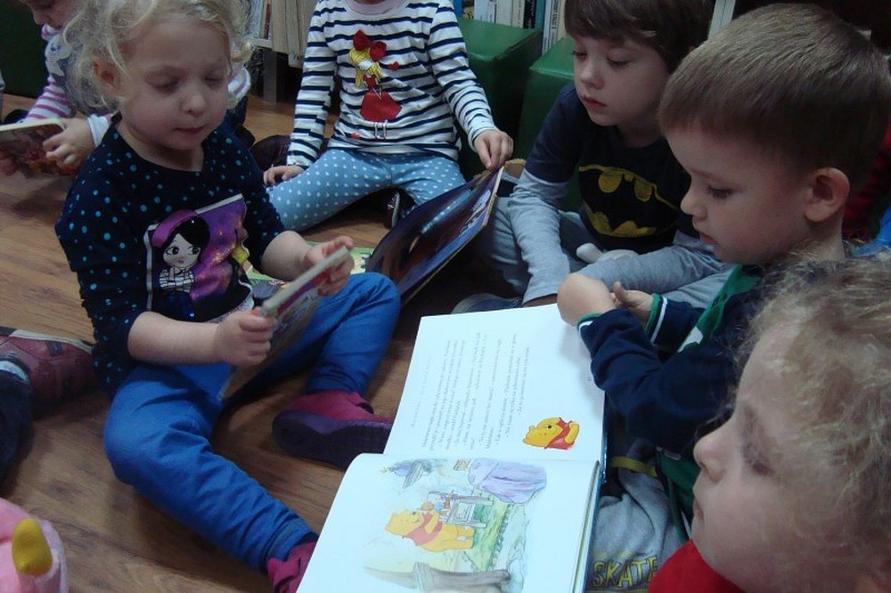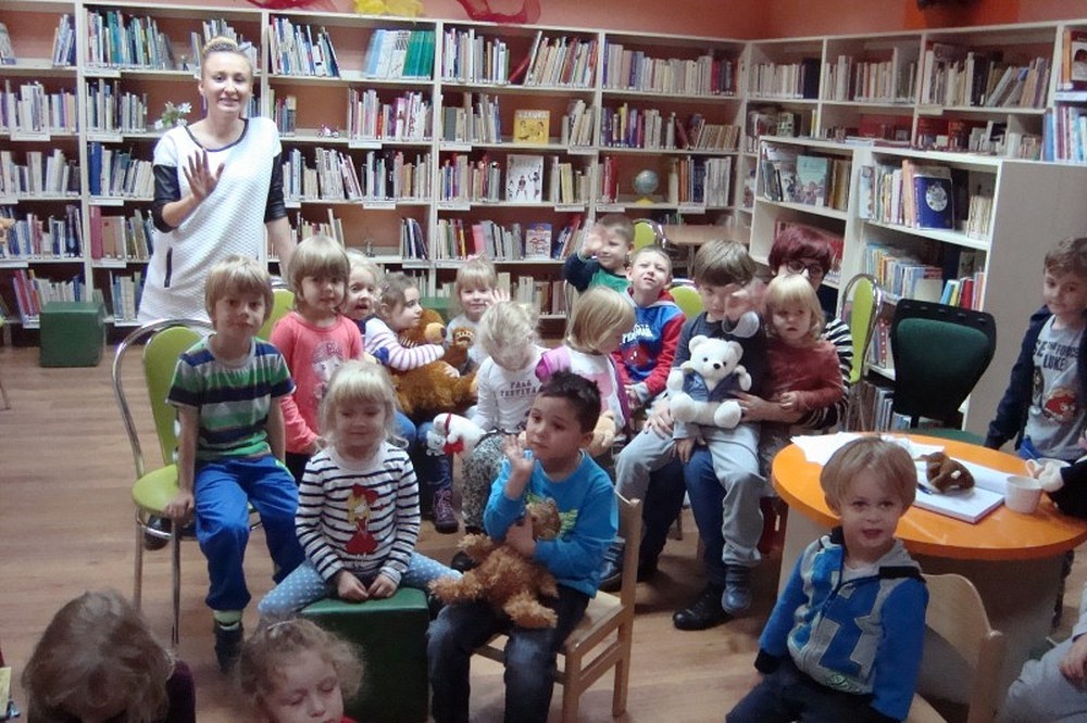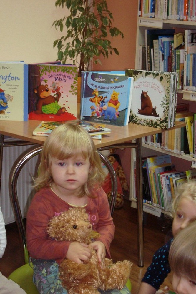 ... śmieją im się pysie... Przedszkolaki z Zaczarowanego Domku bawiły się z naszymi bibliotecznymi pluszakami, opowiadały o swoich ulubionych zabawkach i poznały książeczki o znanych pluszakach.